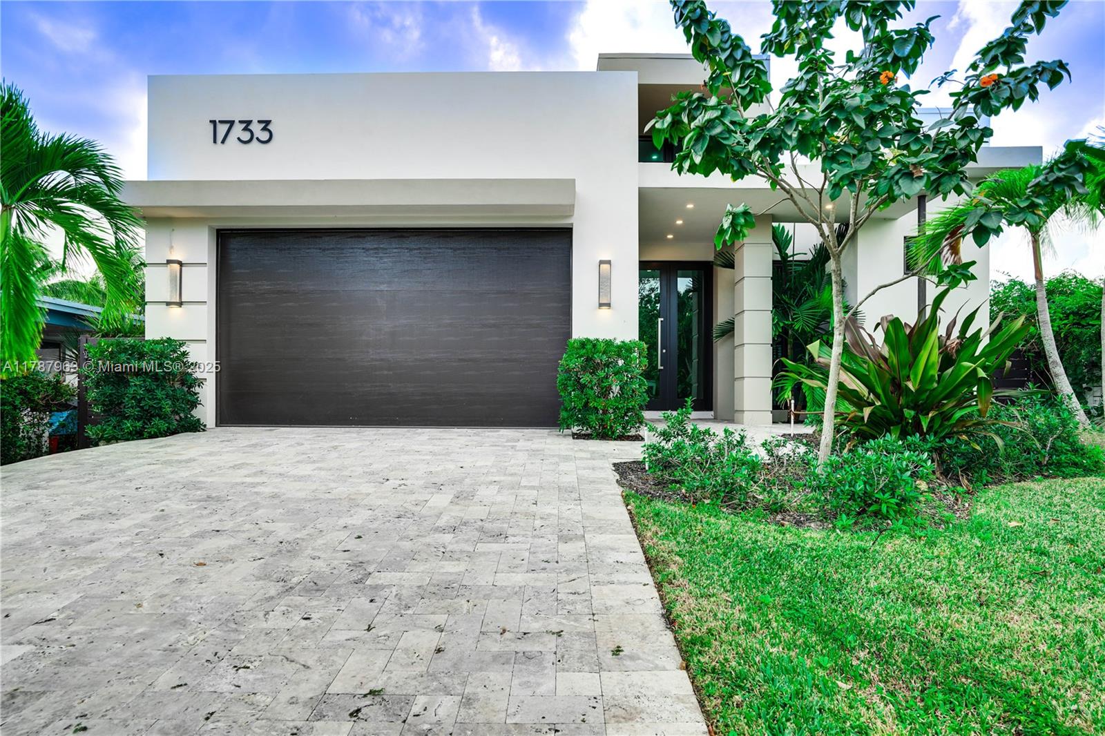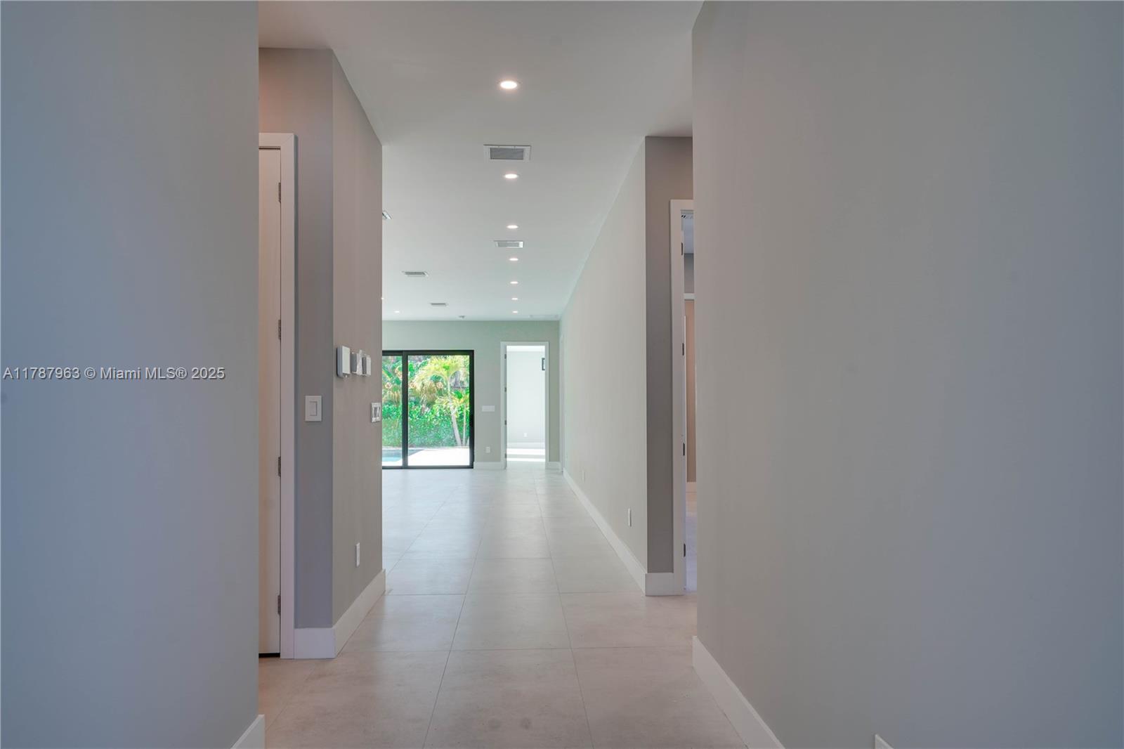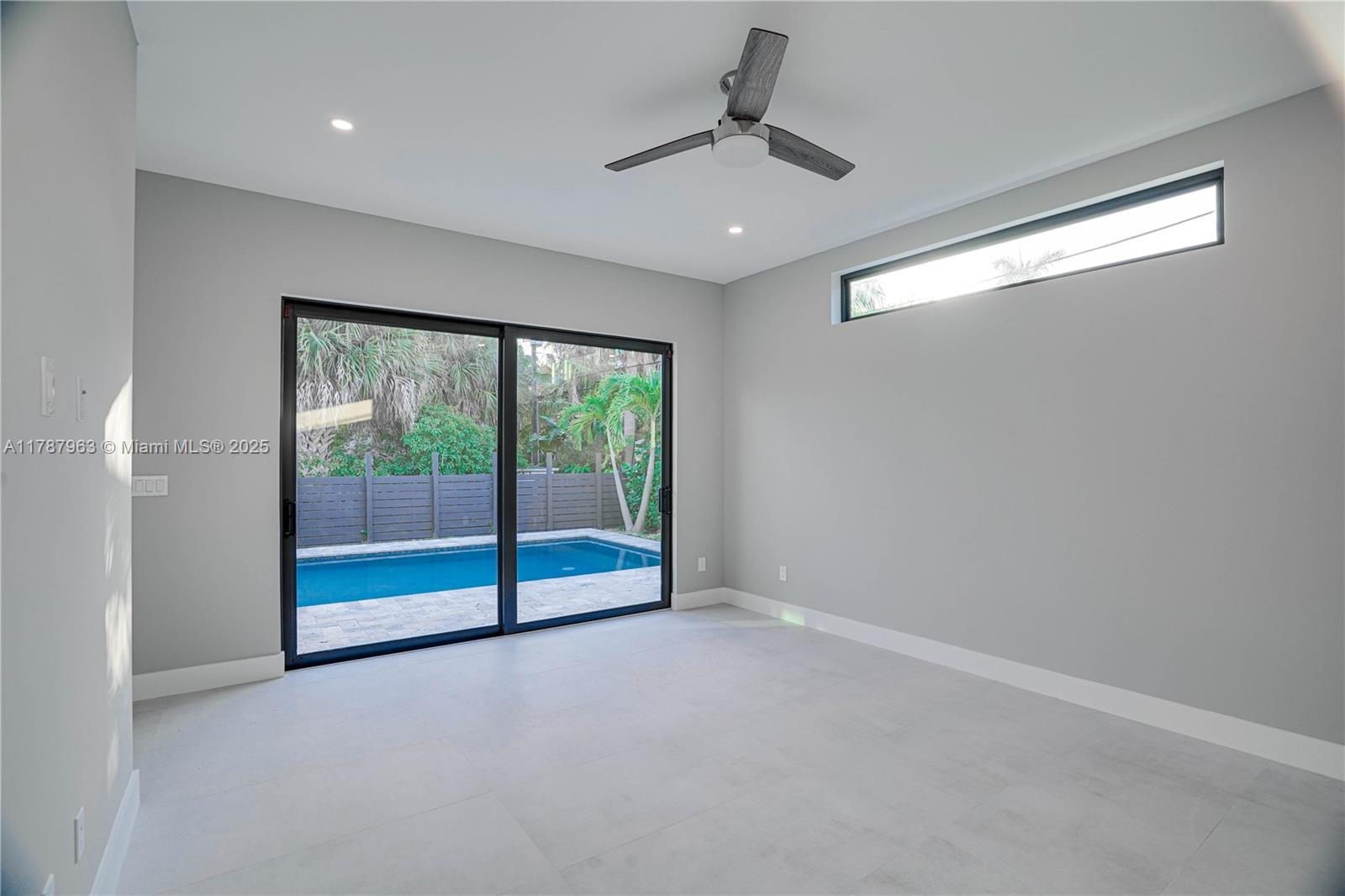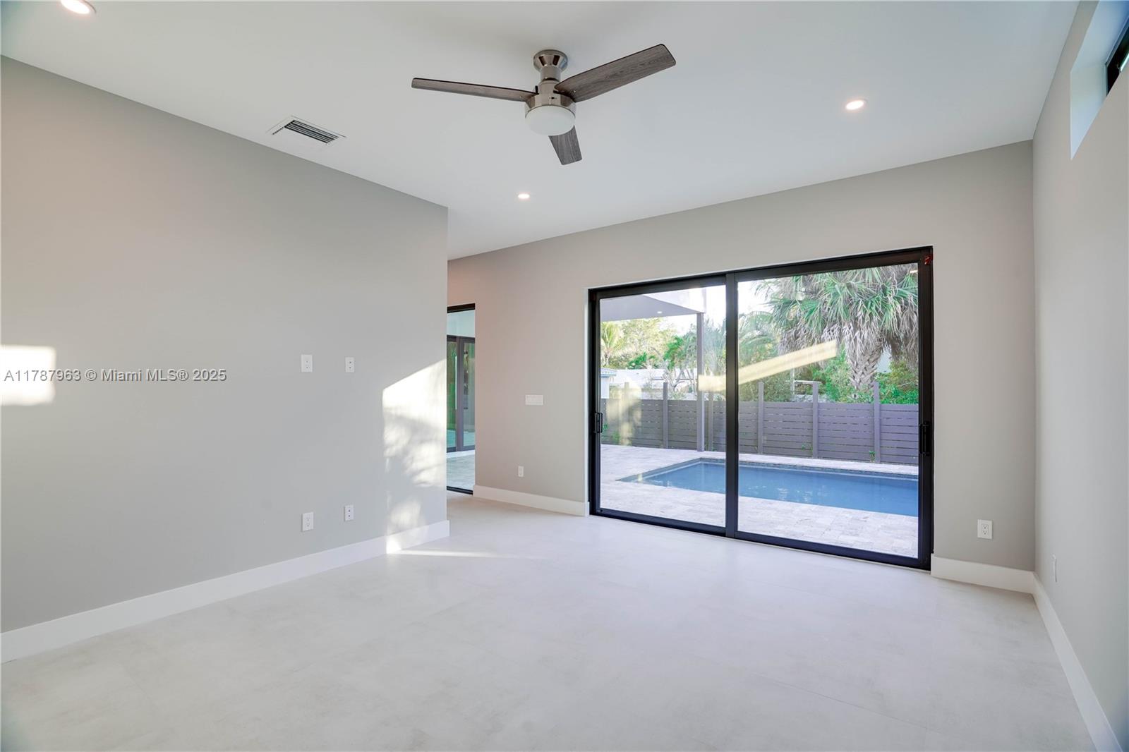 NEW CONSTRUCTION MODERN POOL HOME, immediate occupancy, one story single family residence with high end finishes, offers pure luxury and unparalleled comfort. Designed for those who appreciate both style and function, the house features 4 bdr, all within an open and airy layout, soaring 10 to 17 foot ceilings. The primary suite boasts a walk-in closet, luxurious marble 3 baths, 2 car garage with dedicated circuit for EV charger, security system. Italian kitchen cabinetry and large island. Lapitec countertops and porcelain floors, impact windows and sliding doors. Extra raised, seven foot flood elevation floor. Covered patio overlooking a saltwater pool and a beautifully landscaped garden with palms. Your opportunity to own a brand new custom built home, in a desirable neighborhood, no HOA.