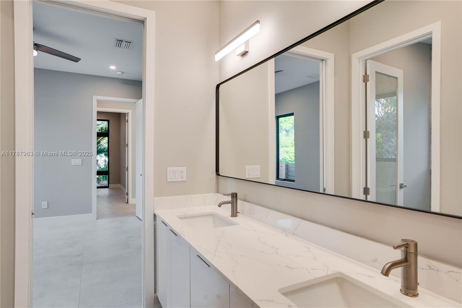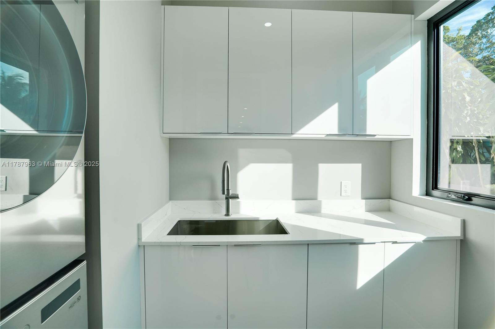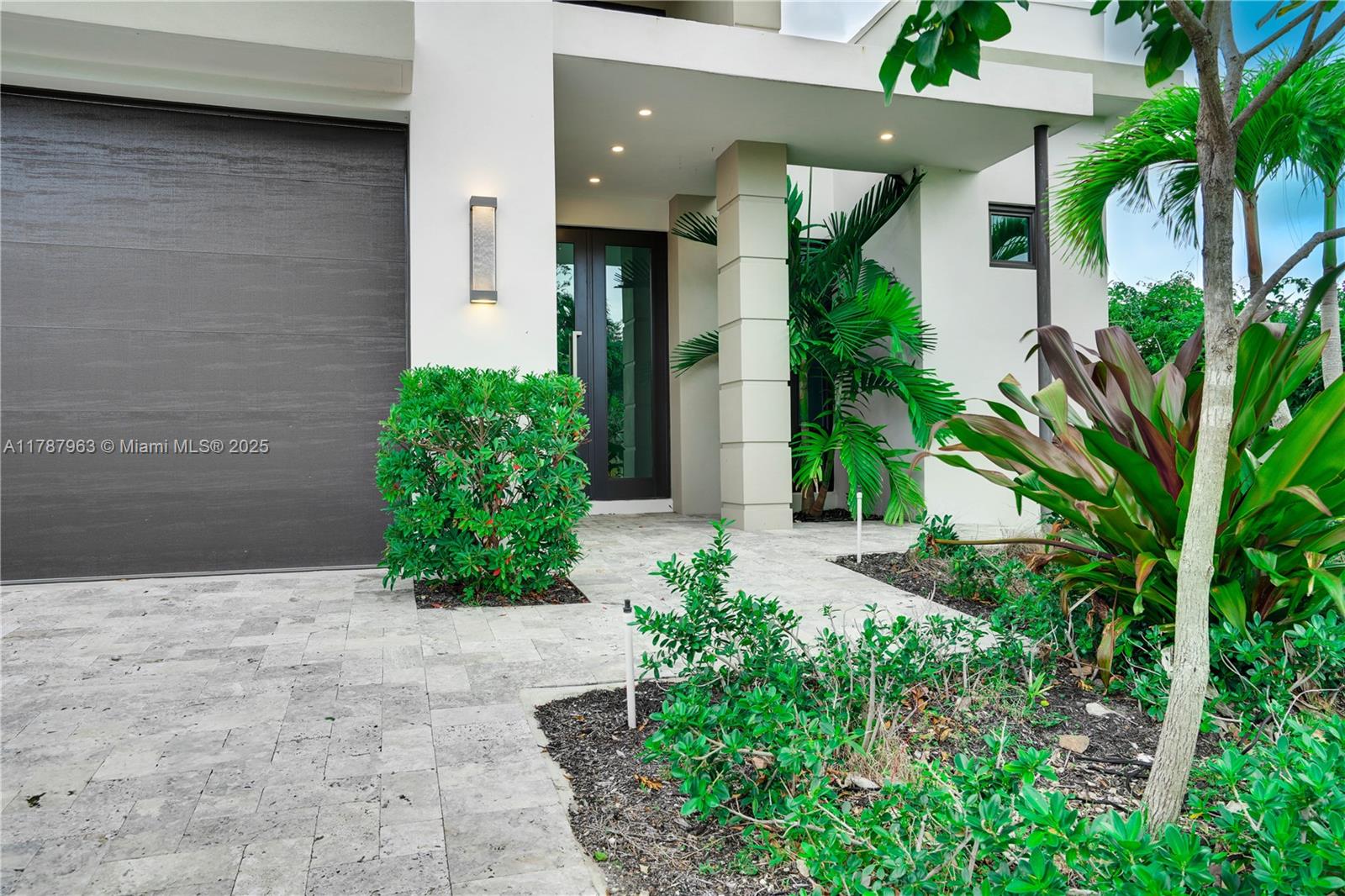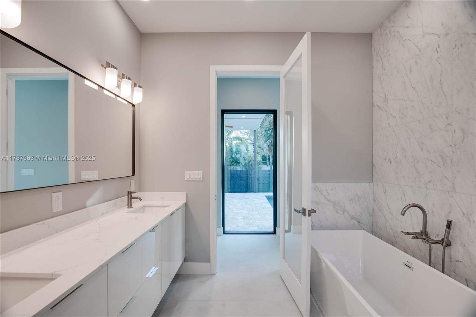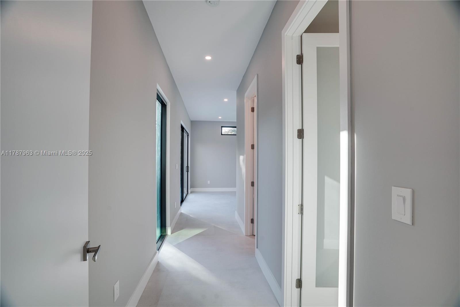 NEW CONSTRUCTION MODERN POOL HOME, immediate occupancy, one story single family residence with high end finishes, offers pure luxury and unparalleled comfort. Designed for those who appreciate both style and function, the house features 4 bdr, all within an open and airy layout, soaring 10 to 17 foot ceilings. The primary suite boasts a walk-in closet, luxurious marble 3 baths, 2 car garage with dedicated circuit for EV charger, security system. Italian kitchen cabinetry and large island. Lapitec countertops and porcelain floors, impact windows and sliding doors. Extra raised, seven foot flood elevation floor. Covered patio overlooking a saltwater pool and a beautifully landscaped garden with palms. Your opportunity to own a brand new custom built home, in a desirable neighborhood, no HOA.