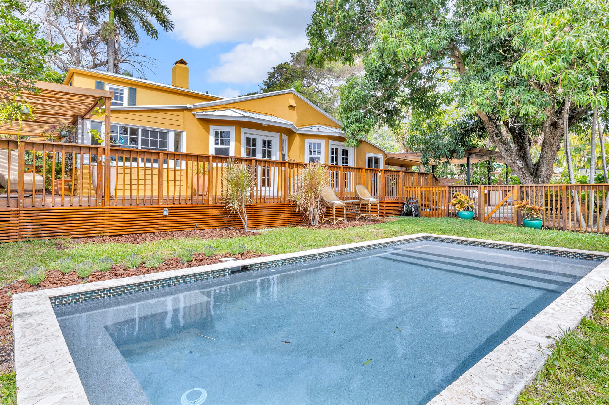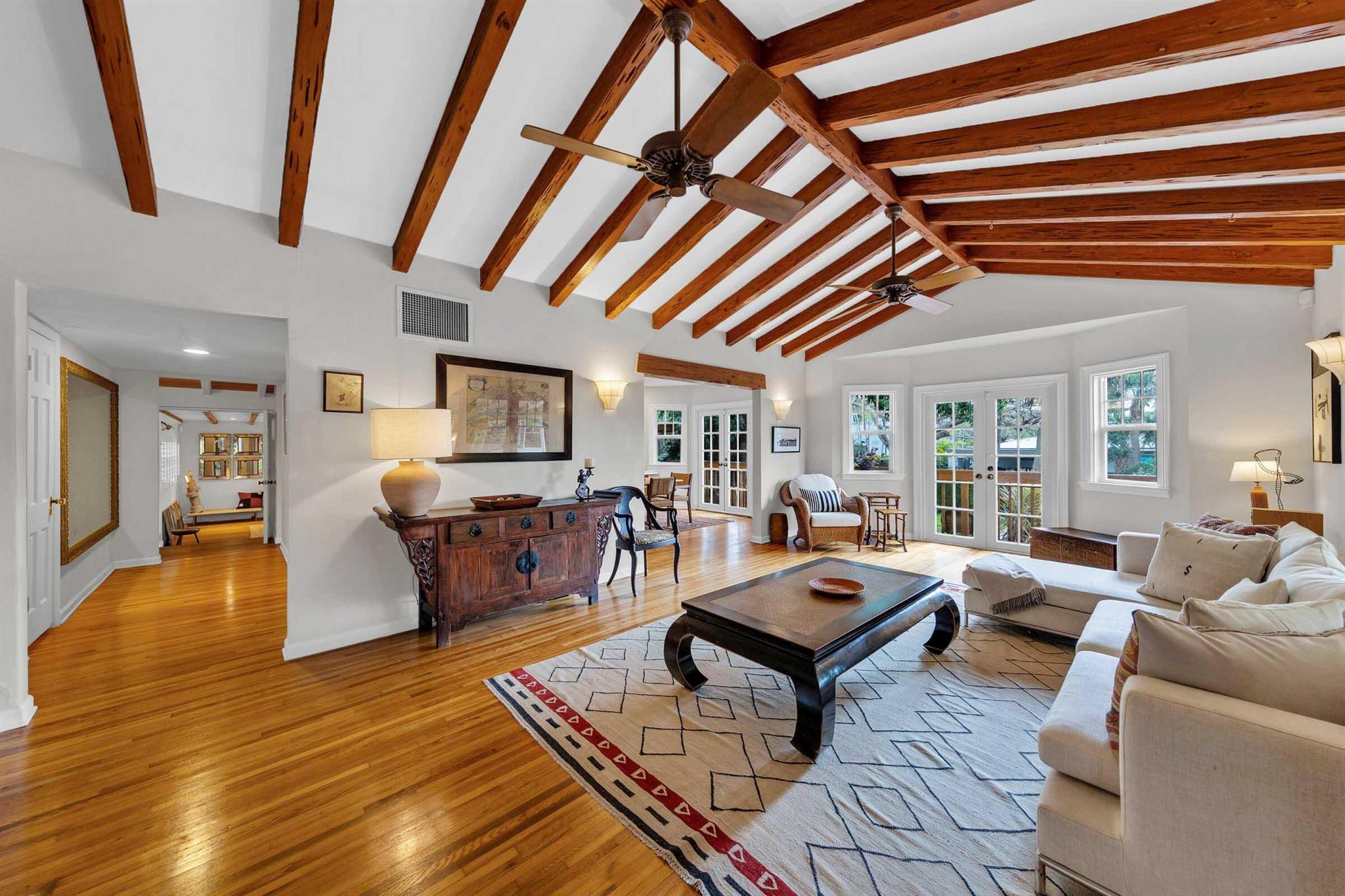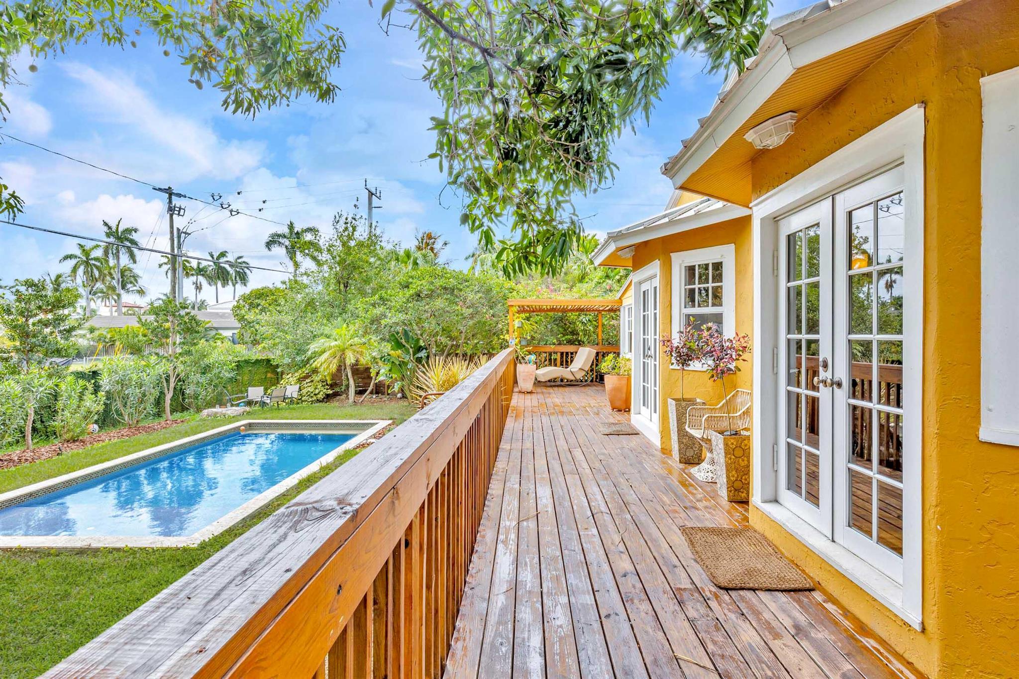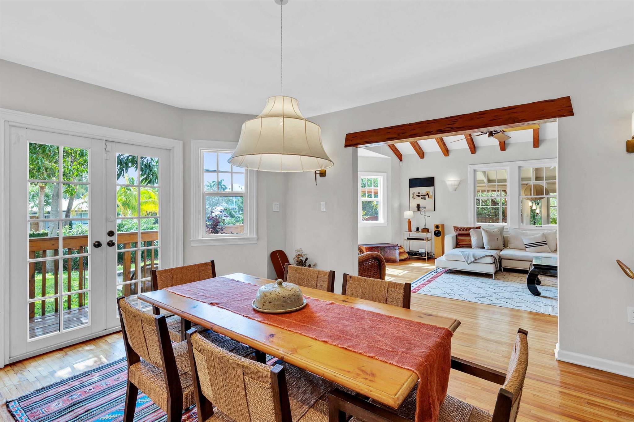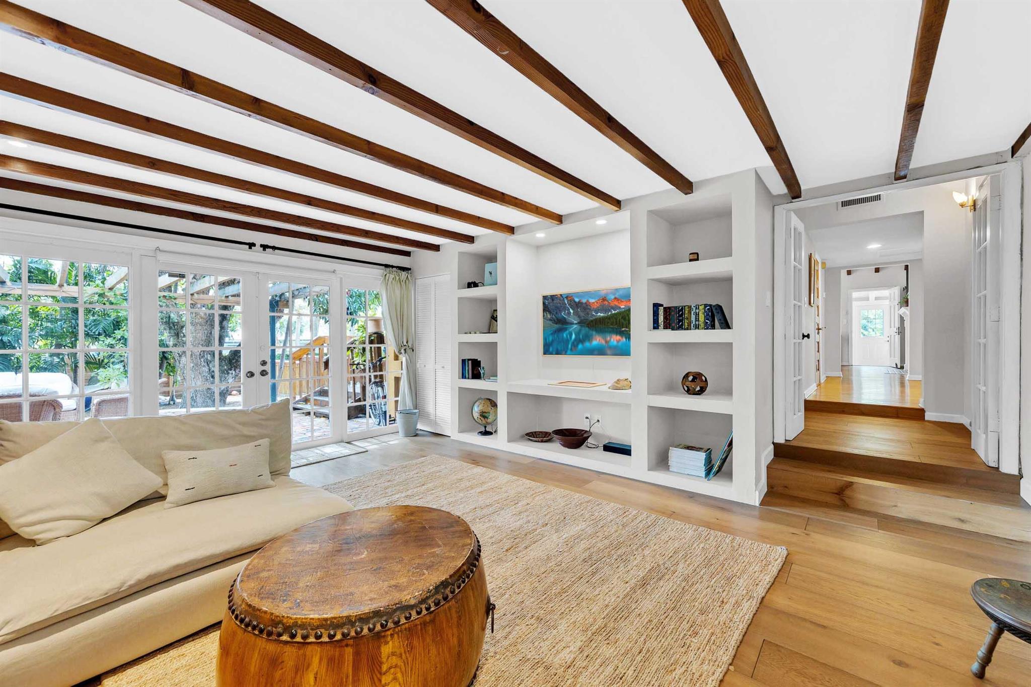 Timeless 1939 Victoria Park home on rare double lot! CBS + frame construction, rich original hardwood floors, exposed wood beam ceilings, modern chef-inspired kitchen w/Sub-Zero fridge, Wolf gas range, quartzite counters. Spacious 5 beds + 2 bonus rooms, 3.5 baths, primary suite w/luxurious bath + walk-in closet. Impact glass, metal roof, custom landscape lighting, large private pool, wraparound porches, balconies, fruit trees. Walkable to Holiday Park, playground, tennis, pickleball, dog park. Minutes to Las Olas, beaches, boat ramps. Zoned RS-8 double lot. No HOA. Elevated ridge.