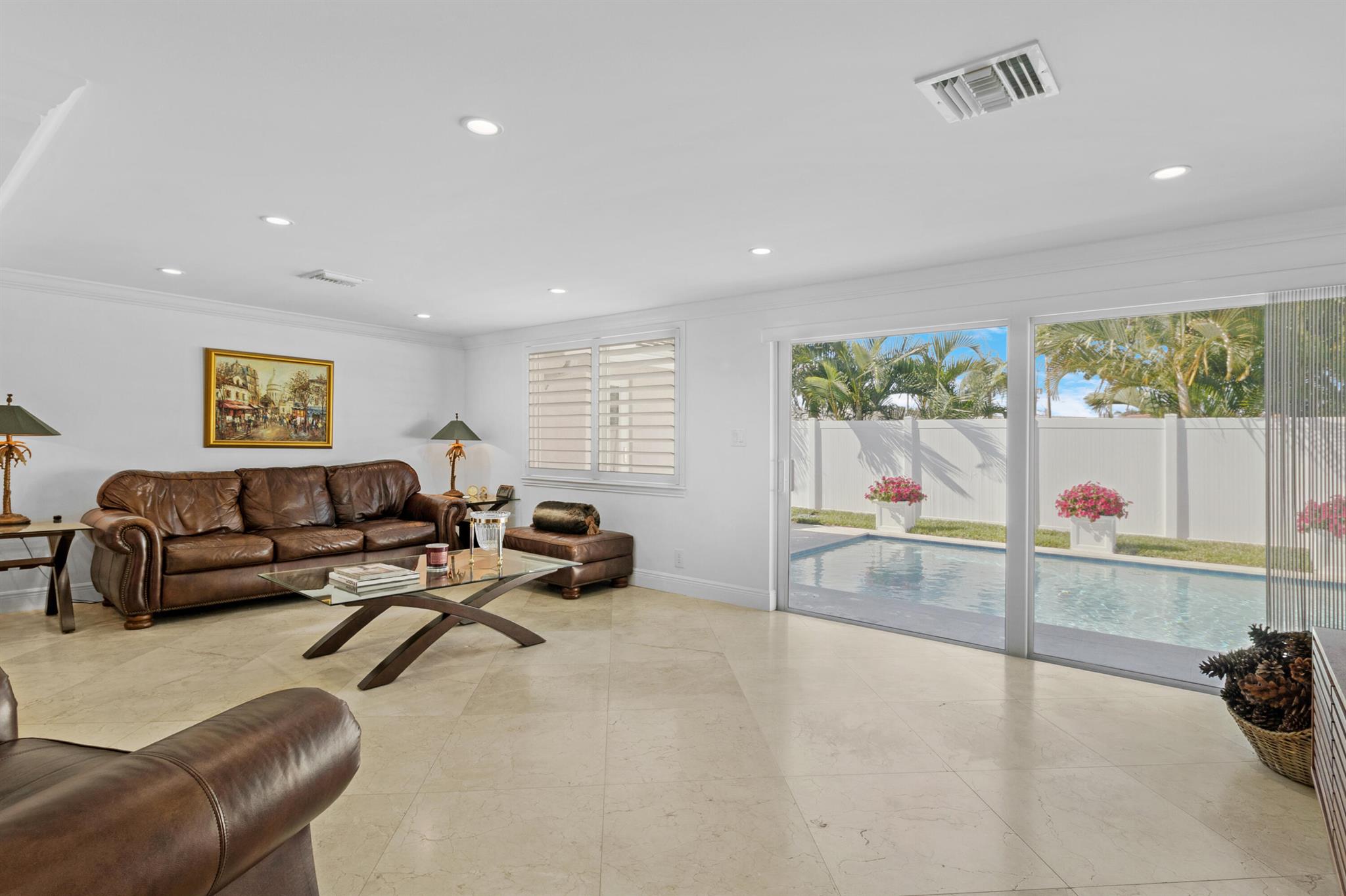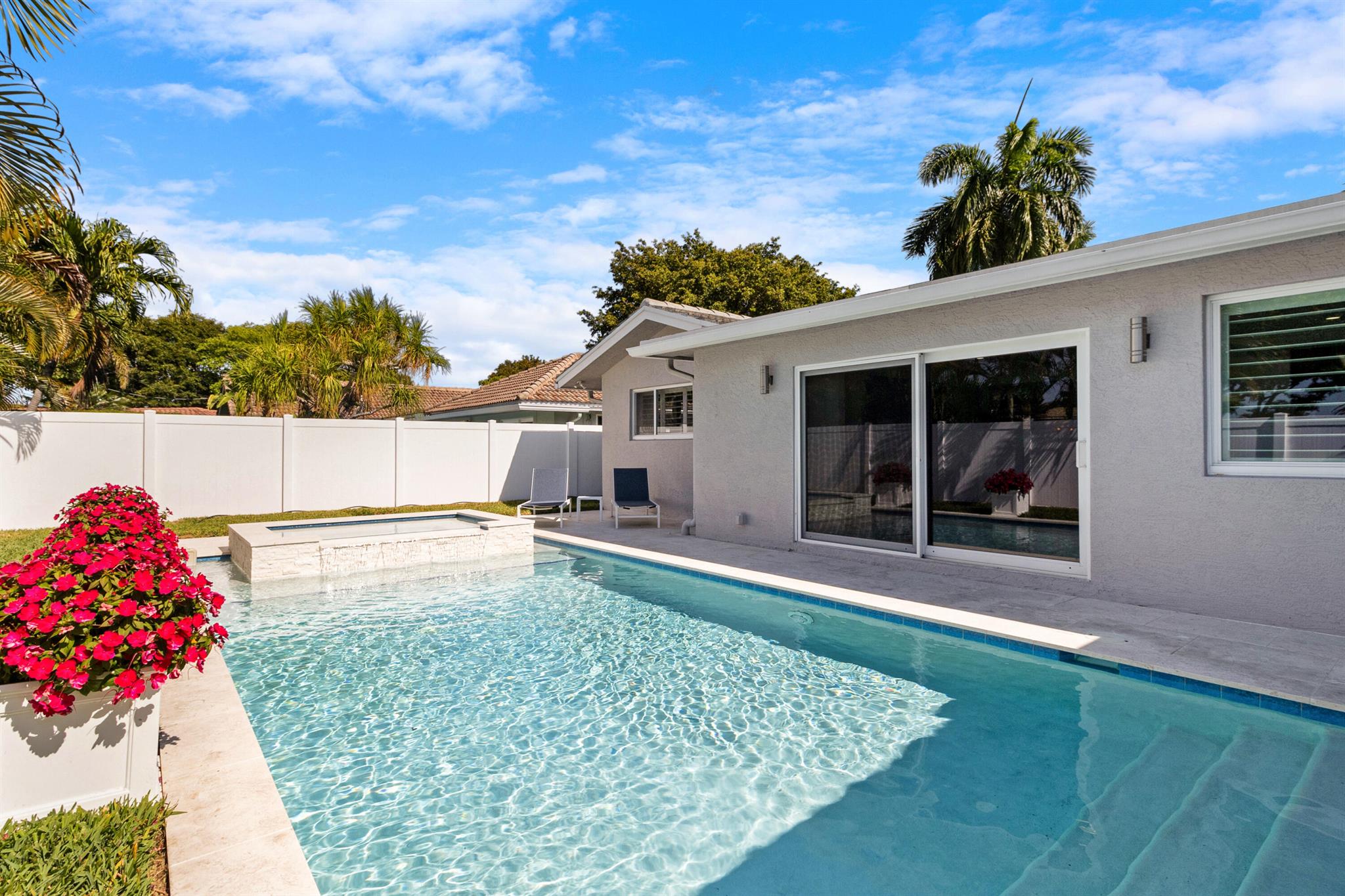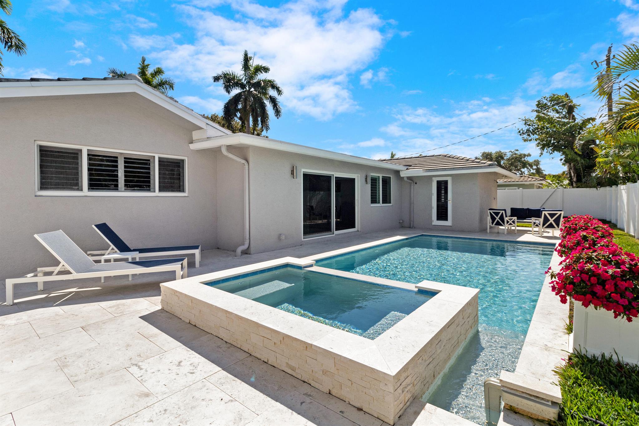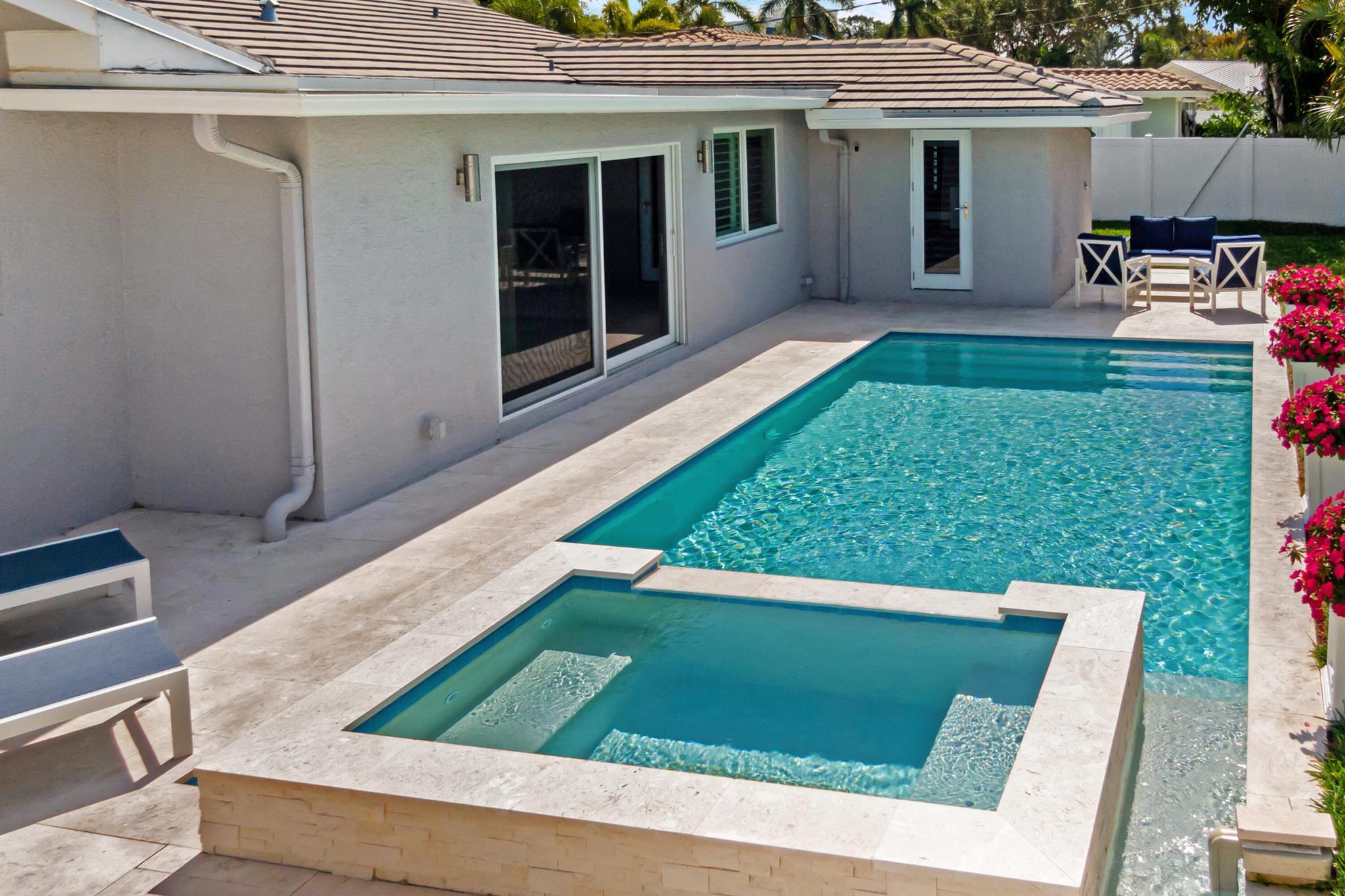 This beautifully updated 3-bedroom, 3-bathroom home features elegant eggshell white walls and 2x2 ivory travertine flooring throughout. The heated saltwater pool (13'x30') with an overflowing spa, completed in April 2024, can be controlled via smartphone. Smart home features include a garage door opener, Weho switches, and dual NEST thermostats. The two-car garage is upgraded with epoxy floors and additional storage. The home has impact-rated windows, doors, and a reinforced garage door. Plumbing was fully replaced in 2023. Location is everything. Walk to the nearby Imperial Point Park with its playground, picnic areas, walking/jogging track, and fitness trail. The neighborhood is known for its friendly atmosphere, and you'll be surrounded by top-rated schools like Westminster...