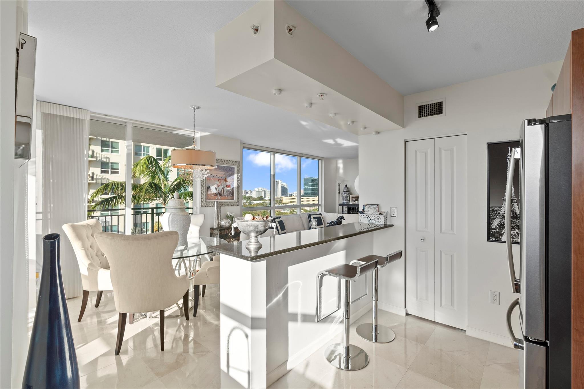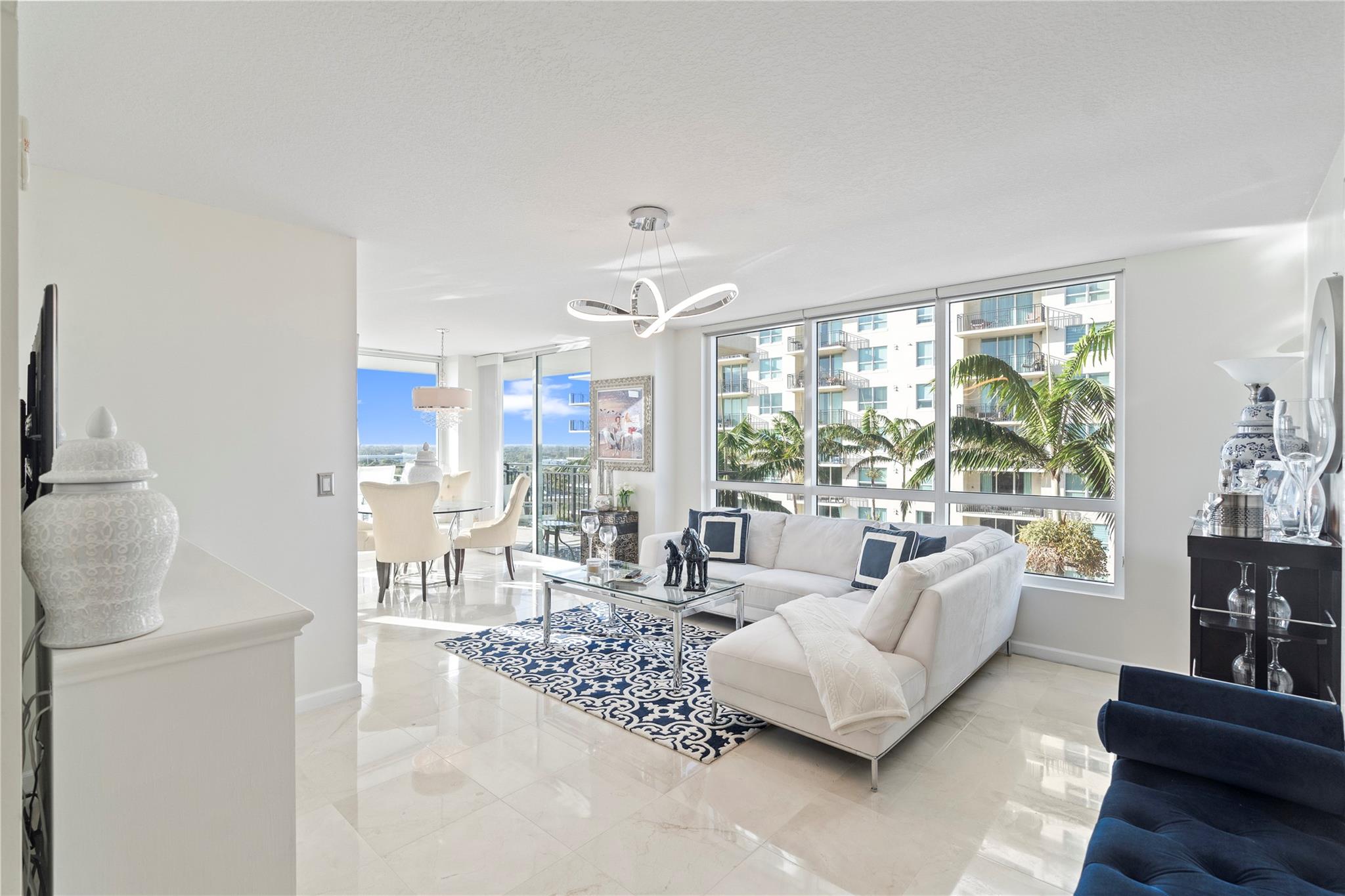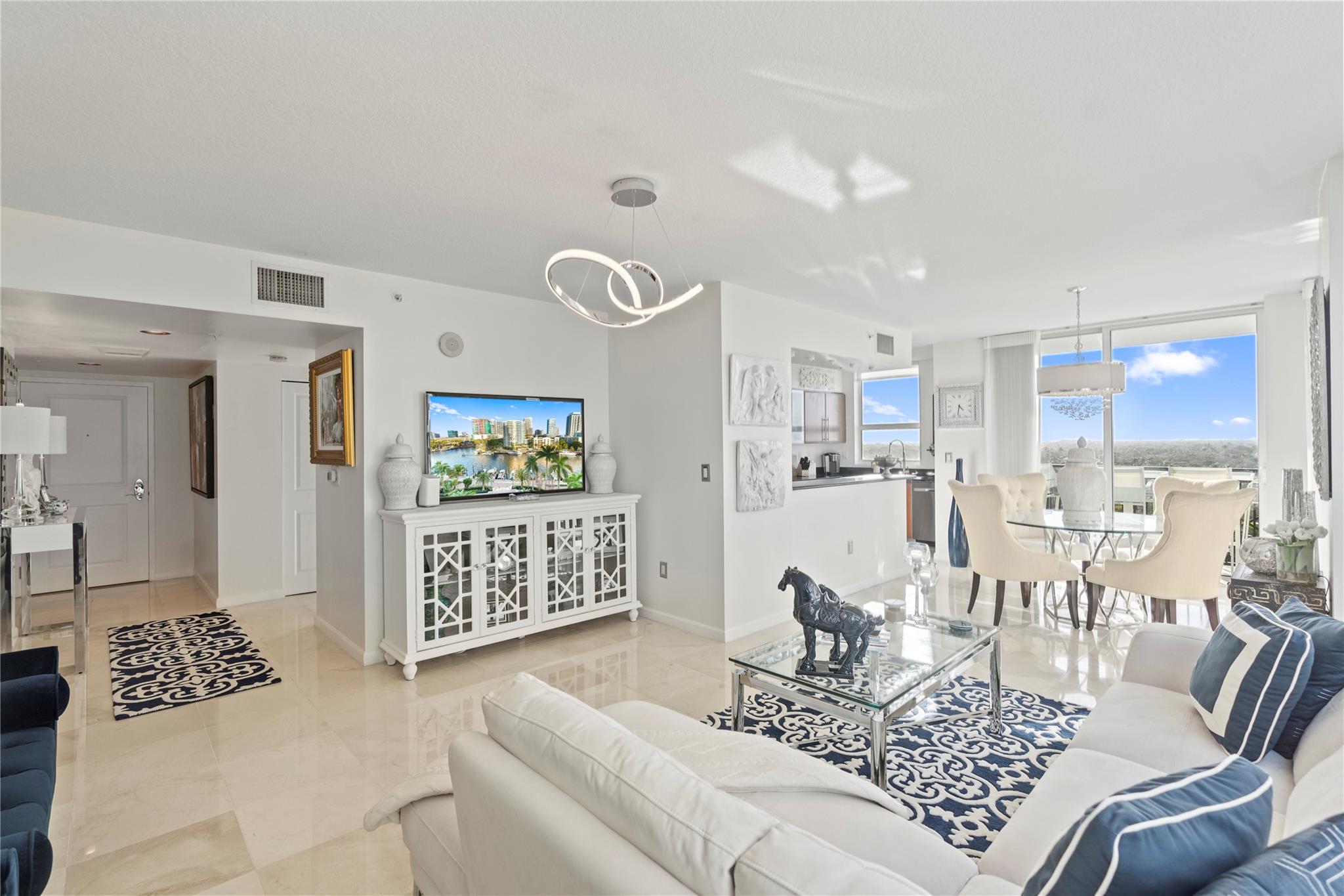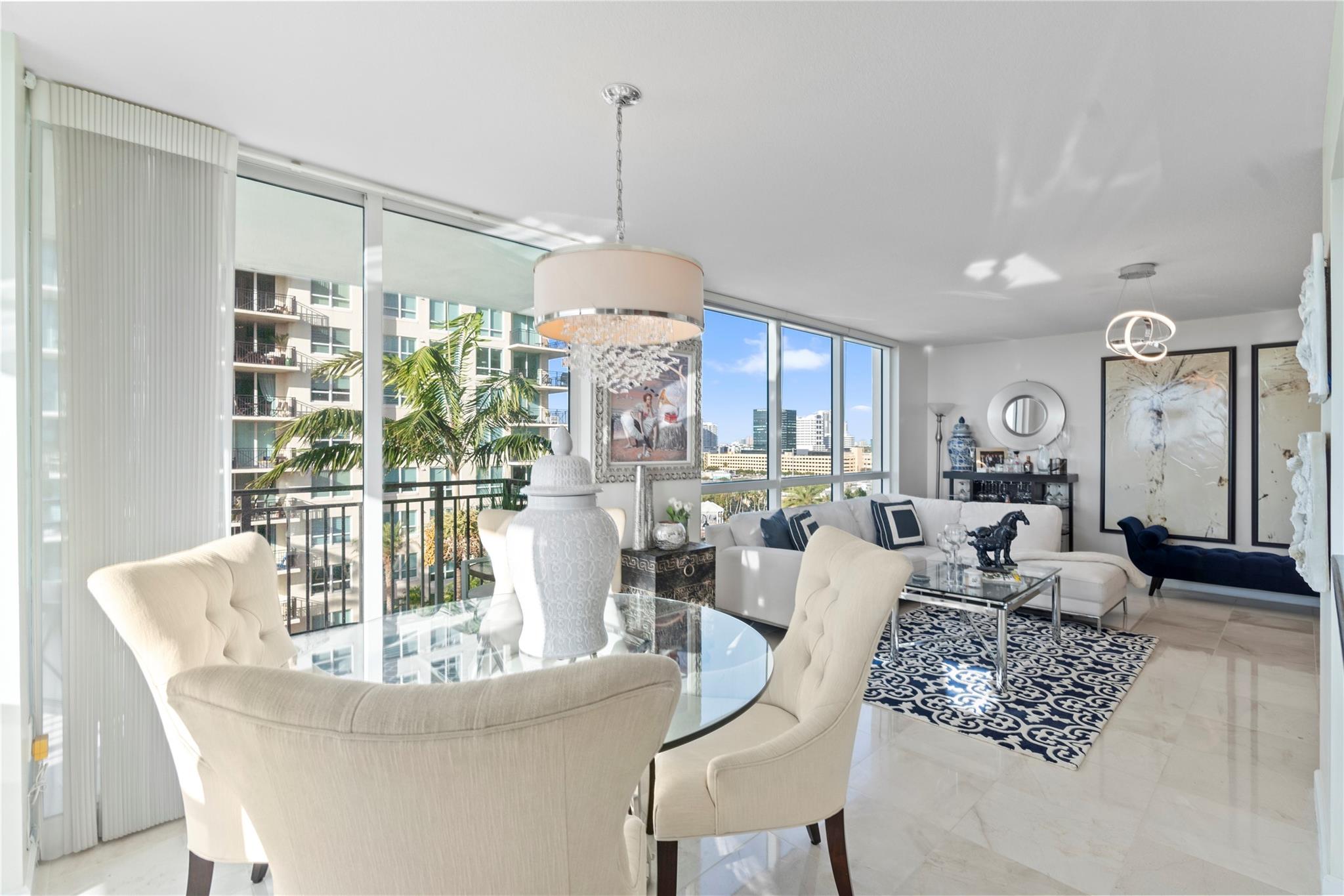 The Symphony, a premier gated, riverfront condo on the New River. SELLER MAY "CONSIDER" OWNER FINANCING. This is a turn-key residence. Open floor plan, floor-to-ceiling windows, limestone floors, motorized window treatments & balcony w/ stunning views. From formal entry through the main living area it is flooded with natural light. Well-appointed kitchen with modern SS appliances. Primary suite offers a custom closet, a spa-like bathroom w/dual vanities, soaking tub & standalone shower. The guest bedroom w/ Murphy beds & guest bathroom can serve as a private suite/office. In unit W/D. The Symphony is dog friendly w/park, state of the art gym overlooking the river, heated pool & hot tub, salon, spa & business center. Walk along the Riverwalk for fine dining & shopping along Las Olas Blvd.