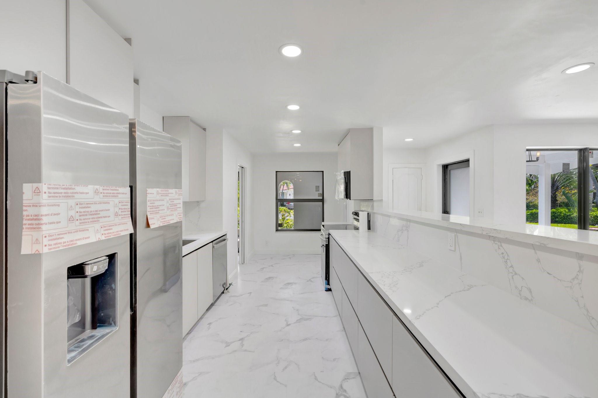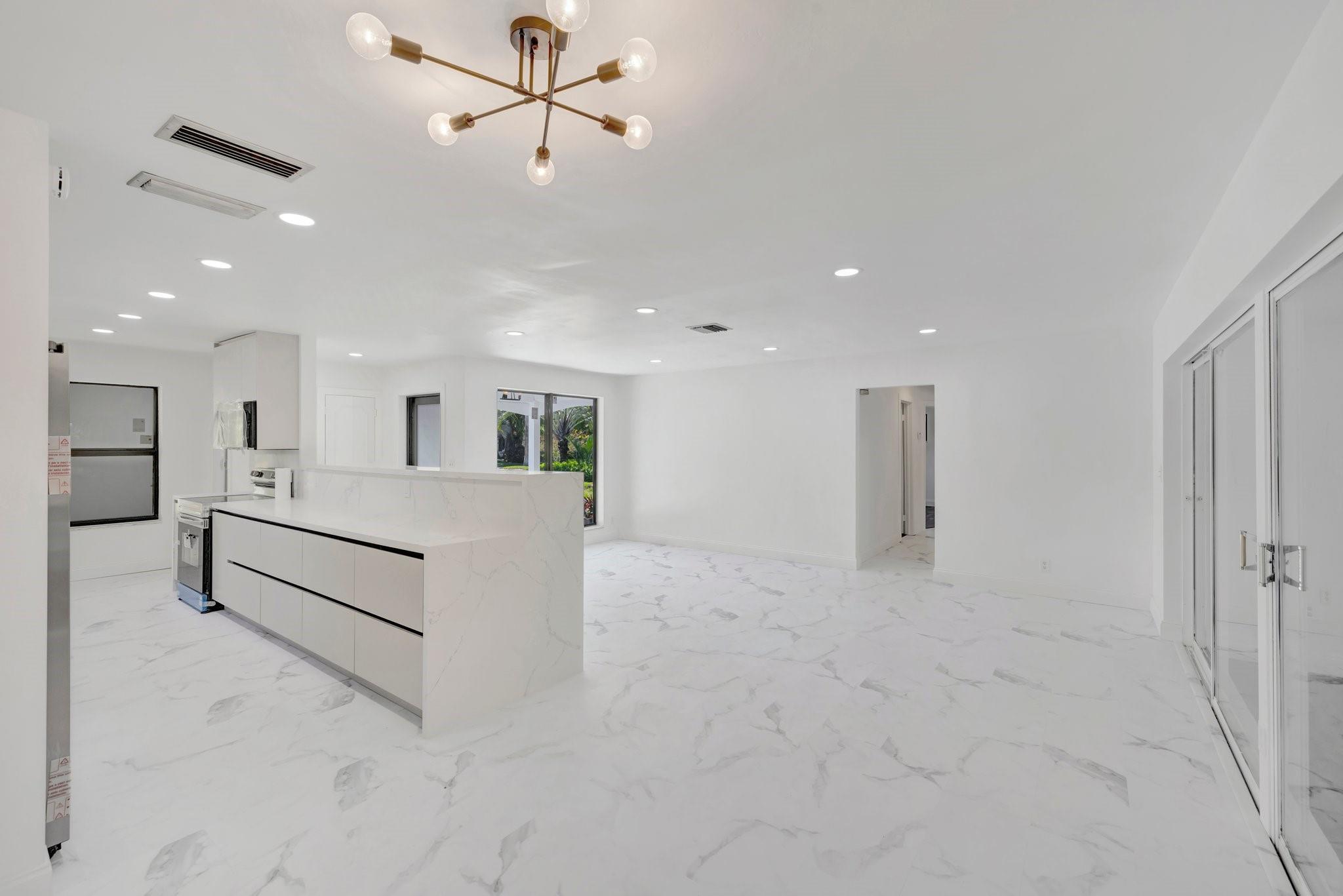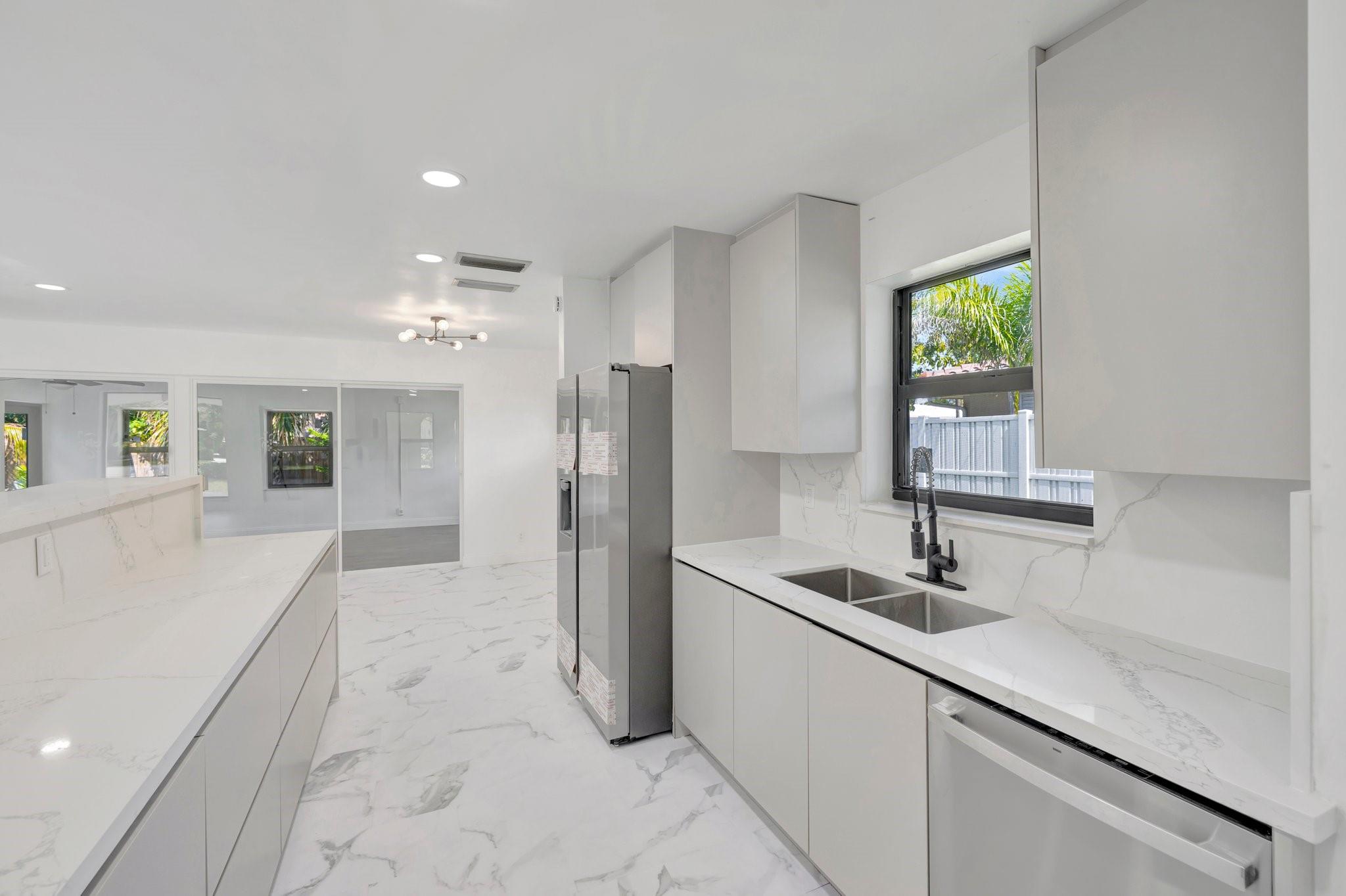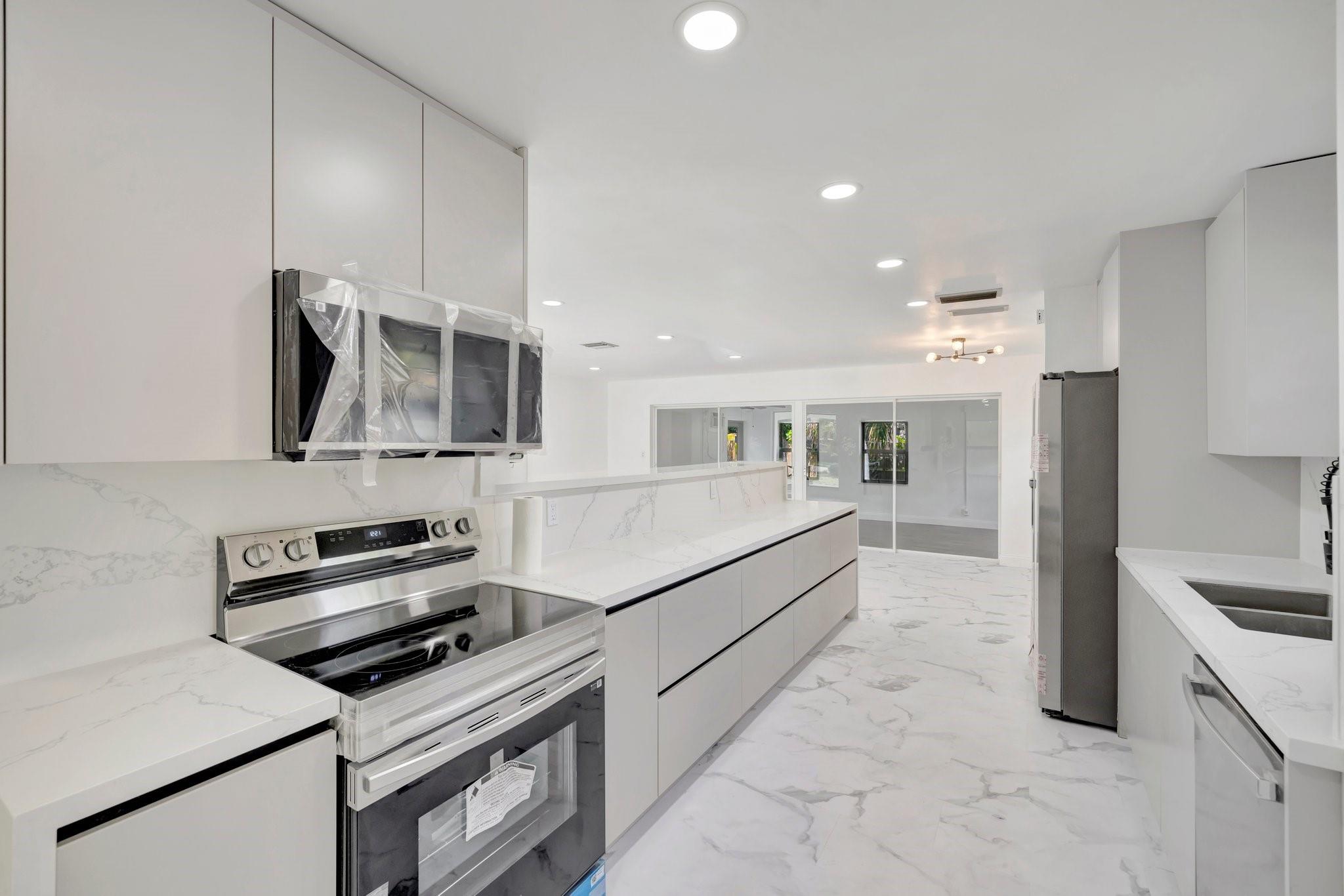 Beautifully remodeled home features new kitchen with Calacatta quartz counter tops, breakfast bar, new appliances and cabinets. New bathrooms with glass enclosed showers. New roof. New impact windows. Waterproof flooring in enclosed sunroom. Bedrooms with ceiling fans. New baseboards and light fixtures. Recessed lighting throughout. Covered front porch. Fenced back yard with concrete patio and wading pool. Storage Shed. Mango tree. Sprinkler system. Lots more! Don't miss it!