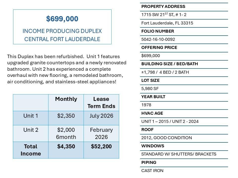 This Duplex has been refurbished. Unit 1 features upgraded granite countertops and a newly renovated bathroom. Unit 2 has experienced a complete overhaul with new flooring, a remodeled bathroom, air conditioning, and stainless-steel appliances! Unit 1 is currently owner-occupied, while Unit 2 generates a monthly income of $2,800. Ideally situated near I-95/SR84/Turnpike, it is just minutes from Fort Lauderdale International Airport, making commuting throughout South Florida easy. It takes 7 minutes to reach Las Olas, 9 minutes to downtown Fort Lauderdale & 12 minutes to the beach! All essential amenities are located within a 3-mile radius, including Whole Foods, Publix, a new Aldi, and Walmart, among others. Fantastic dining: YOT, Boatyard, Southport Raw Bar, 15th St Fisheries, Tap 42!