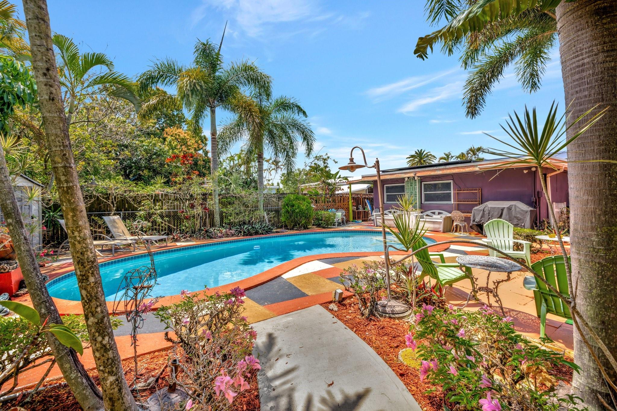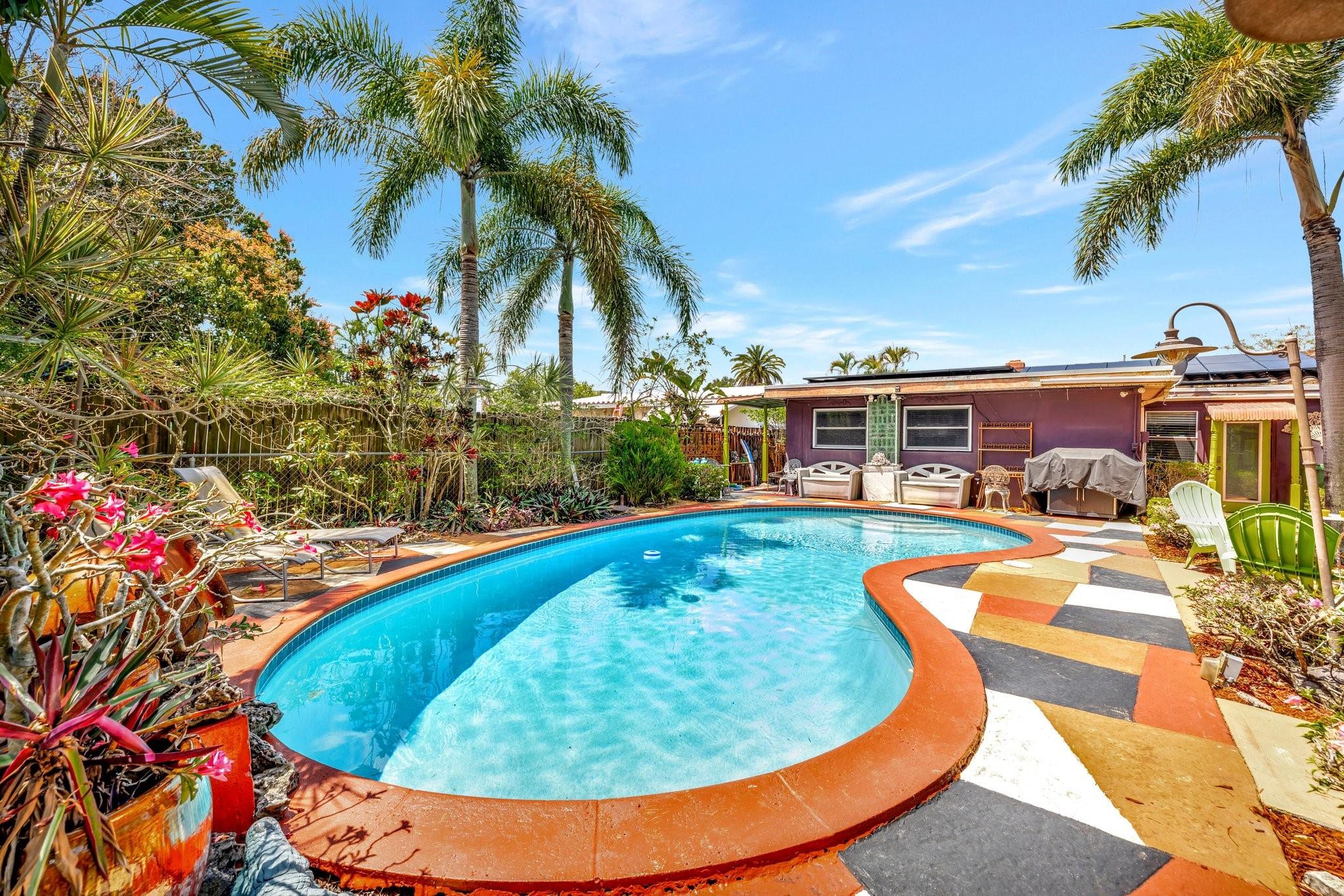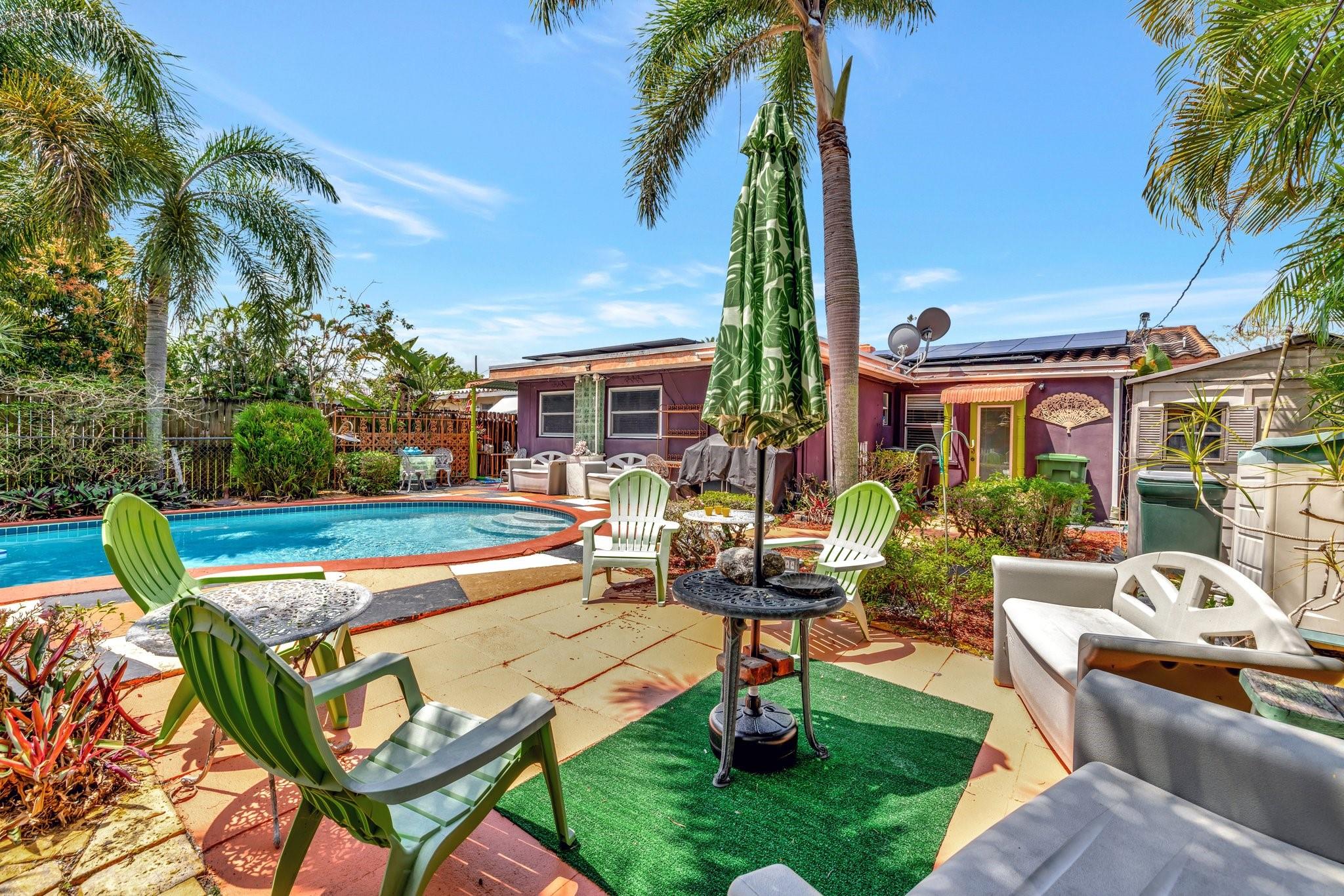 PRICED BELOW APPRAISED VALUE (3/5/2025) OF $700,000. Fantastic opportunity in sought-after Poinsettia Heights! This duplex is perfect for living in one unit and renting the other, with residential multifamily, low-rise, medium-density zoning. Walk to Wilton Manors, bike to the beach, and enjoy nearby shopping and dining. Pool is approx 10 feet deep city won’t allow new pools to be that deep these days. Updates include full PVC plumbing to the street, on-demand electric water heater, (2023) solar system, new rear flat roof, attic insulation (2021). Saltwater pool with Diamond Brite finish (2015). Impact windows/doors, closed-in back porch, front addition, and barrel tile roof (2007). 4 exterior storage sheds 1 with electric & AC Ready for your personal touches!
