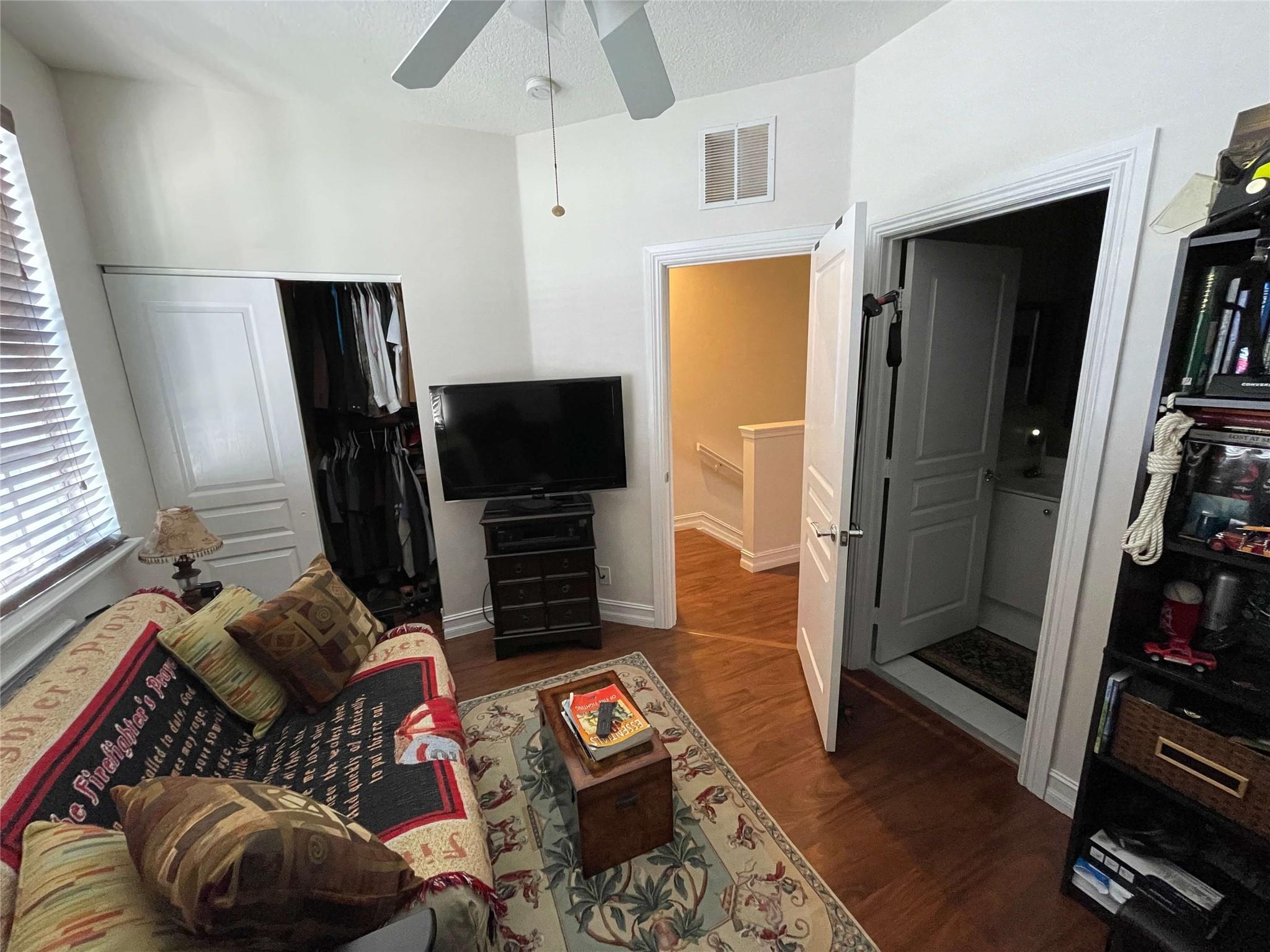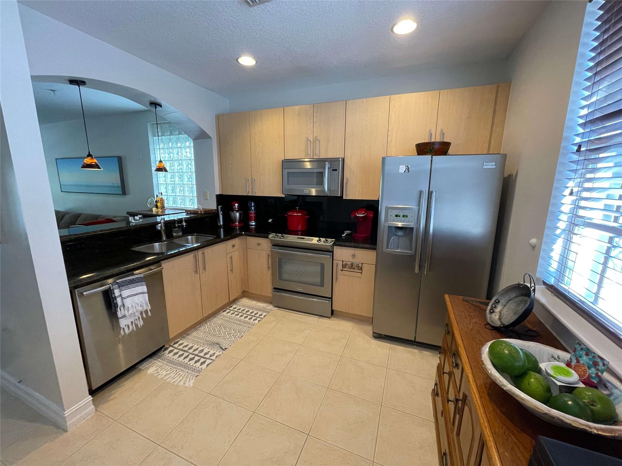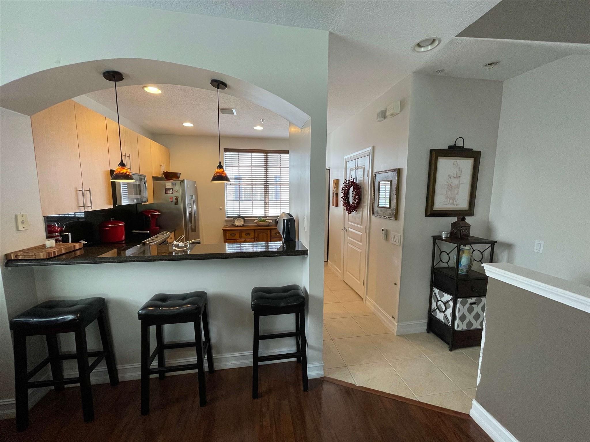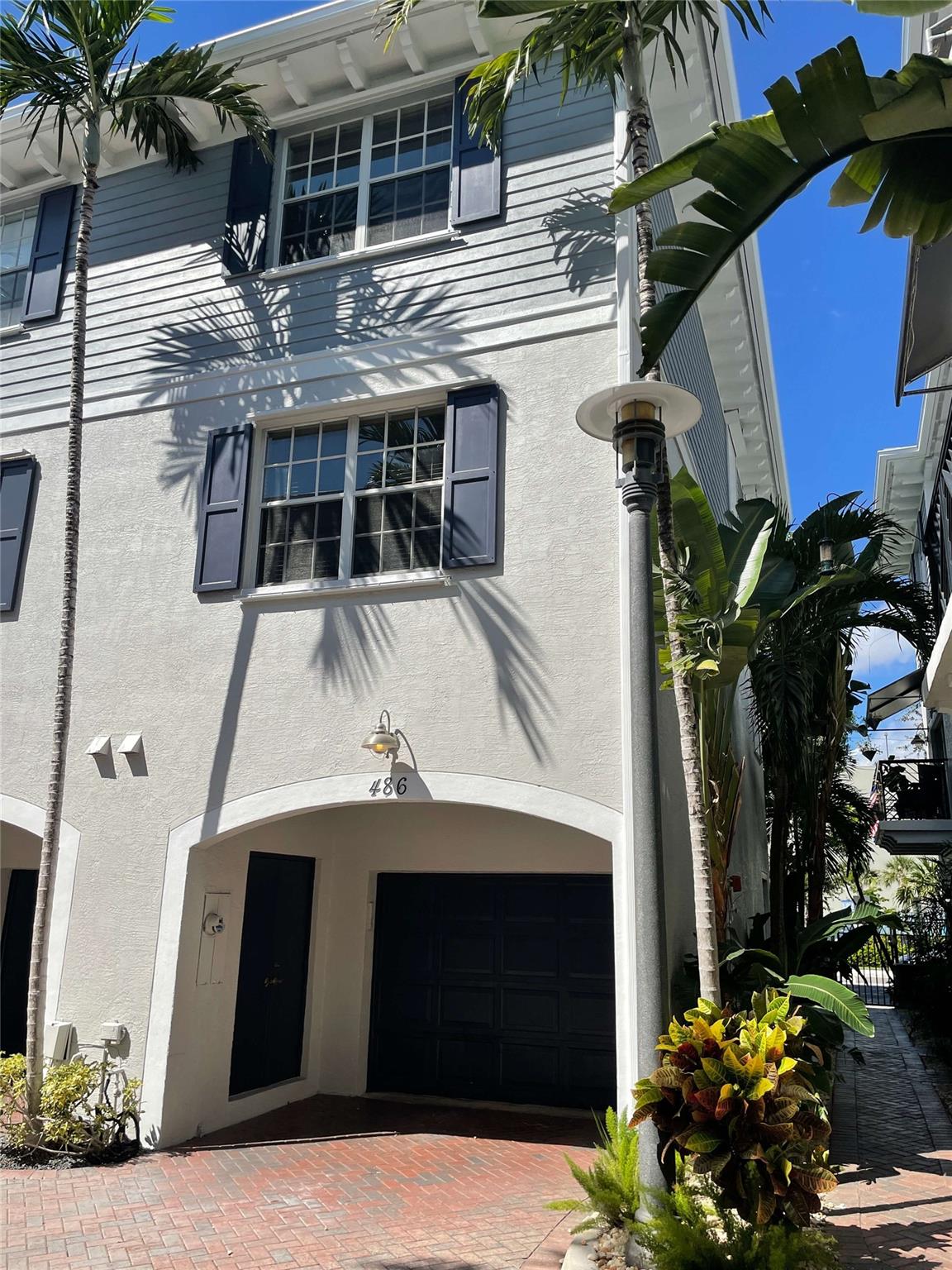 Discover this updated tri-level corner townhouse in the coveted East Village—a gated, boutique community in the heart of downtown. Recently refreshed with a stunning exterior makeover featuring new paint, landscaping, lighting, plus a paved pool and BBQ area, this home exudes modern style at every turn. Ground Level: Enter a spacious den with elegant tile flooring for a welcoming entry or versatile living space. Second Level: Enjoy an open-plan living area where the kitchen dazzles with granite counters, wood cabinetry, and stainless steel appliances. Third Level: Retreat to private bedrooms with ample closet space; the master suite offers a walk-in closet and frameless shower, while the second bedroom features its own private bath and built-in closet.