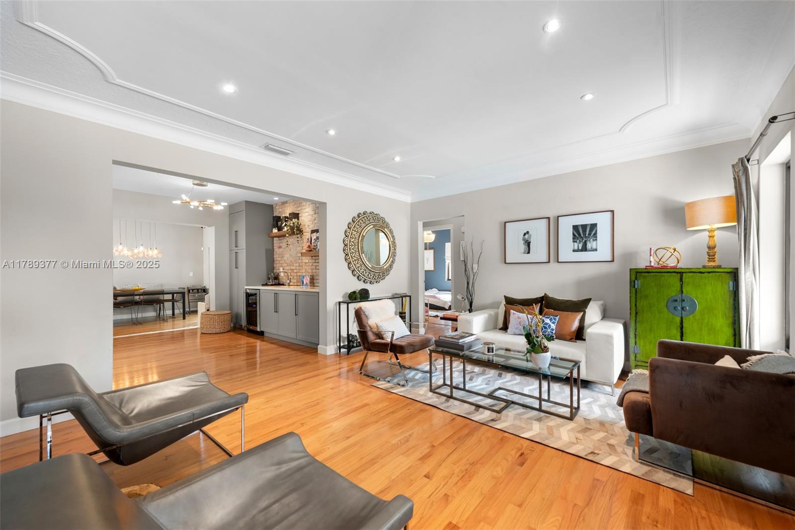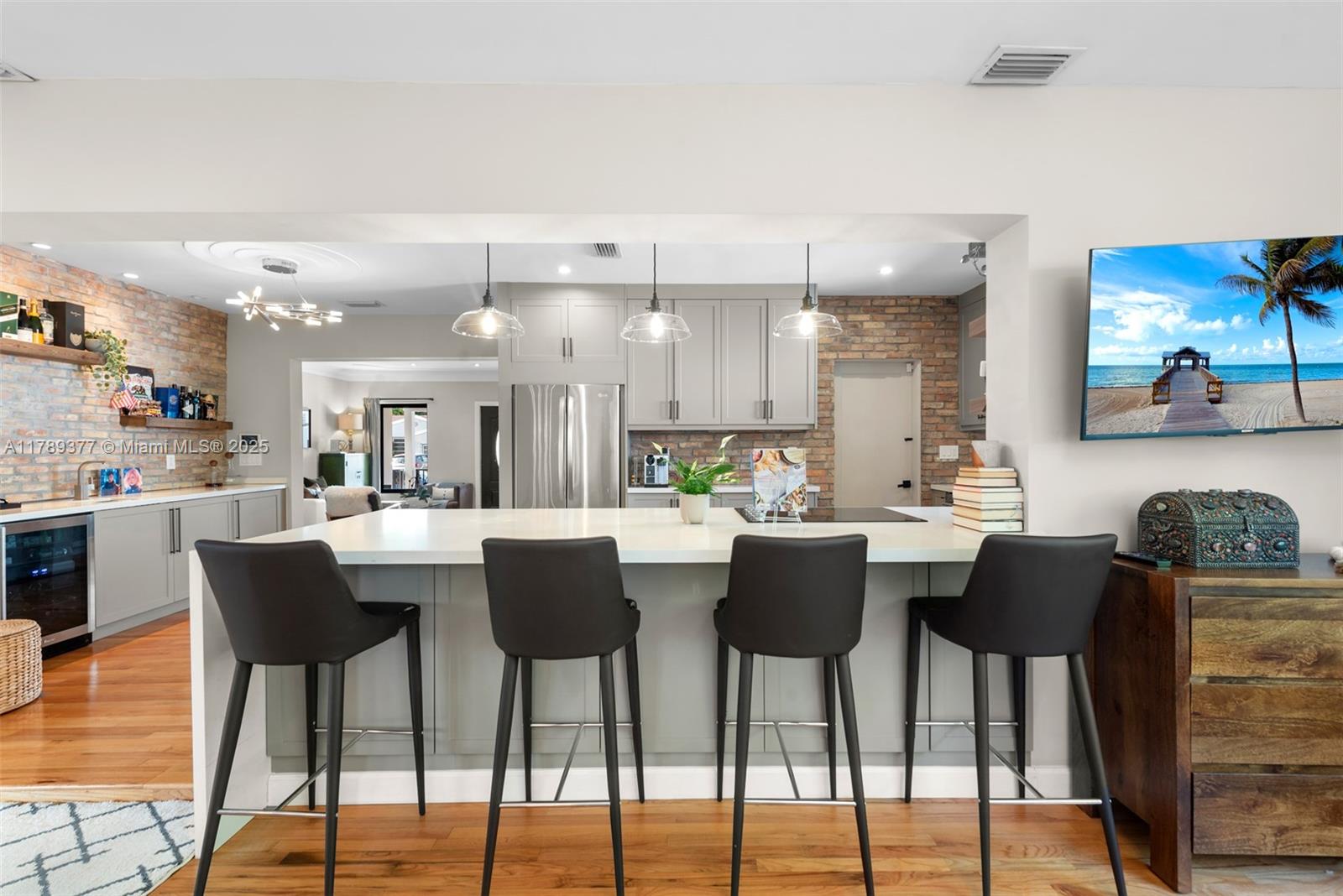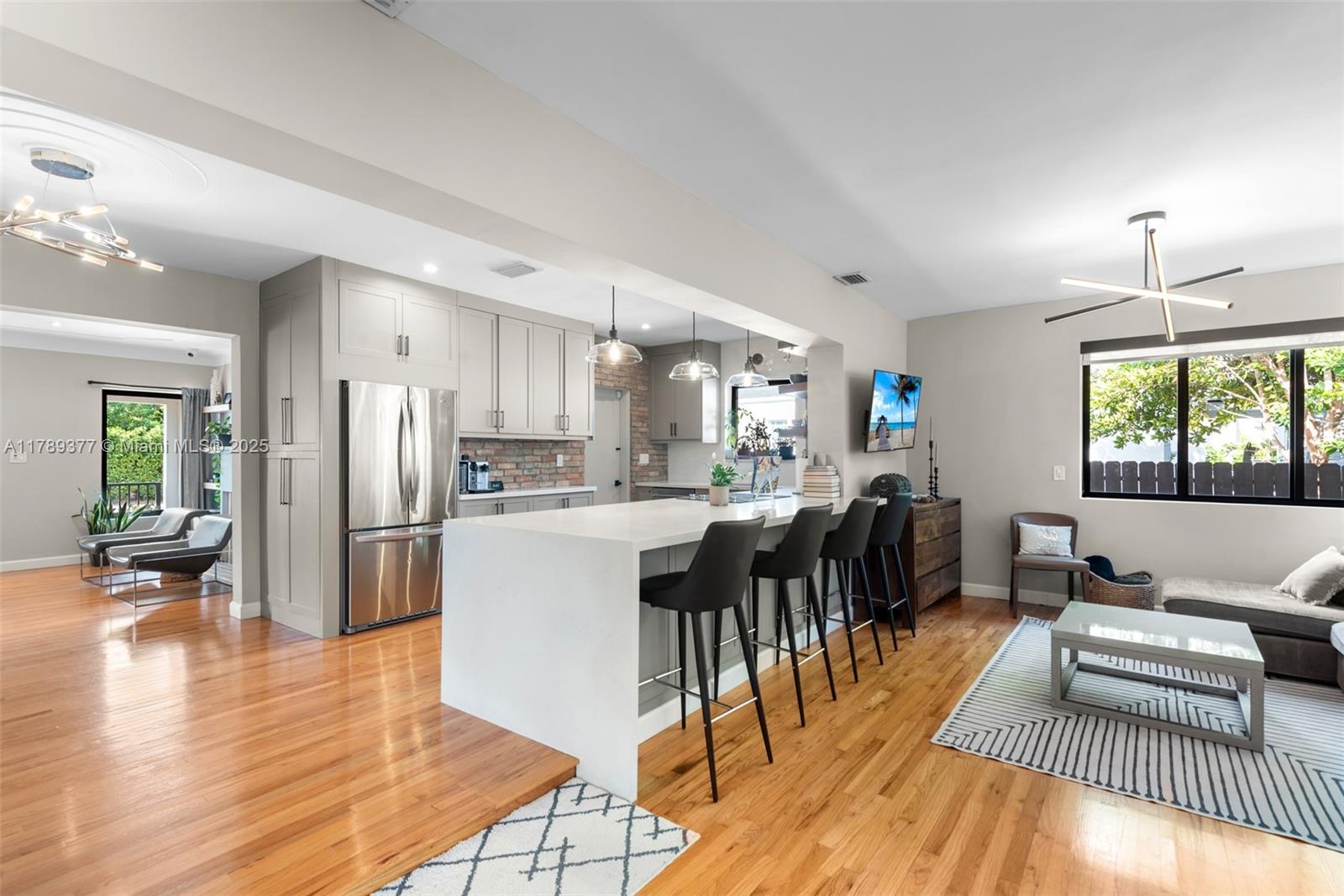 This charming house combines modern design with timeless appeal. The home offers 1,907 sqft of inviting living space, including four bedrooms—one used as a cozy studio and walk-in closet. The kitchen features quartz countertops, KitchenAid appliances, and a built-in wine fridge. Relax by the wood-burning fireplace, enjoy impact glass windows, and beautiful hardwood floors. The bar area, accented with Chicago brick, provides extra storage. Bathrooms are fully tiled, including a front bath with a Kohler tub. Additional highlights include a security camera system and a crawl space. The exterior boasts a covered patio and landscaped yard. Don’t miss this wonderful opportunity!