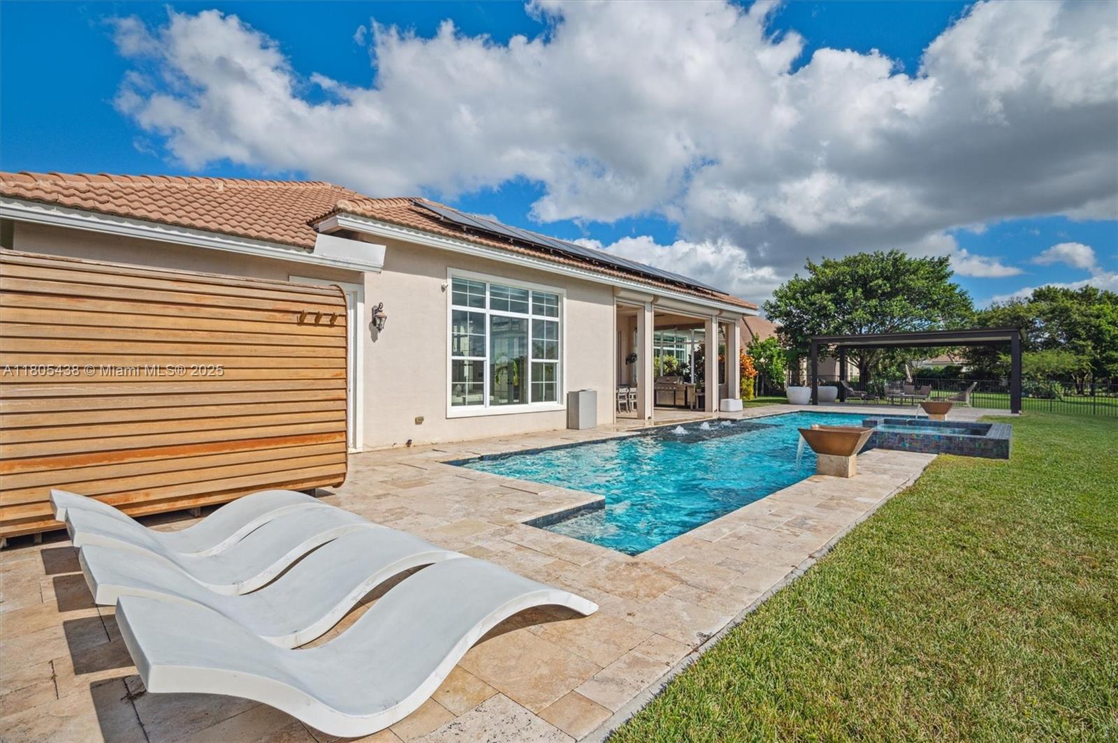 Luxury waterfront living in Sterling Ranch! This upgraded home features custom wood cabinets, porcelain floors, and quartz countertops. Enjoy a 50x16 pool overlooking the lagoon, an outdoor kitchen with electric shutters for privacy and wind protection, a private sauna, and a separate pergola for relaxing or entertaining. Spacious 3-car garage and stunning views of the Hard Rock Guitar Hotel complete this one-of-a-kind property.