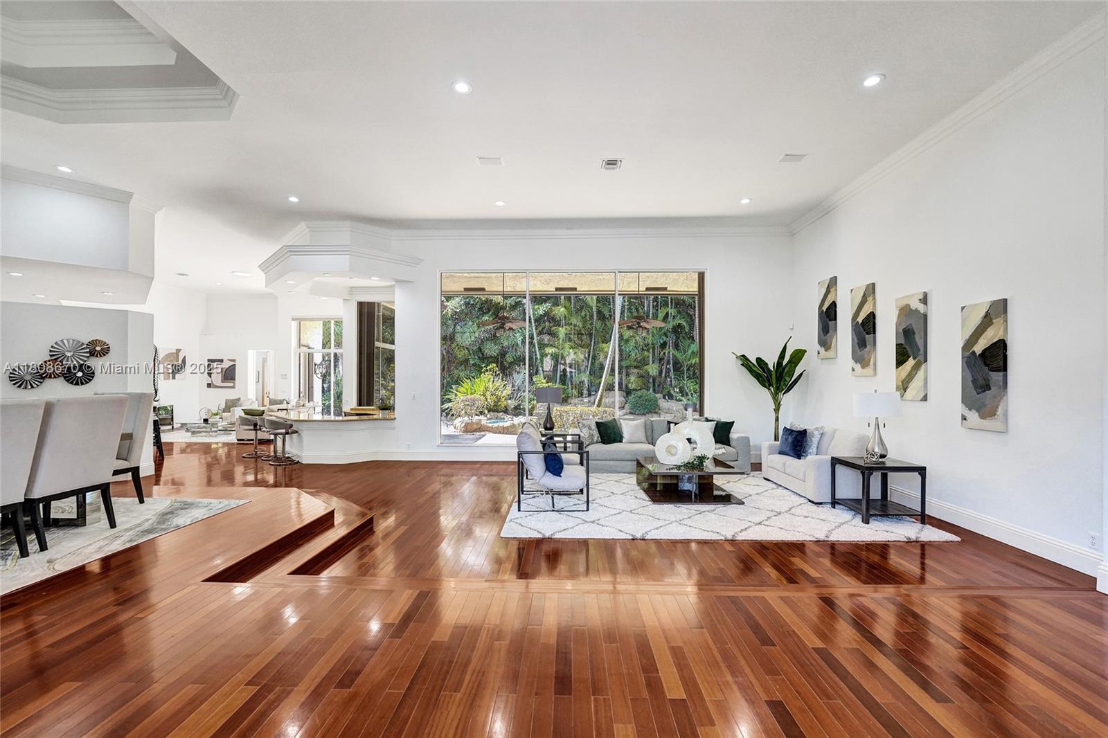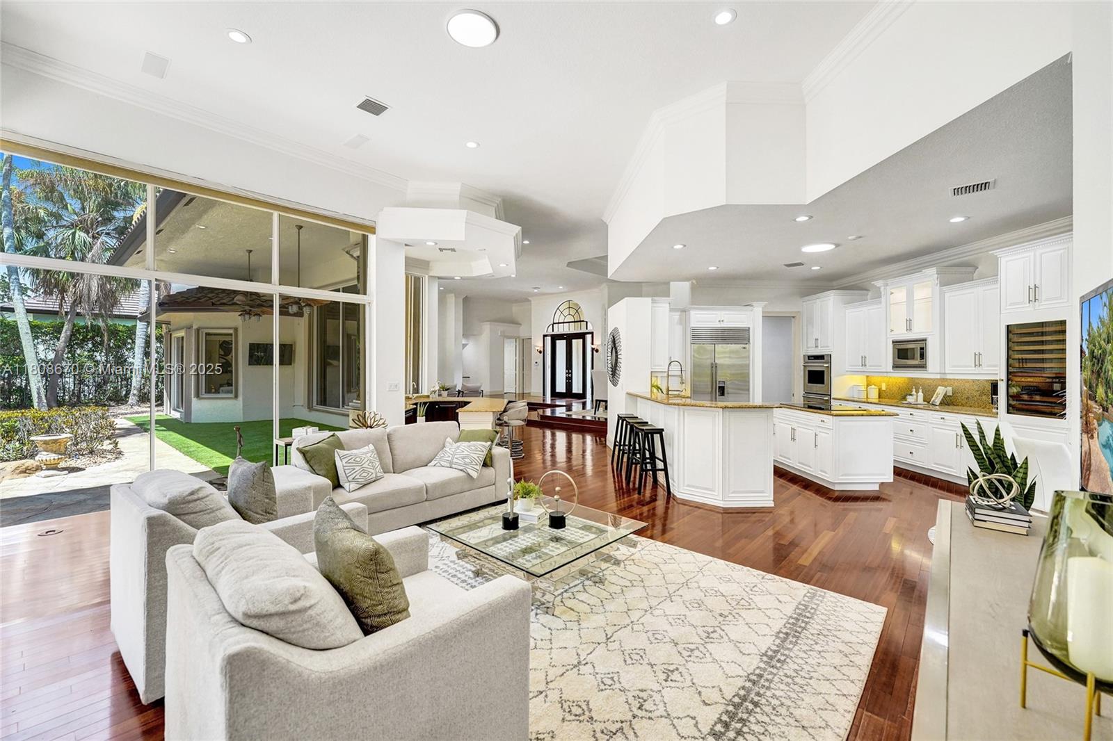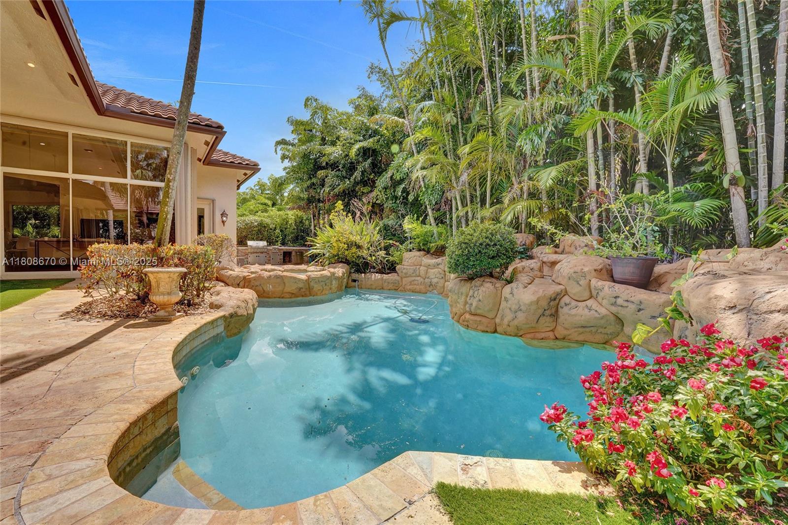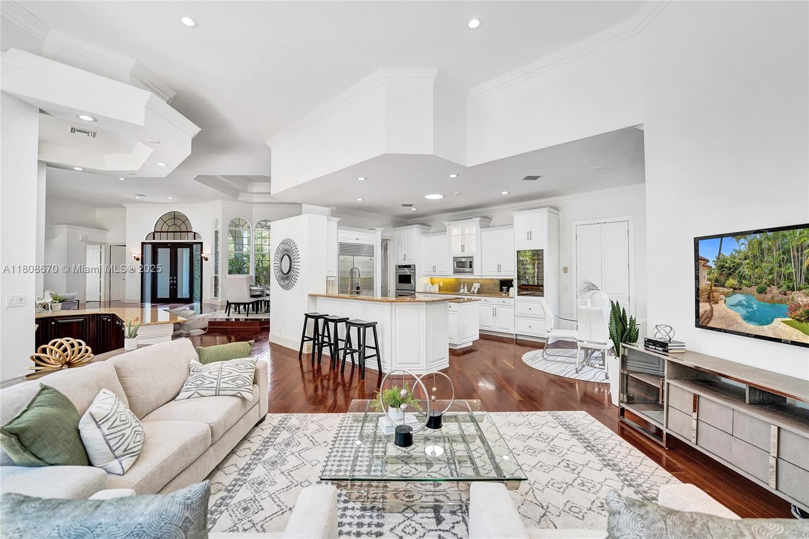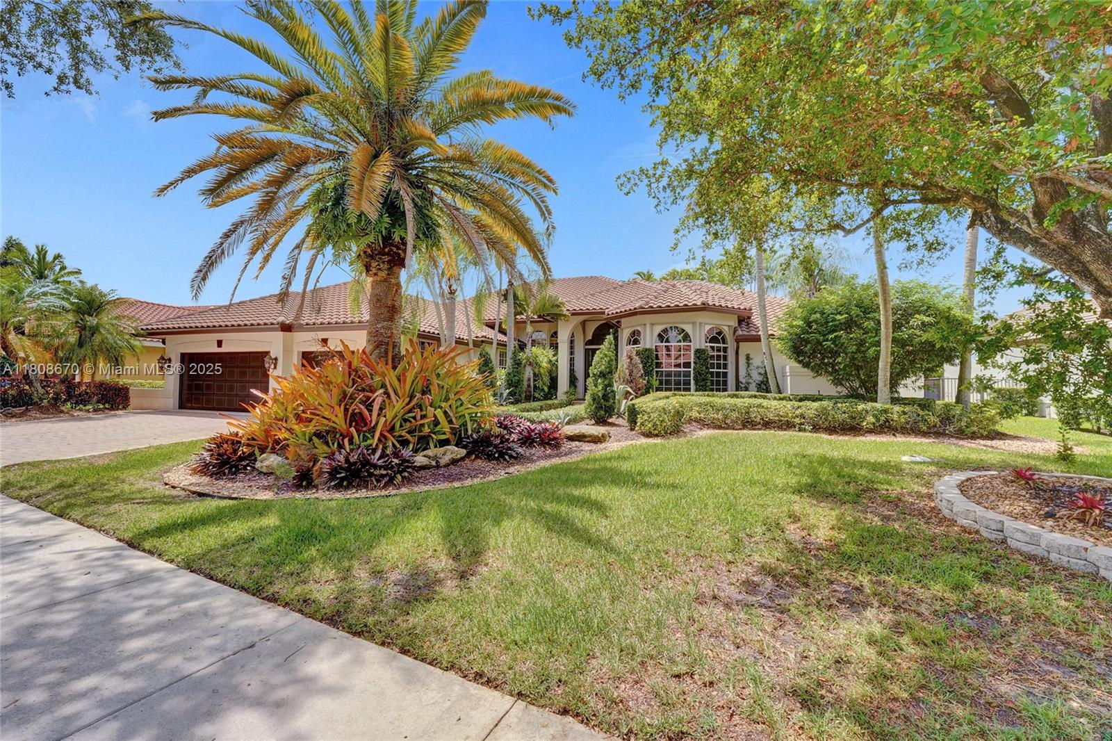 Set on beautifully landscaped 14418 sqft lot, this custom 3,818 sqft residence offers 2020 roof, paver driveway, and accordion shutters. Inside, rich wood flooring, fresh paint, and refined crown molding. At heart of the home, chef's kitchen showcasing white cabinetry, granite countertops, Sub-Zero refrigerator, and Thermador cooking appliances. Expansive primary suite is a retreat with tray ceilings, dual closets, spa-inspired bath, and direct access to backyard. Three additional bedrooms, private office, and 3.2 baths ensure ample space for family and guests, while thoughtful upgrades: LED lighting, cabana bath, and epoxy-finished garage. Outside, unwind in your own paradise: saltwater pool and spa framed by travertine deck. Perfect blend of luxury, function, and style!