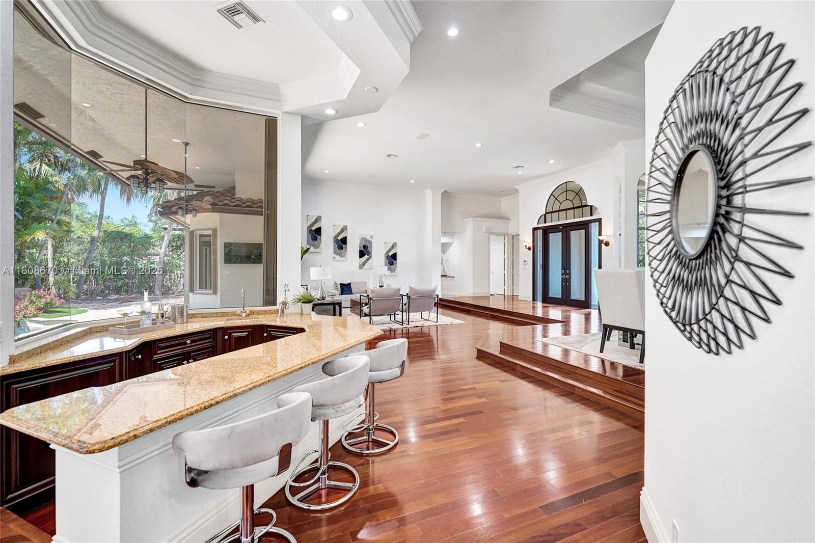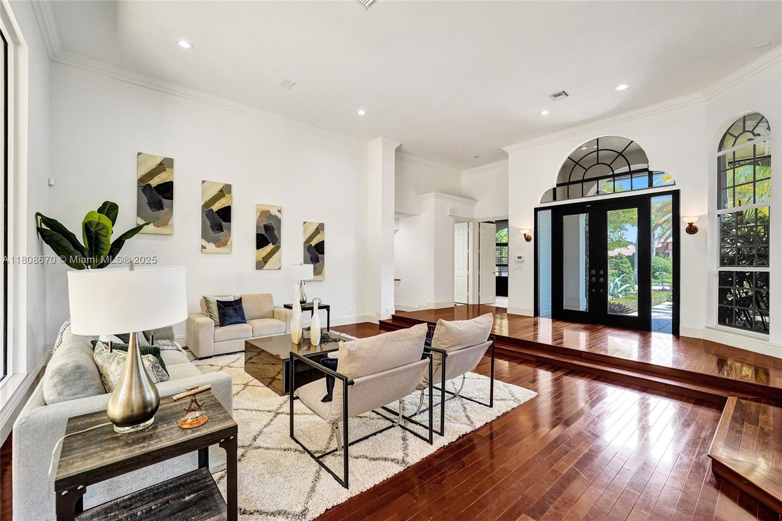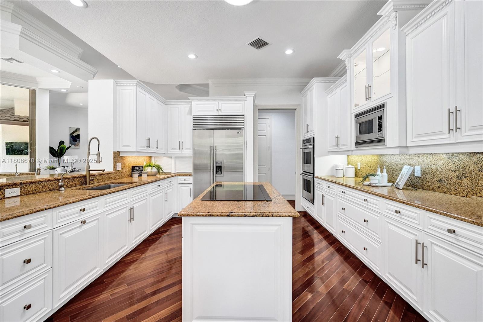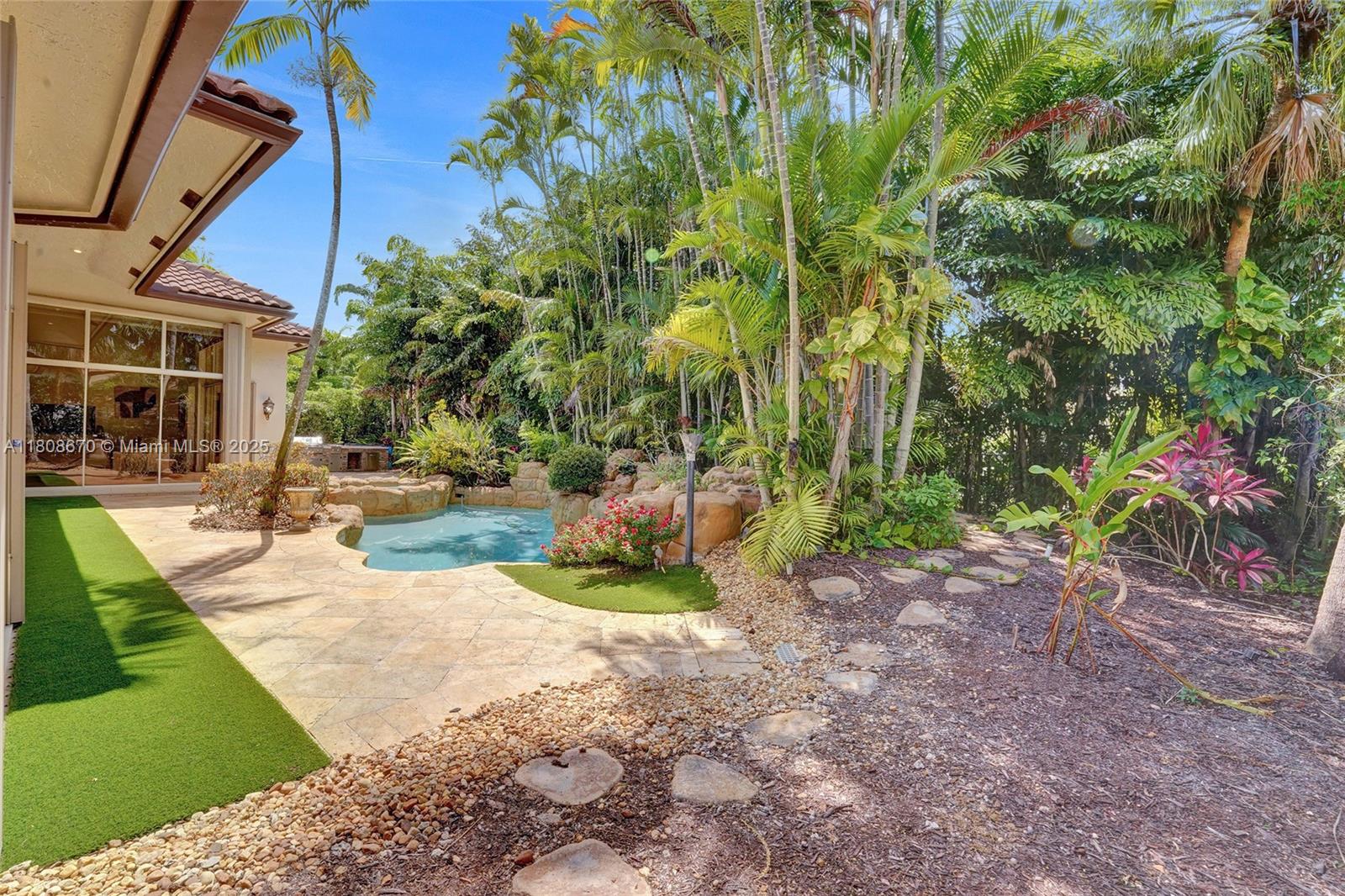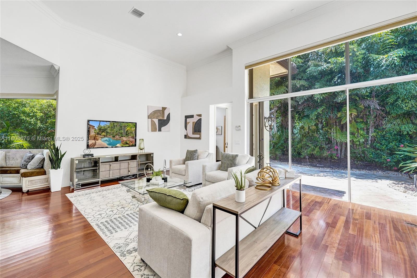 Set on beautifully landscaped 14418 sqft lot, this custom 3,818 sqft residence offers 2020 roof, paver driveway, and accordion shutters. Inside, rich wood flooring, fresh paint, and refined crown molding. At heart of the home, chef's kitchen showcasing white cabinetry, granite countertops, Sub-Zero refrigerator, and Thermador cooking appliances. Expansive primary suite is a retreat with tray ceilings, dual closets, spa-inspired bath, and direct access to backyard. Three additional bedrooms, private office, and 3.2 baths ensure ample space for family and guests, while thoughtful upgrades: LED lighting, cabana bath, and epoxy-finished garage. Outside, unwind in your own paradise: saltwater pool and spa framed by travertine deck. Perfect blend of luxury, function, and style!