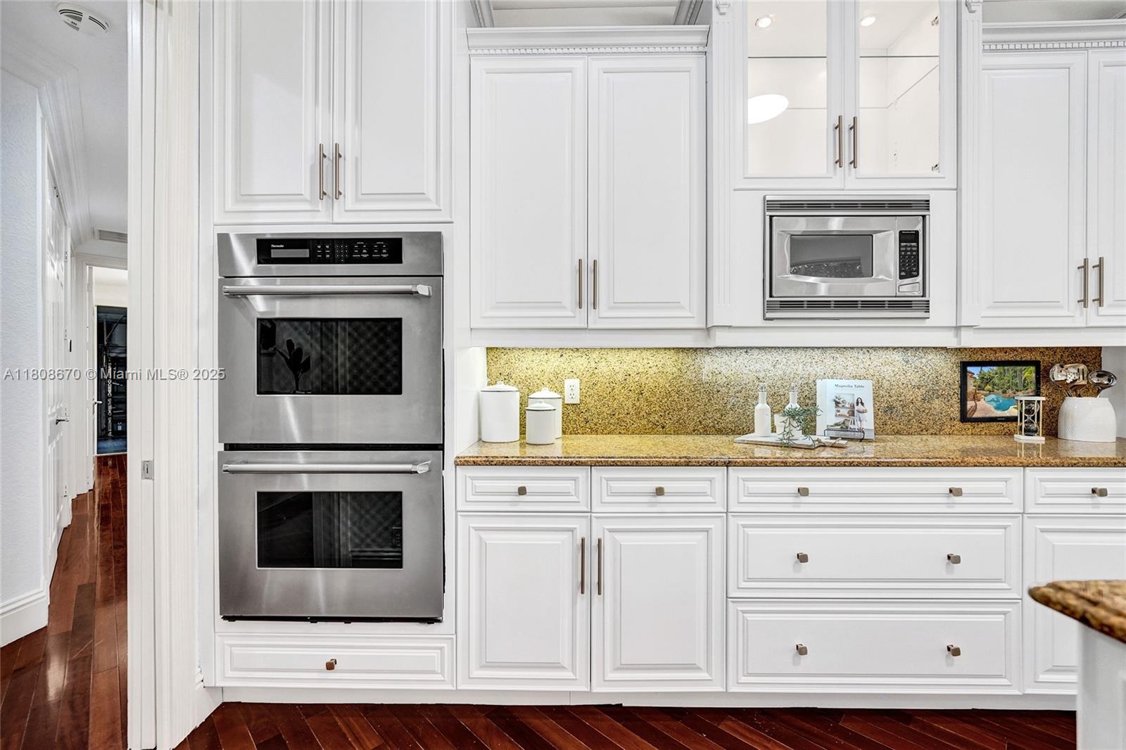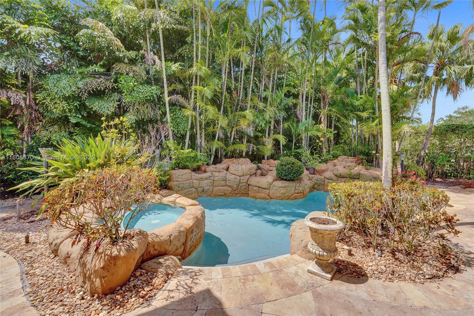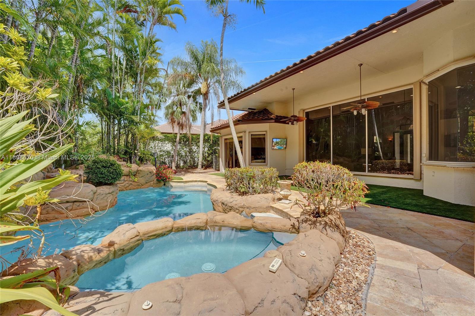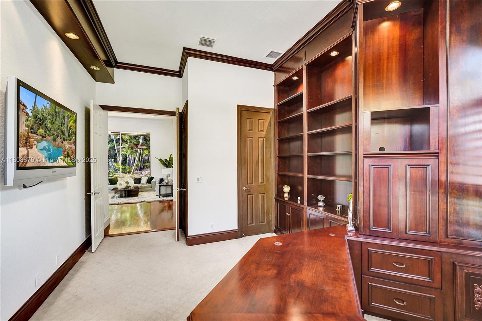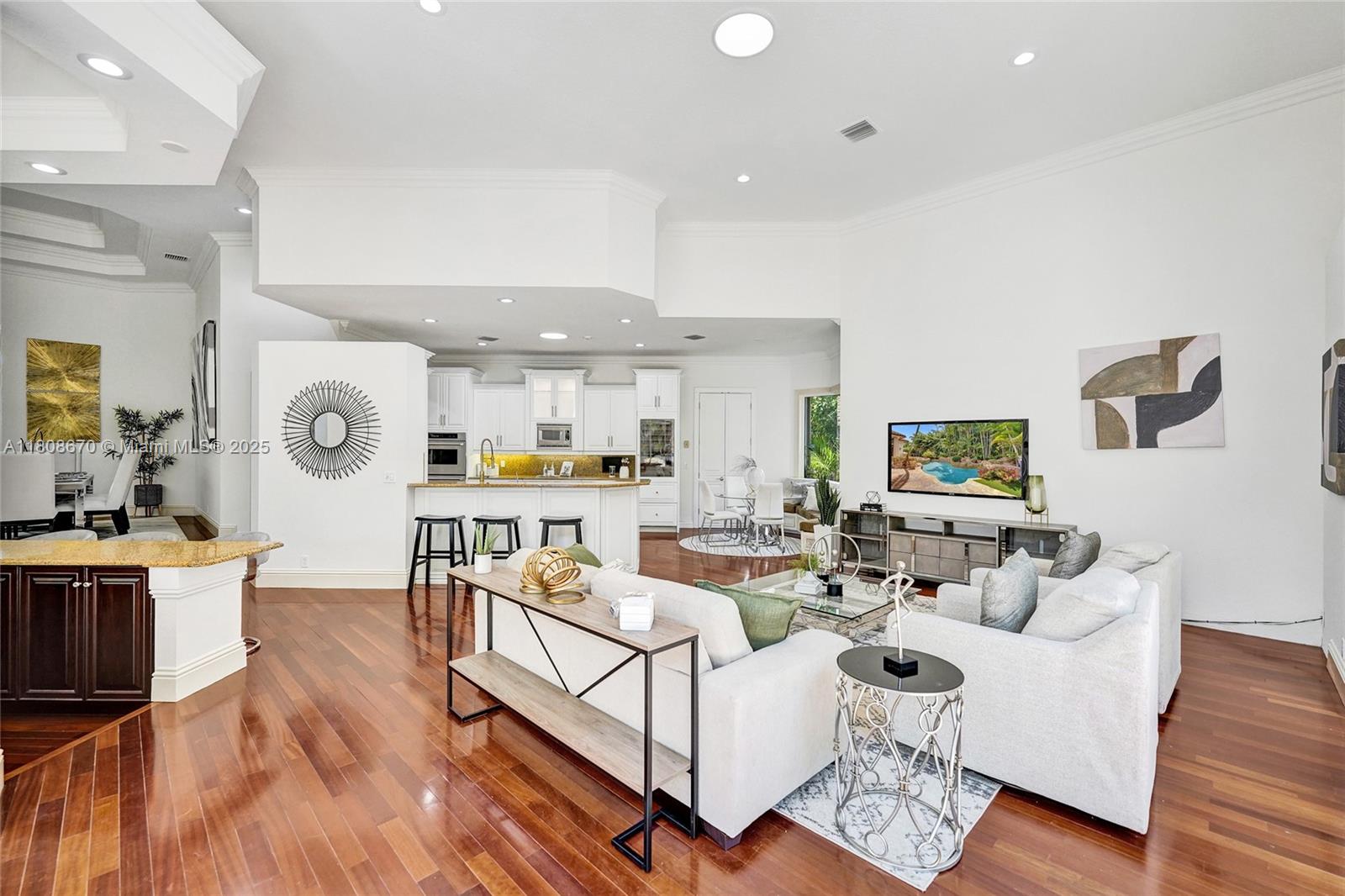 Set on beautifully landscaped 14418 sqft lot, this custom 3,818 sqft residence offers 2020 roof, paver driveway, and accordion shutters. Inside, rich wood flooring, fresh paint, and refined crown molding. At heart of the home, chef's kitchen showcasing white cabinetry, granite countertops, Sub-Zero refrigerator, and Thermador cooking appliances. Expansive primary suite is a retreat with tray ceilings, dual closets, spa-inspired bath, and direct access to backyard. Three additional bedrooms, private office, and 3.2 baths ensure ample space for family and guests, while thoughtful upgrades: LED lighting, cabana bath, and epoxy-finished garage. Outside, unwind in your own paradise: saltwater pool and spa framed by travertine deck. Perfect blend of luxury, function, and style!