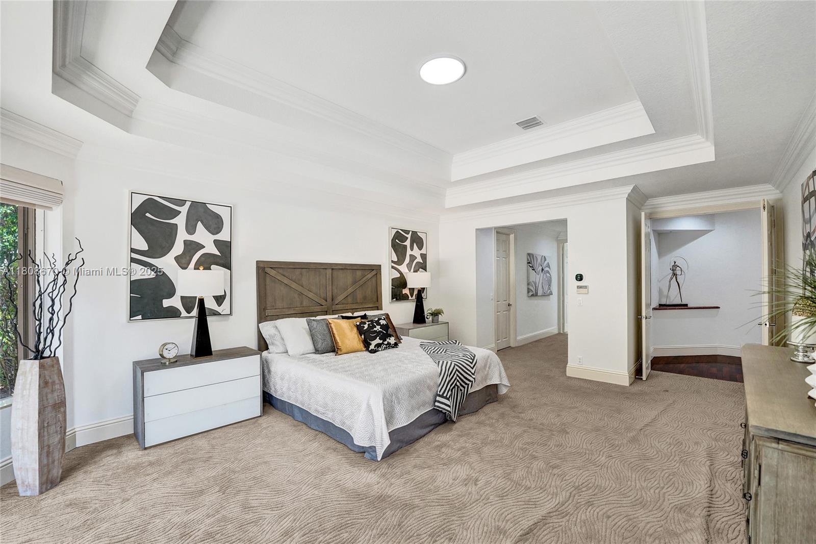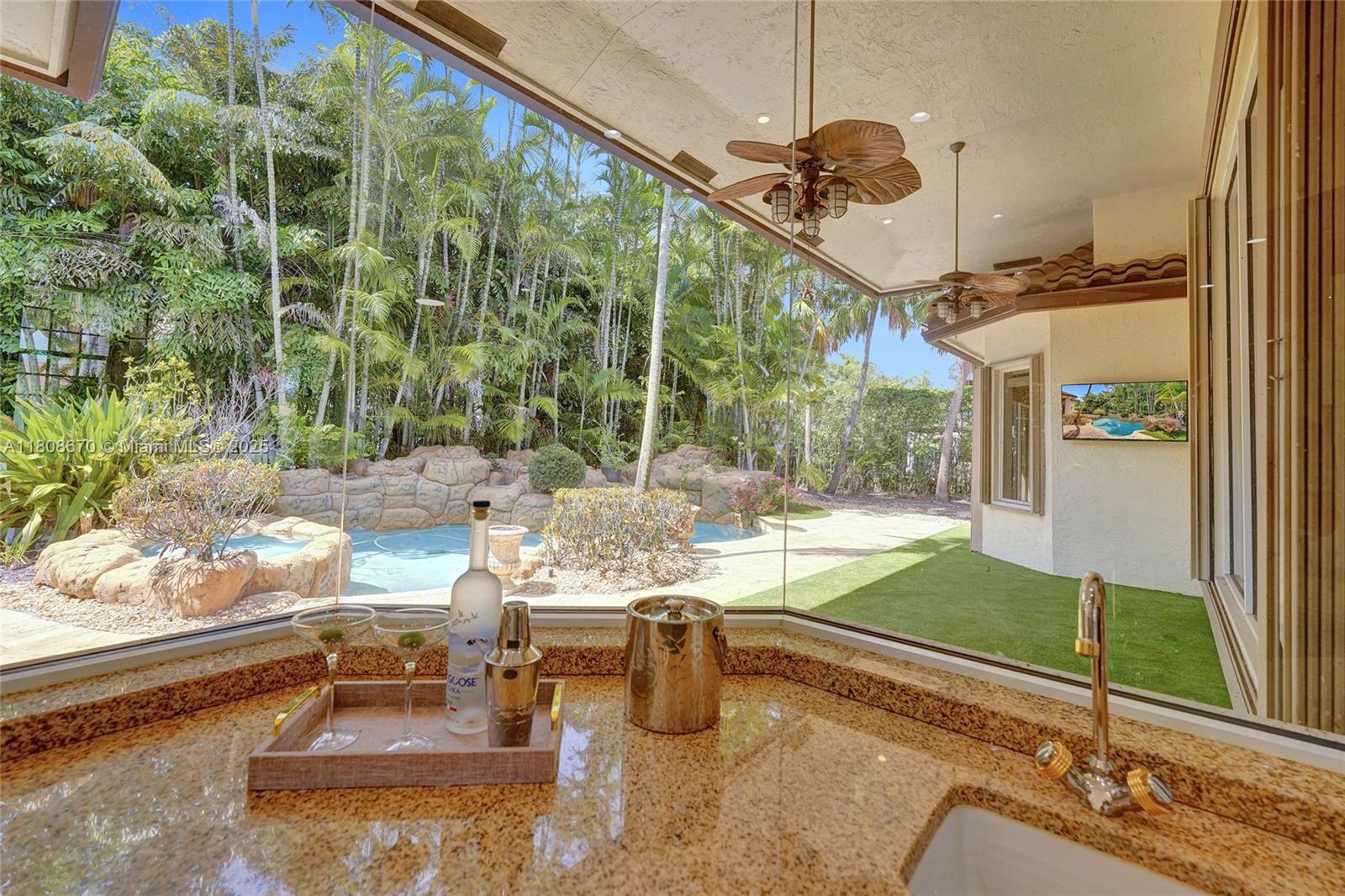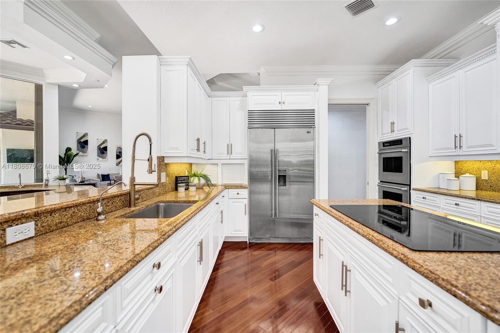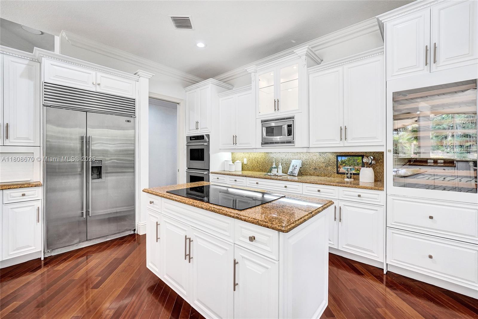 Set on beautifully landscaped 14418 sqft lot, this custom 3,818 sqft residence offers 2020 roof, paver driveway, and accordion shutters. Inside, rich wood flooring, fresh paint, and refined crown molding. At heart of the home, chef's kitchen showcasing white cabinetry, granite countertops, Sub-Zero refrigerator, and Thermador cooking appliances. Expansive primary suite is a retreat with tray ceilings, dual closets, spa-inspired bath, and direct access to backyard. Three additional bedrooms, private office, and 3.2 baths ensure ample space for family and guests, while thoughtful upgrades: LED lighting, cabana bath, and epoxy-finished garage. Outside, unwind in your own paradise: saltwater pool and spa framed by travertine deck. Perfect blend of luxury, function, and style!