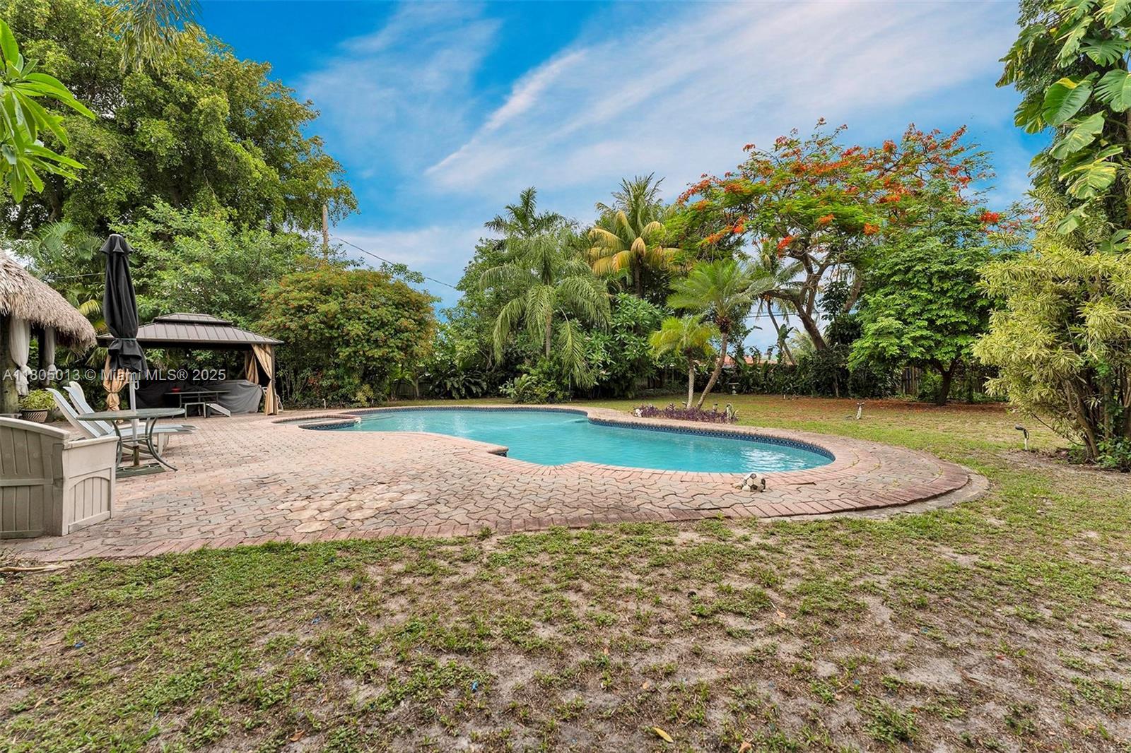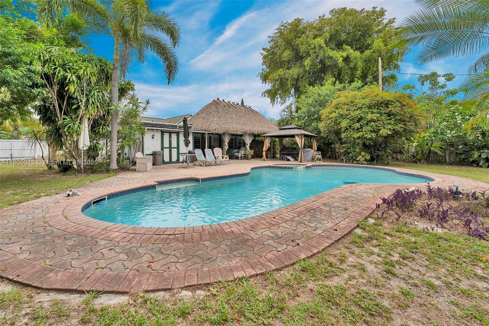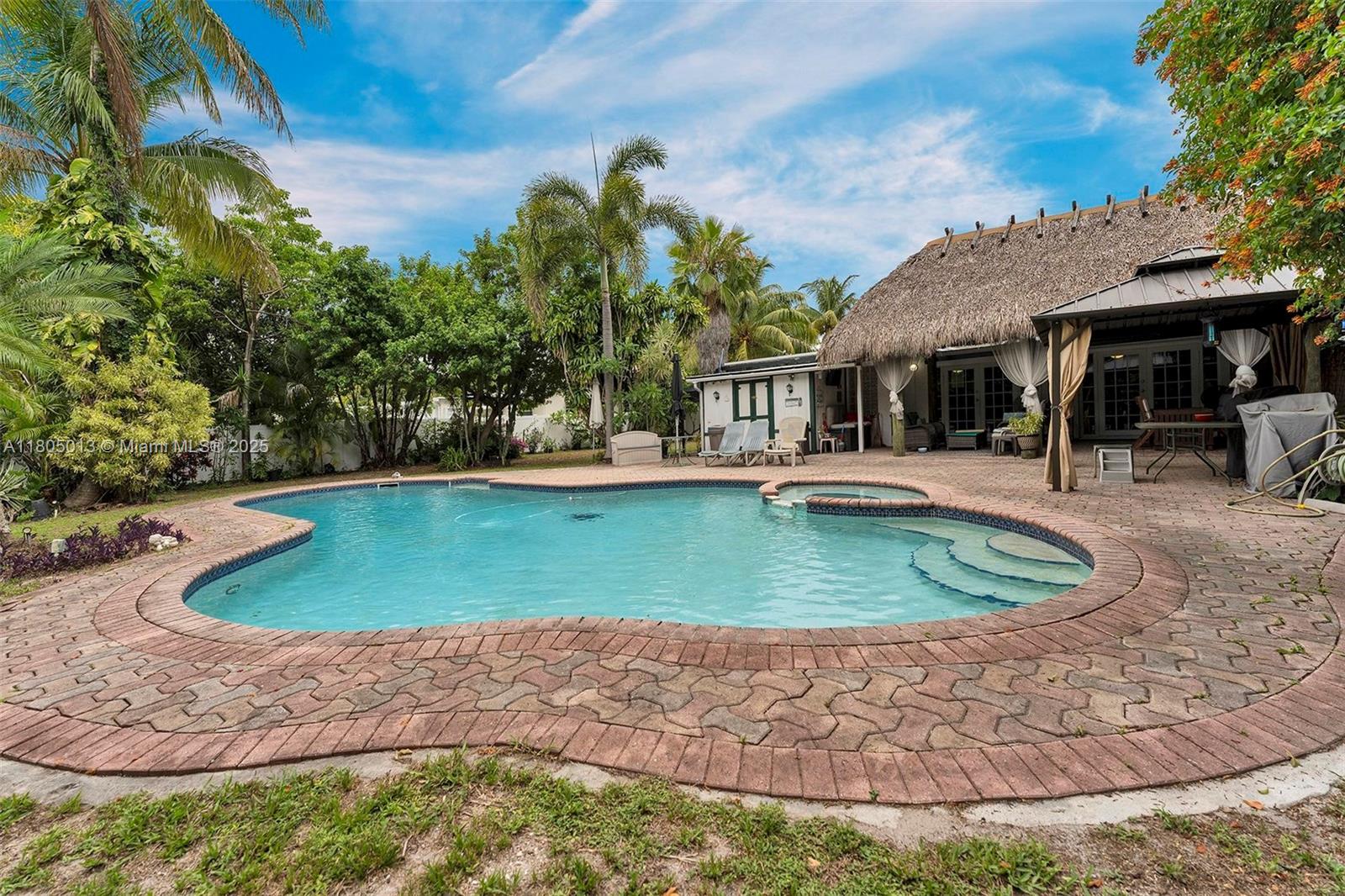 Endless potential in East Hollywood! This 3-bedroom, 3-bath home sits on an oversized half-acre lot, offering a rare opportunity to renovate or expand. While the home itself maintains its original character, the backyard is a true highlight—featuring a heated pool with Jacuzzi, a spacious tiki-style Nikki hut, tropical fruit trees, and a barbecue area perfect for entertaining, all under security cameras. The tropical landscaping creates a private, resort-like atmosphere, ideal for enjoying the South Florida lifestyle. No HOA, with plenty of room for RV/boat parking. Located just minutes from Hollywood Beach, Guitar Hotel, Hard Rock Casino, FLL airport, Downtown, shopping, and major highways. HIGH AIRBNB POTENTIAL!!! A great investment or blank canvas for your dream home. NOT A FLOOD ZONE !