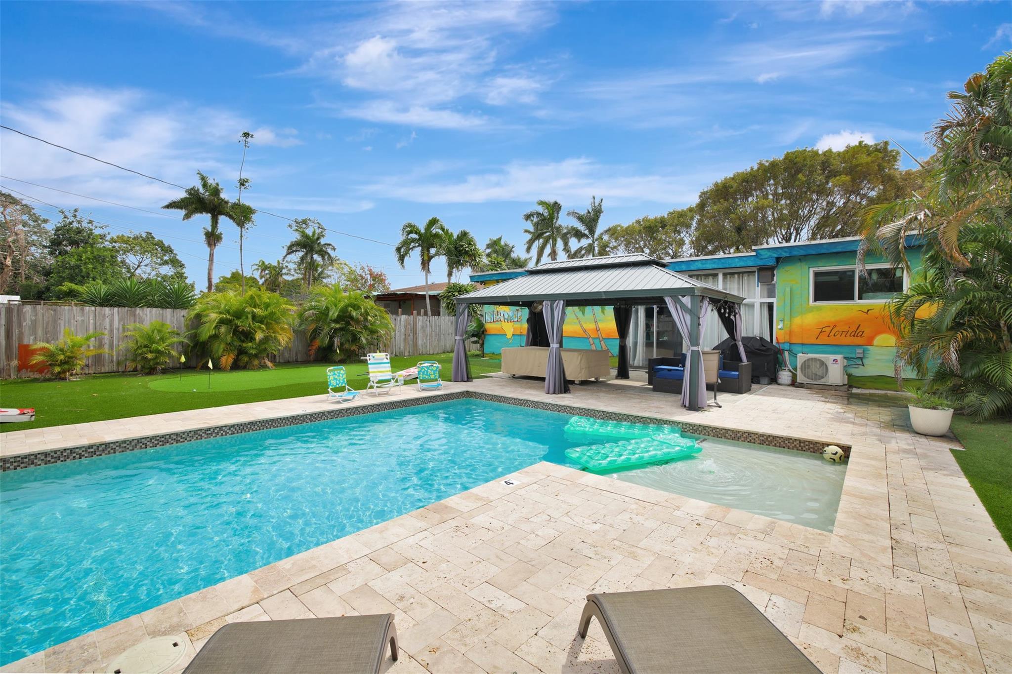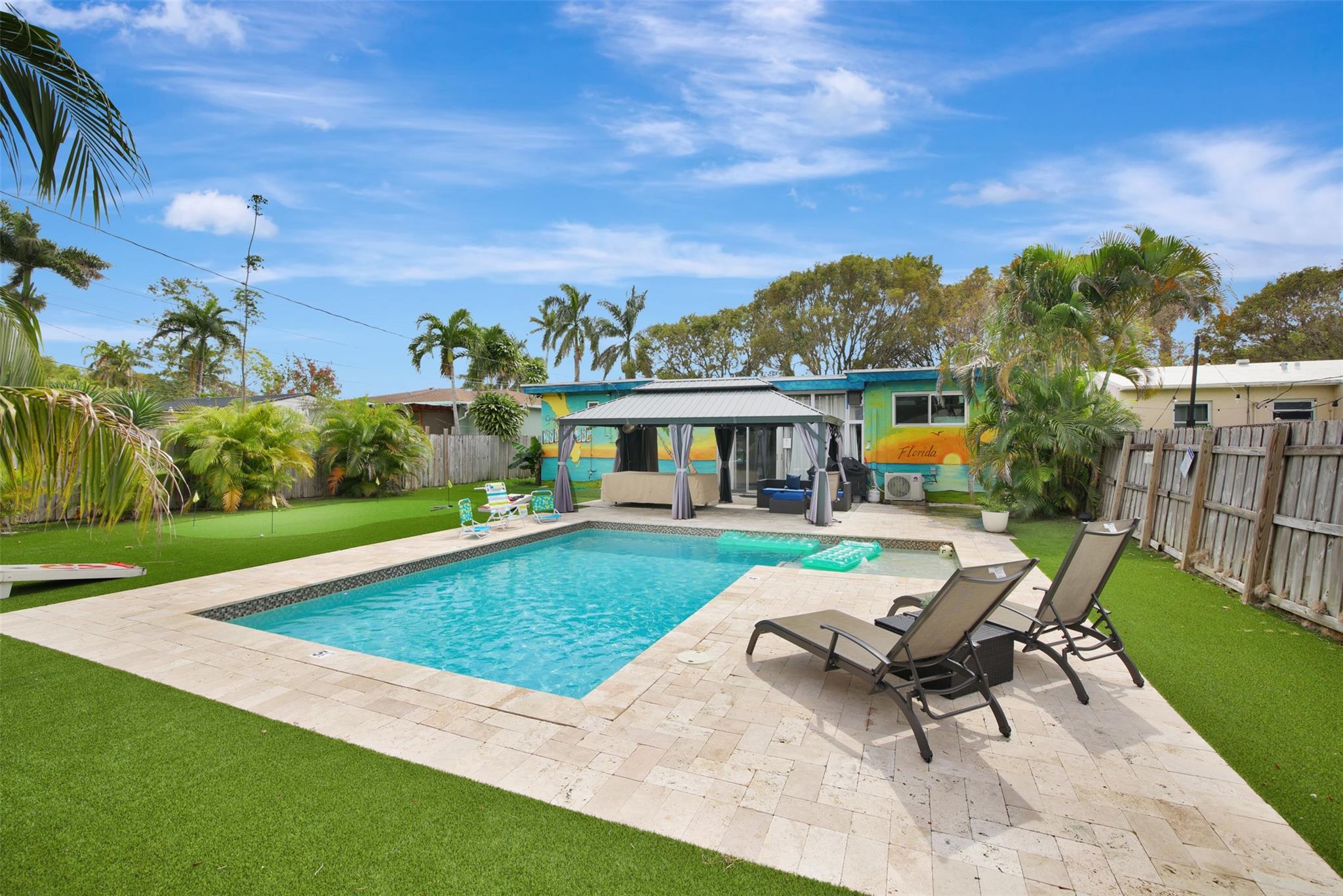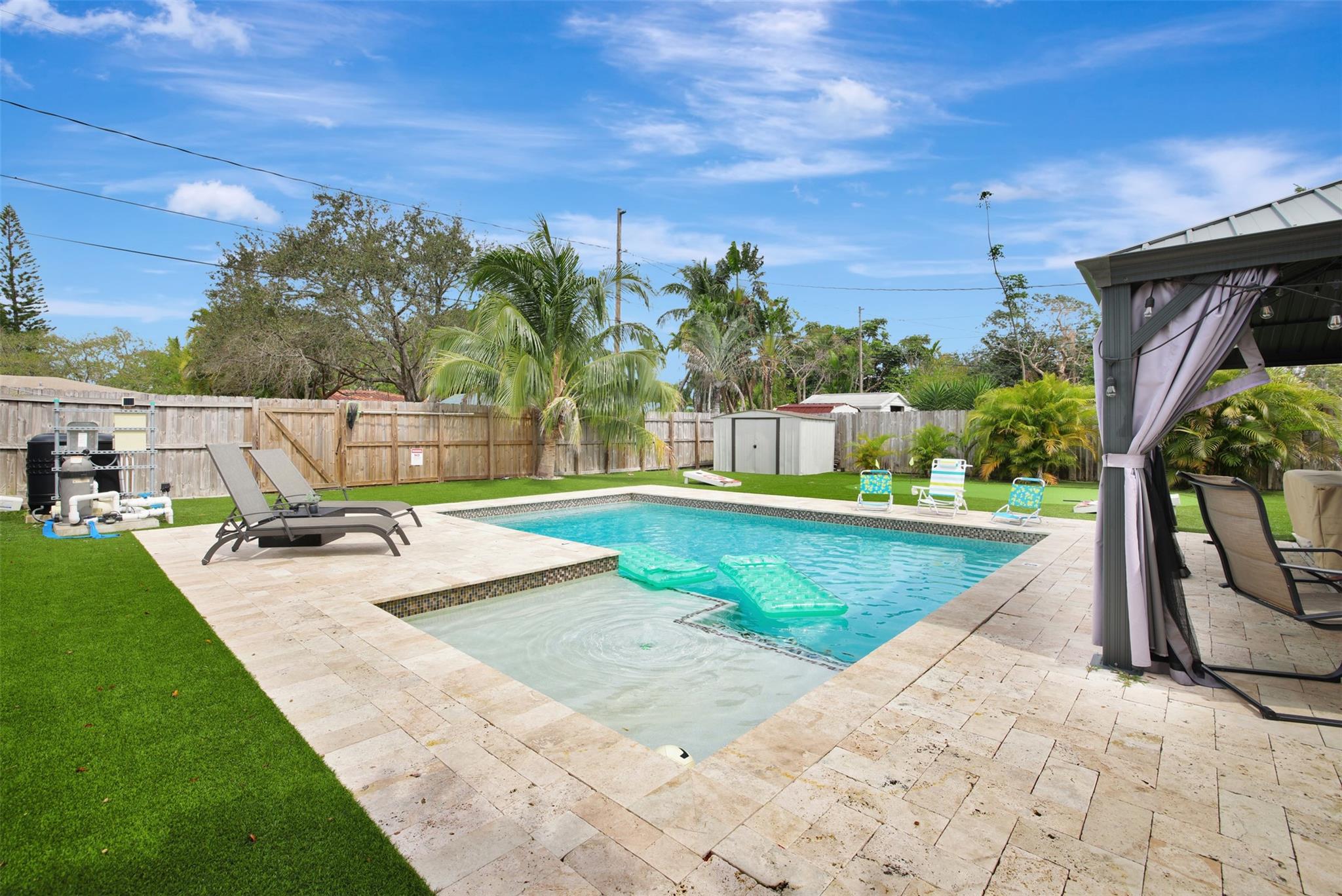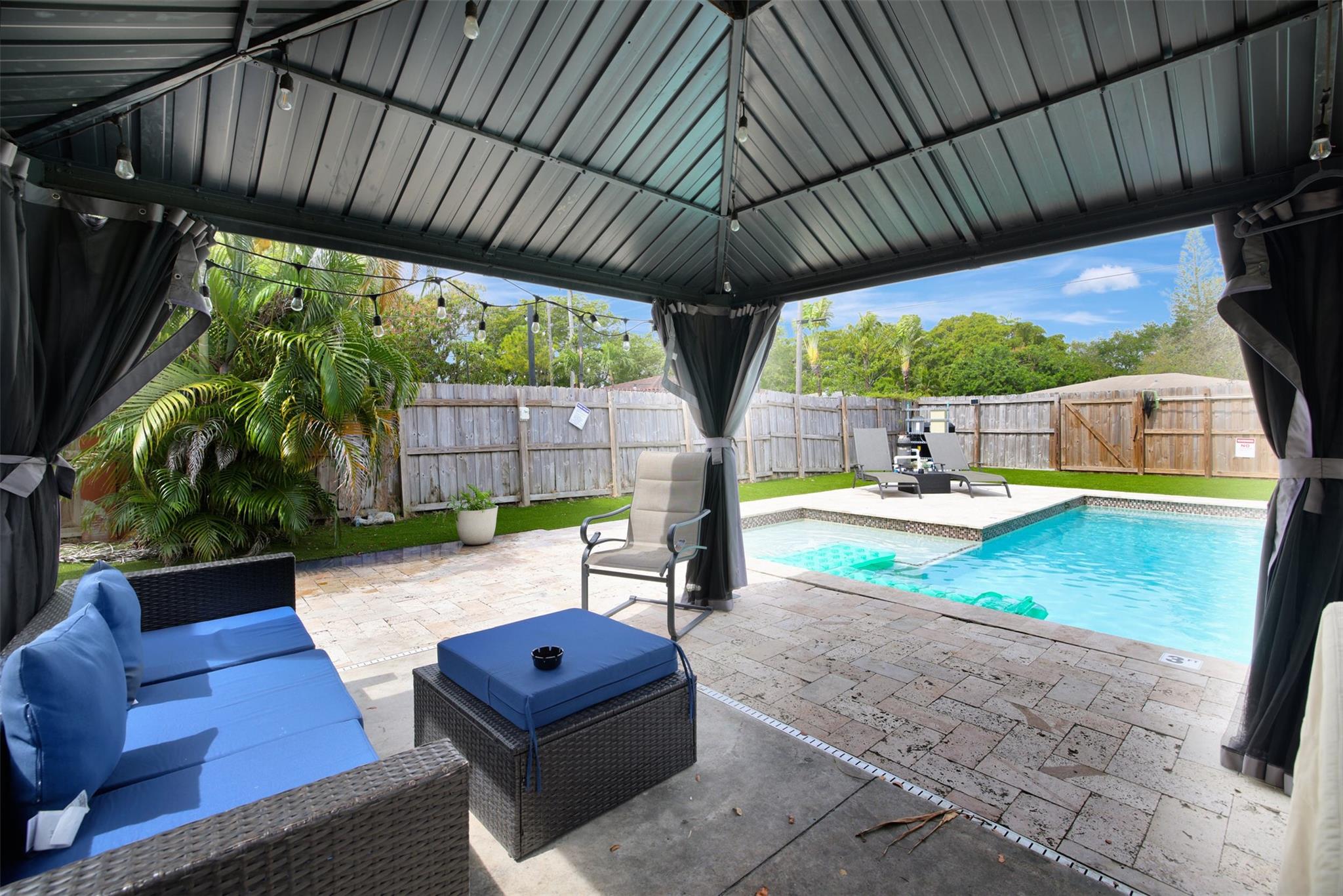 Fantastic house features expansive updated kitchen with stainless steel appliances, ample counter space and breakfast area. Impact windows, and panels for sliding glass doors. Modern/updated bathrooms. Huge fenced backyard with travertine pavers, pool, gazebo and putting area - great for entertaining! Large Florida Sunroom. Workshop off the Florida room. Lots more! Don't miss it!