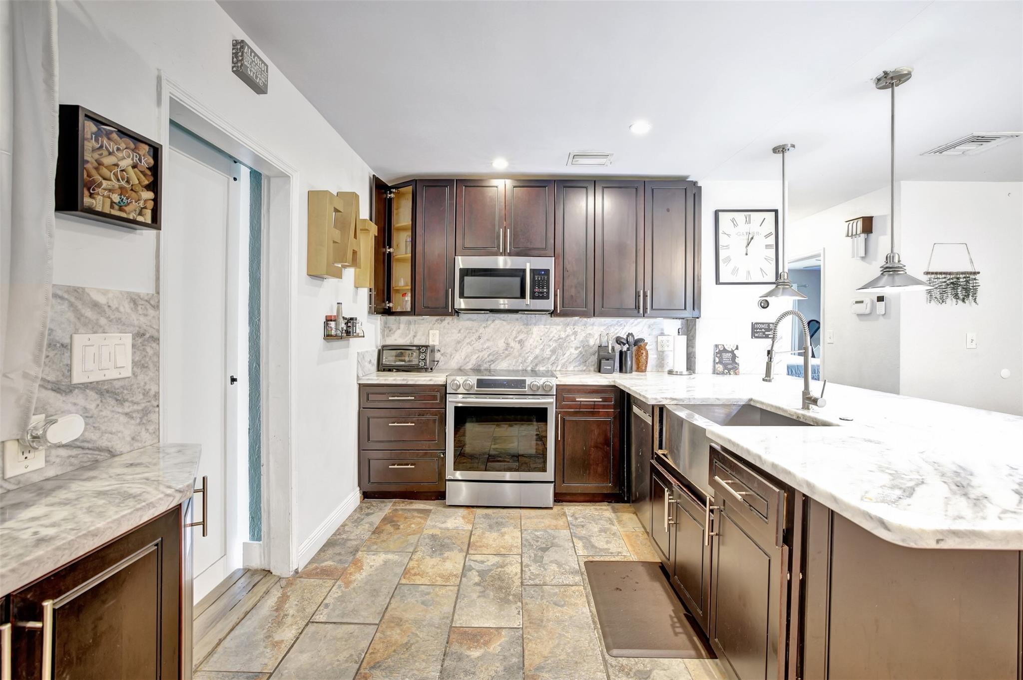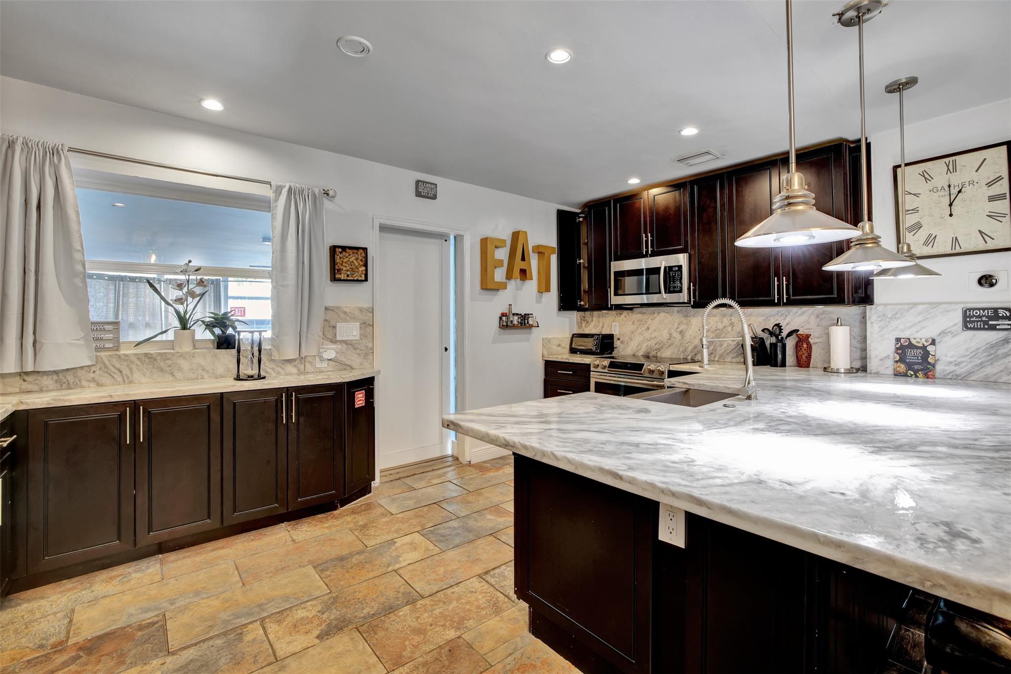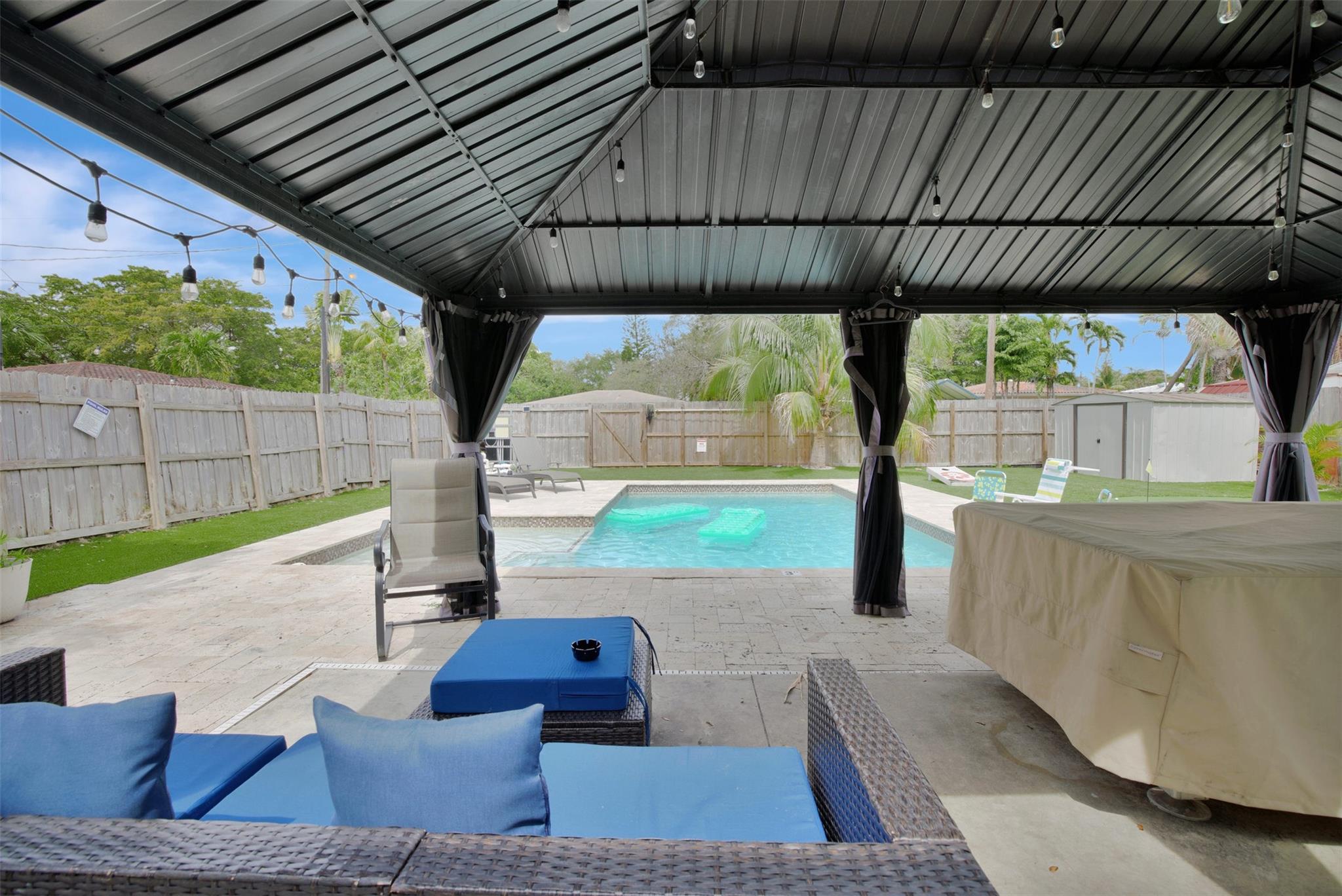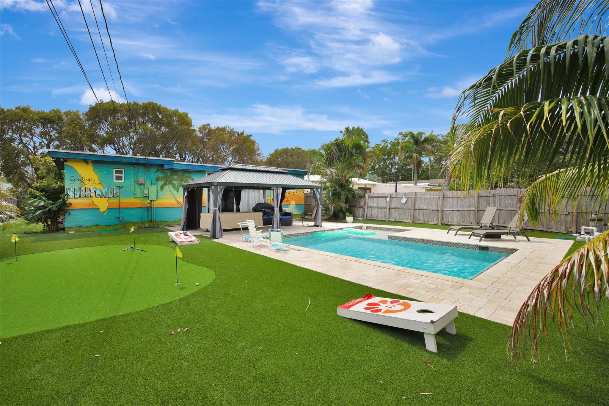 Fantastic house features expansive updated kitchen with stainless steel appliances, ample counter space and breakfast area. Impact windows, and panels for sliding glass doors. Modern/updated bathrooms. Huge fenced backyard with travertine pavers, pool, gazebo and putting area - great for entertaining! Large Florida Sunroom. Workshop off the Florida room. Lots more! Don't miss it!