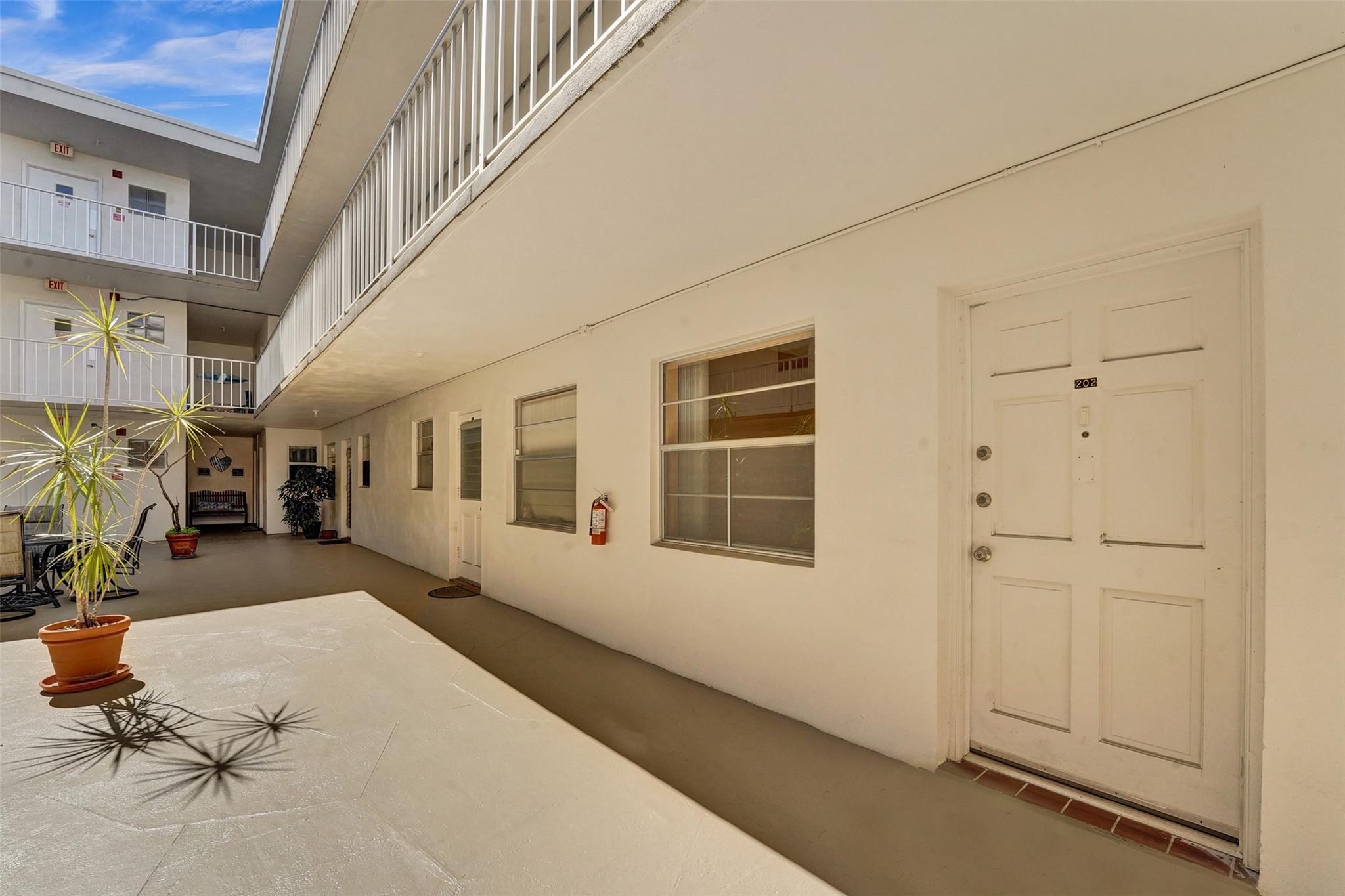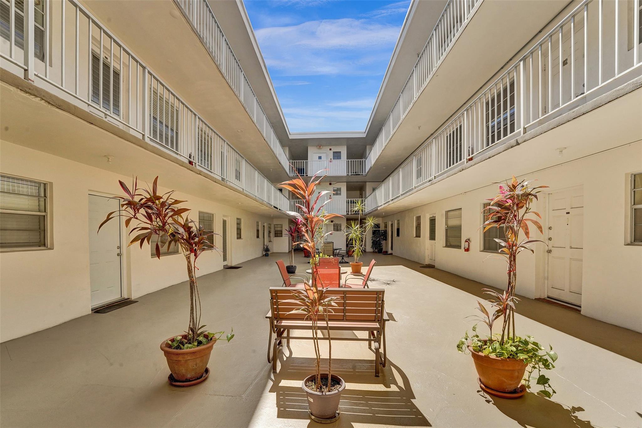 Charming 55+ Condo in the heart of Hollywood. This unit offers a serene living experience in a well-maintained building. Enjoy socializing with your neighbors right outside your door in the courtyard area. The unit features a screened-in balcony off the bedroom, newer appliances in the kitchen, an upgraded A/C and water heater. The bathrooms were renovated just over a year ago, offering a fresh and clean look. There are two large closets in the hallway for extra storage space. The building itself has been meticulously cared for, with recent upgrades within the last year. Reserves in place and no special assessments scheduled, this condo offers peace of mind for the future. The assigned parking spot is covered and close to the entrance.