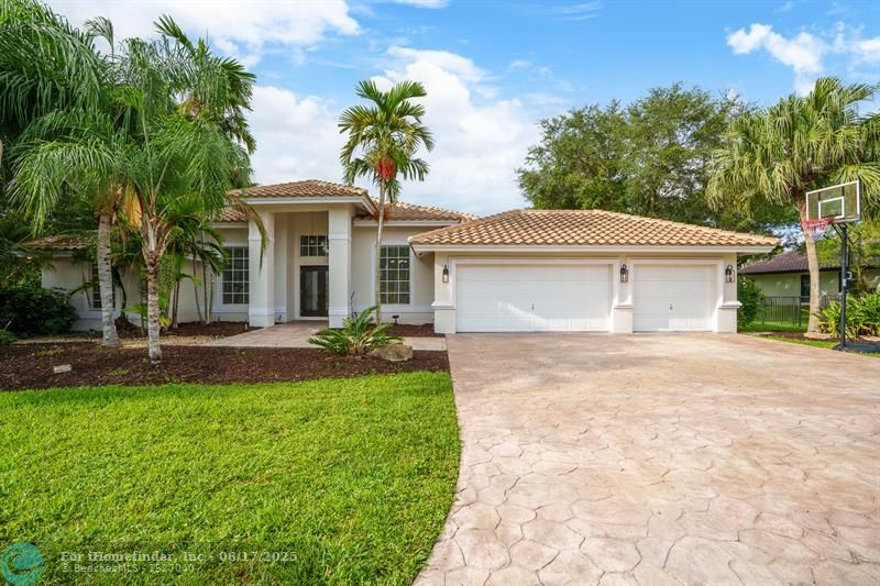 Nestled in a charming and quaint community of just 39 homes, this one-story home is just perfection. The roof was replaced in 2023, and in 2024, hurricane impact windows and doors were elegantly installed, ensuring both safety and style. Freshly painted inside and out, the residence boasts an impressive layout featuring six bedrooms, three bathrooms, and a three-car garage . Enjoy versatile living with a den that can easily serve as a theater, game room, or gym. Step outside to your own serene oasis, complete with a sparkling pool and a sprawling yard that leads directly to the water. The interior showcases tile flooring in the social areas for easy maintenance, while the bedrooms feature rich wood floors. The kitchen is equipped with stainless steel appliances, ideal for the home chef.
