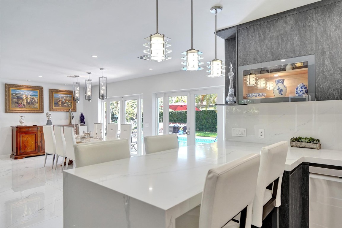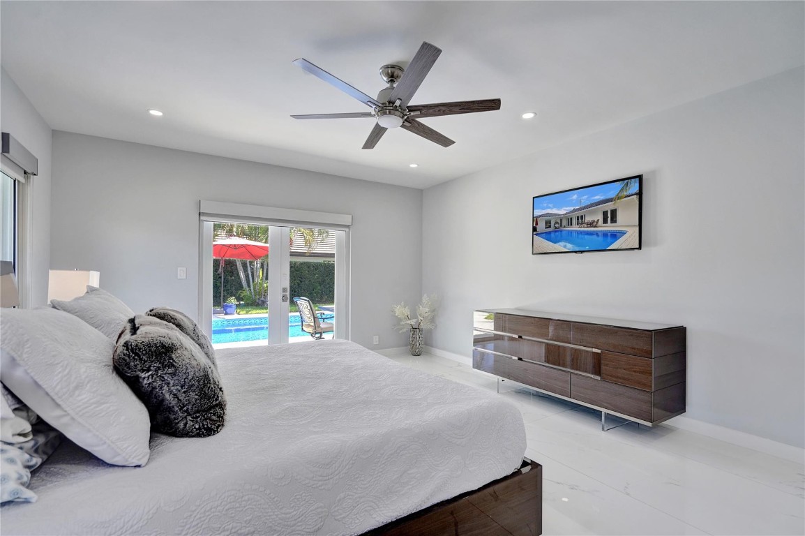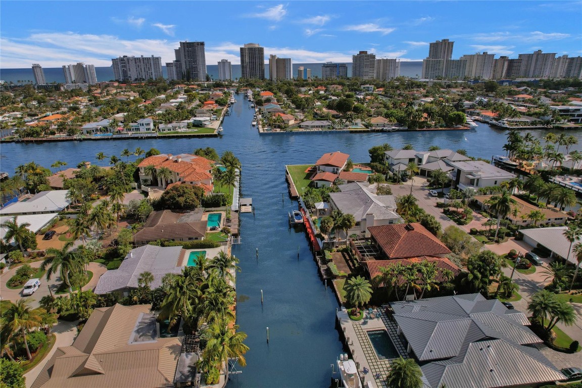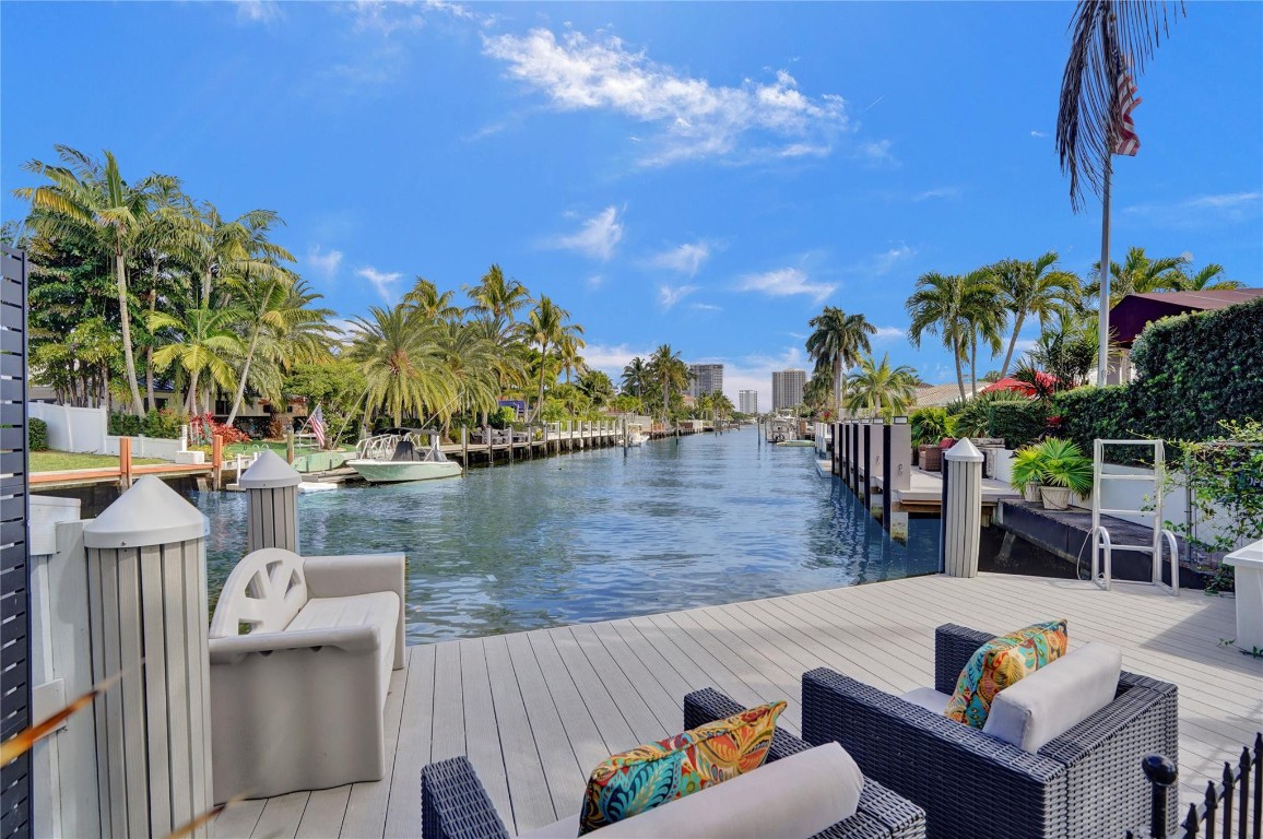 Beautifully renovated deep water residence situated on an oversized corner lot offering ultimate privacy with a "park-like" atmosphere. Bring your small boat, or jet skis & enjoy spectacular water views down the canal to the Intracoastal from the newly built dock. This Spacious home showcases a sleek modern design w/ a seamless open floor plan & luxurious, large-format, Porcelain tiles throughout. Impact glass windows & doors. The chef inspired kitchen is a showstopper with Quartz counters, breakfast bar & stylish European style cabinetry. This popular split bedroom layout offers a luxurious primary bedroom suite with views of the water & pool area complete with spa-like bath, 5th bedroom converted to a huge walk-in closet. Paver circular driveway is situated on NE 40th Ct for easy access.