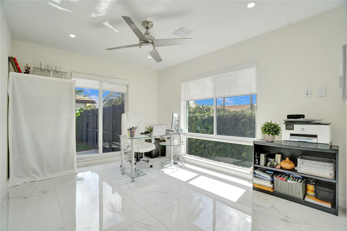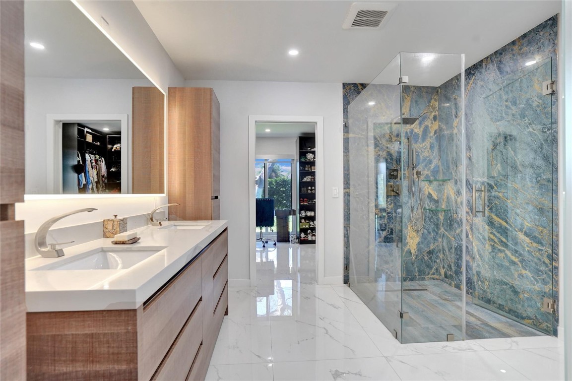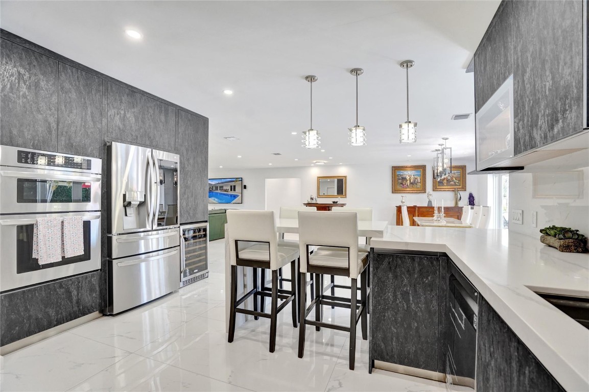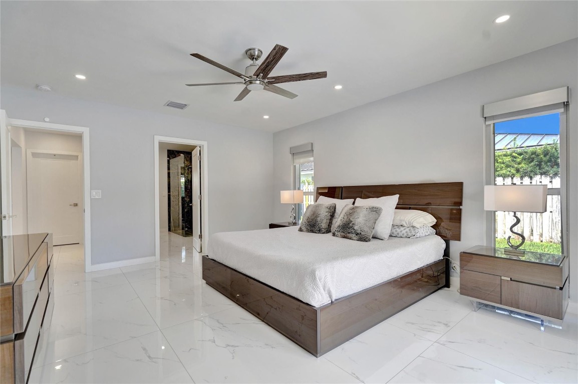 Beautifully renovated deep water residence situated on an oversized corner lot offering ultimate privacy with a "park-like" atmosphere. Bring your small boat, or jet skis & enjoy spectacular water views down the canal to the Intracoastal from the newly built dock. This Spacious home showcases a sleek modern design w/ a seamless open floor plan & luxurious, large-format, Porcelain tiles throughout. Impact glass windows & doors. The chef inspired kitchen is a showstopper with Quartz counters, breakfast bar & stylish European style cabinetry. This popular split bedroom layout offers a luxurious primary bedroom suite with views of the water & pool area complete with spa-like bath, 5th bedroom converted to a huge walk-in closet. Paver circular driveway is situated on NE 40th Ct for easy access.