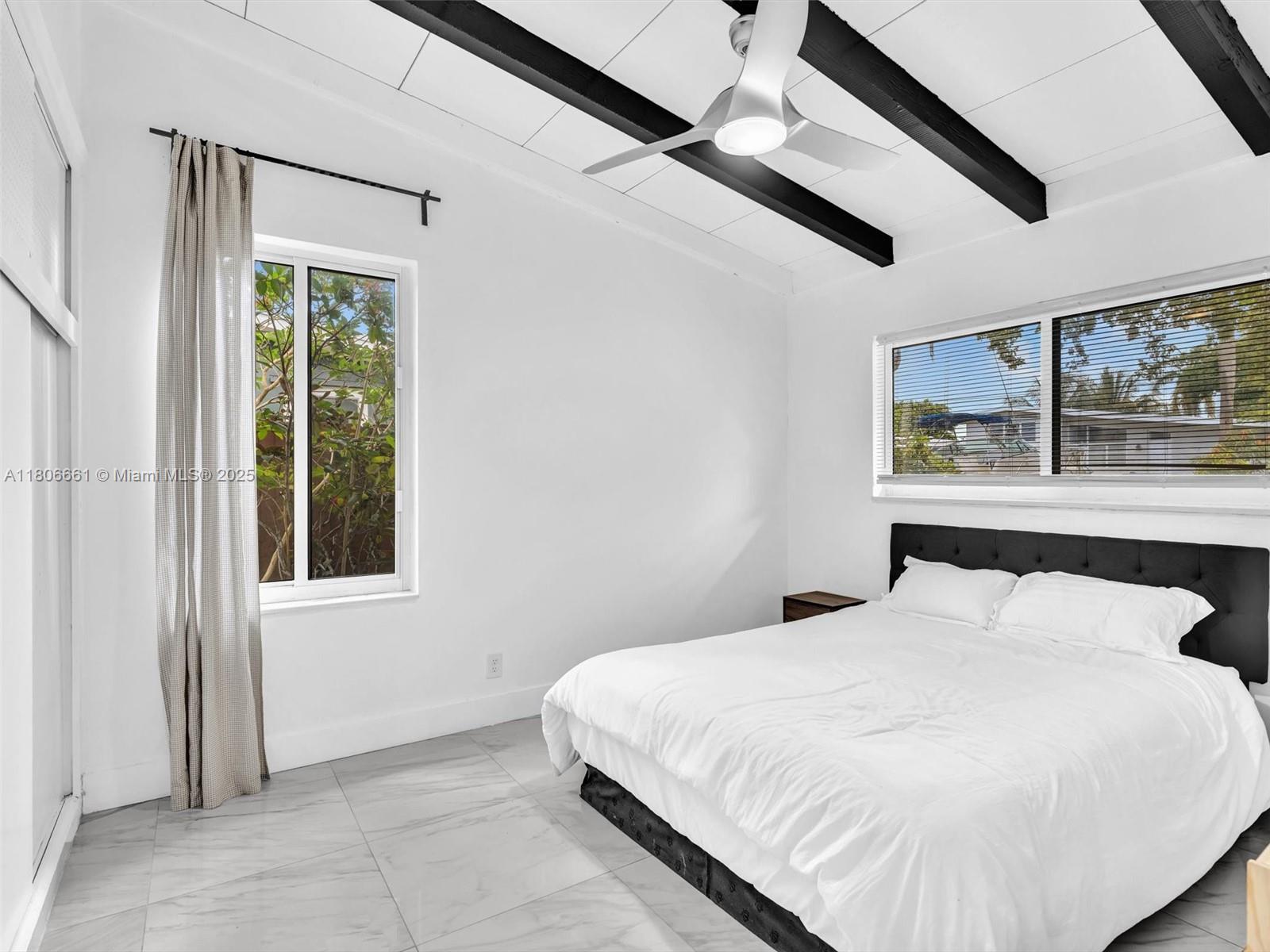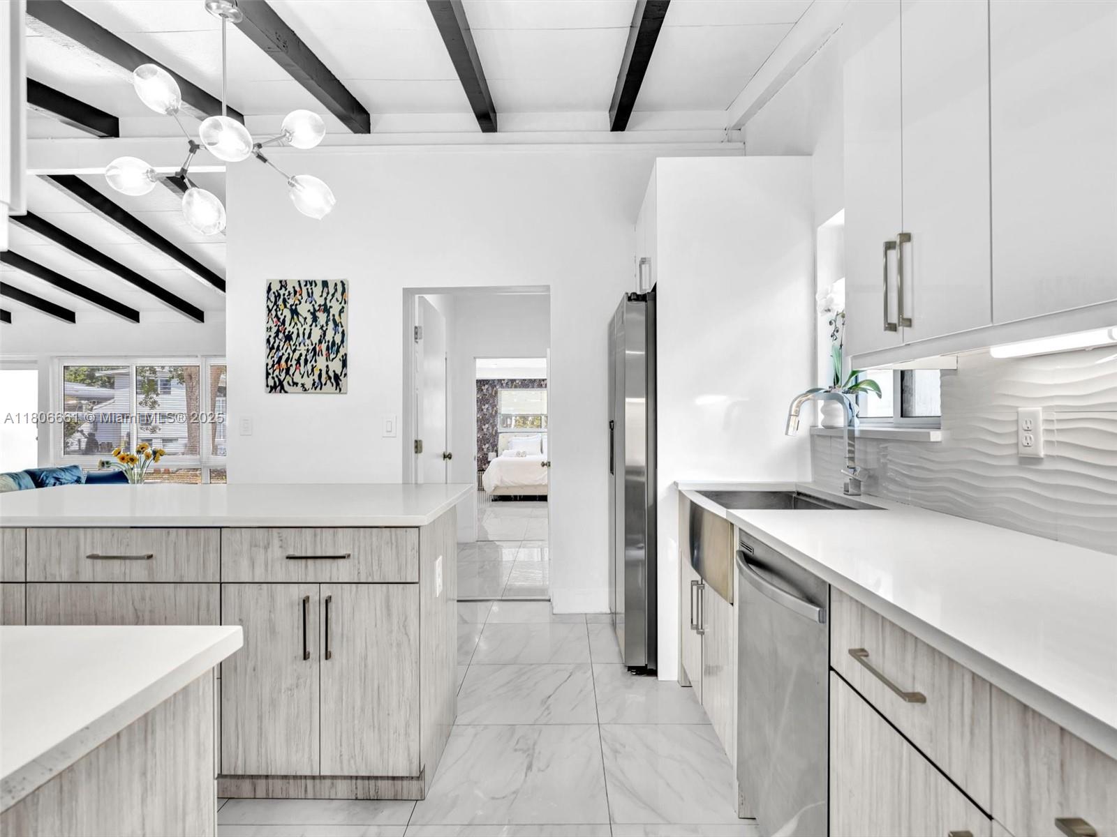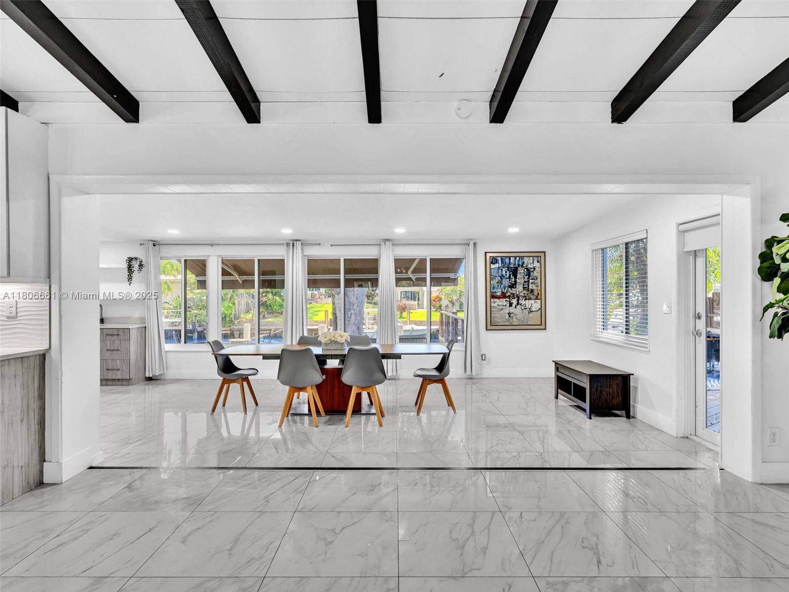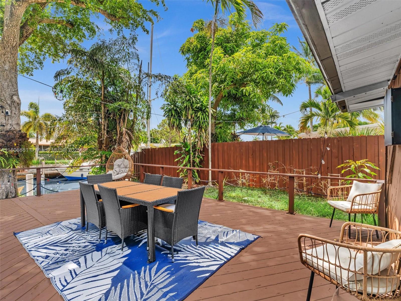 Attention Boaters!This stunning mid-century home in Lauderdale Isles offers ocean access with no fixed bridges, a perfect retreat for water lovers! This 3 bedrooms 2 bathrooms home welcomes you with an open floor plan and serene views that stretch straight out to your private backyard, deck, and dock. Step inside and feel the expansive layout from the living room through the kitchen and dining area. High vaulted ceilings with exposed beams, polished tile flooring throughout, plenty of natural light. Custom kitchen complete with handmade cabinets, quartz countertops, and high-end appliances. Entertain at the wet bar in the dining area while taking in the views. Ideal for Primary Residence, Investment, or Airbnb Opportunity.