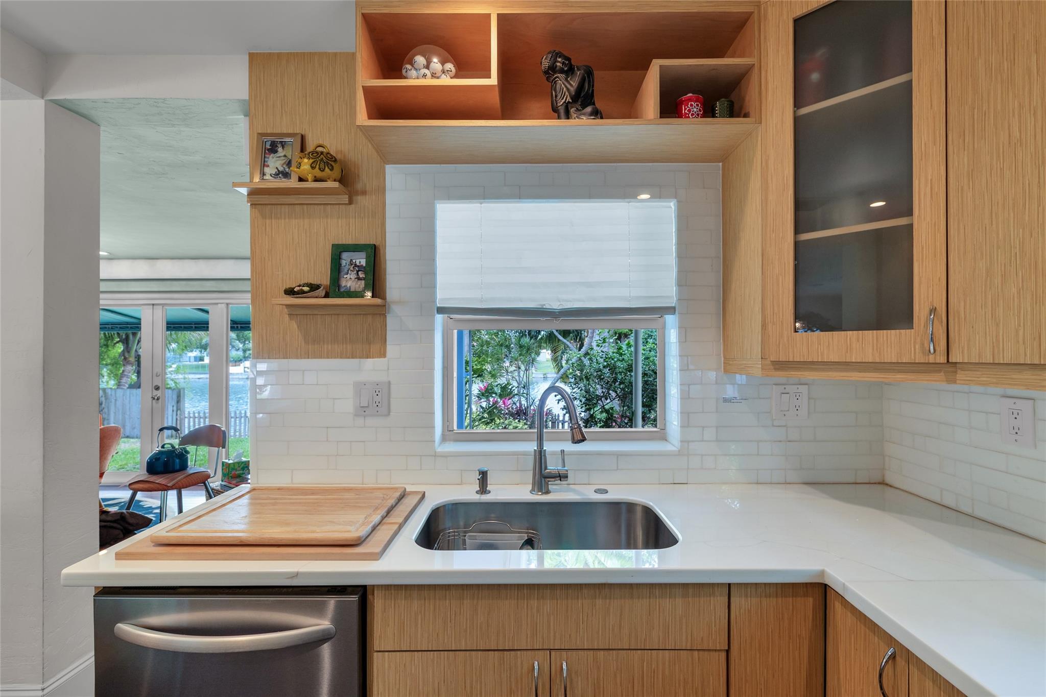 GORGEOUS 2 BED 2 BATH 1 CAR GARAGE LAKE FRONT HOME FEATURING DESIGNER TOUCHES THROUGHOUT!!! GREAT POINSETTIA HEIGHTS NEIGHBORHOOD WITH SPECTACULAR CHARM AND WATER VIEWS! GLASS TILE AND COUNTER TOPS WITH APPLIANCES FACED WITH KITCHEN CABINET PANELS THAT GIVE A SEAMLESS FLOW. GORGEOUS WOOD FLOORING THROUHOUT MAIN LIVING AREAS AND CERAMIC TILE IN KITCHEN AND BATHS. LARGE LAUNDRY/STORAGE ROOM LEADING TO 1 CAR GARAGE. BRIGHT OPEN LAYOUT WITH WATER VIEWS FROM MOST EVERY ROOM. HURRICANE IMPACT DOORS & WINDOWS THROUHOUT. S-TILE ROOF AND REAL CHICAGO BRICK PATIO AND WALK WAYS FLOWING THROUGH THE LANSCAPE. LAKE FED SPRINKLER SYSTEM, NO RUST STAINS! NEWER EXTERIOR UP LIGHTING CREATES WARM AMBIANCE. CLOSE TO FORT LAUD BEACH, I-95, FLL AIRPORT AND GALLERIA MALL SHOPS & RESTAURANTS.