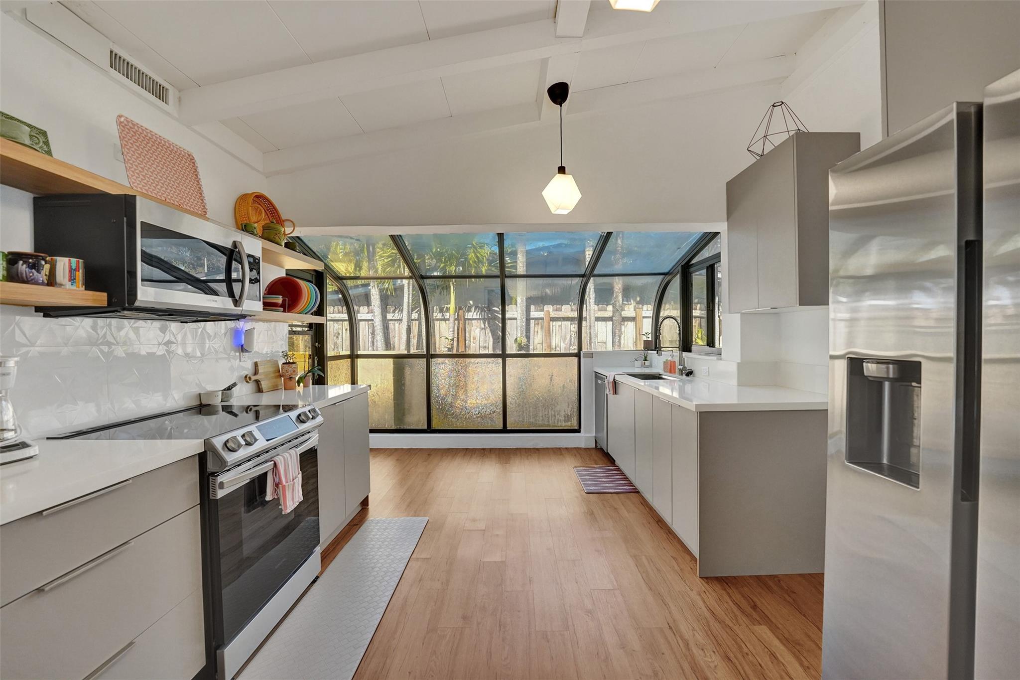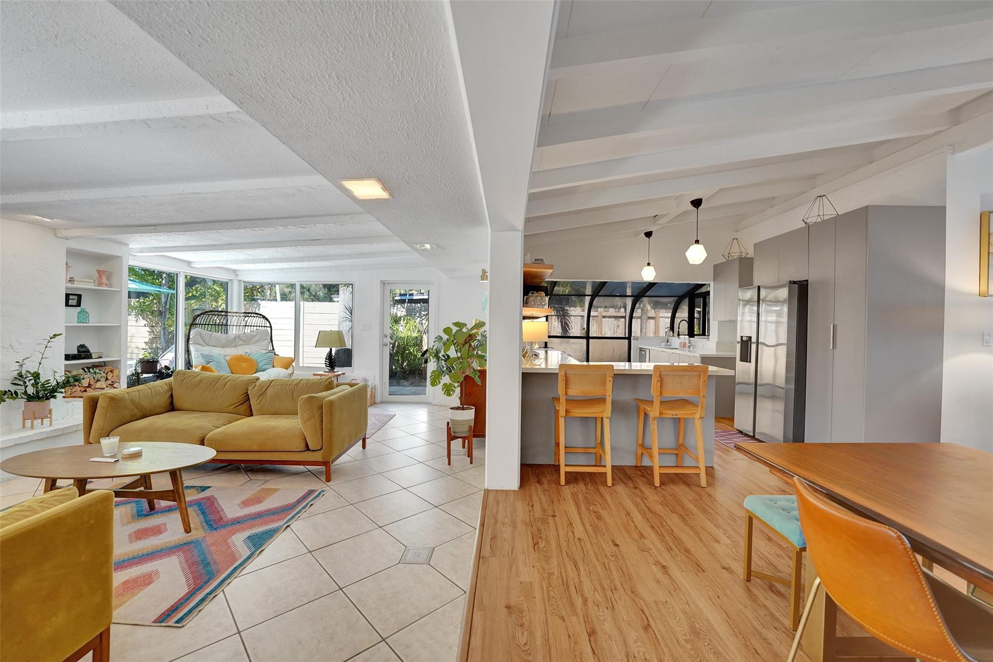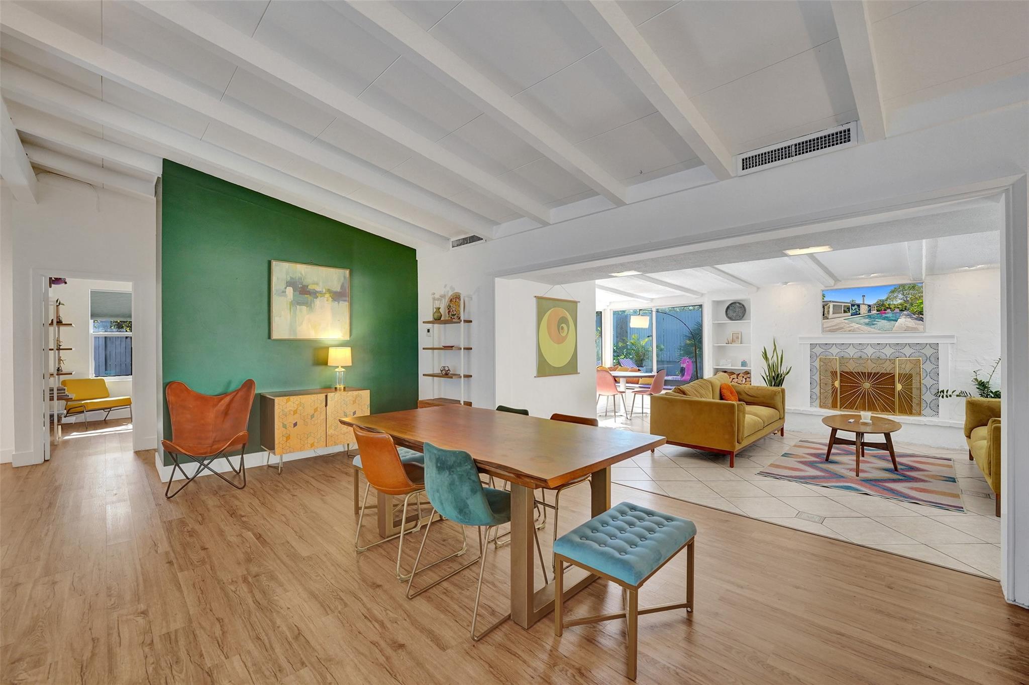 Stylish Mid-Century Modern Oasis – Fully Renovated This stunning 1-story mid-century modern pool home was completely renovated in 2021, with a new pool added in 2023. Perfect as a primary home or turnkey short-term rental, it features vaulted beam ceilings, wood/ceramic floors, impact windows/doors, newer AC, PVC plumbing, and remodeled baths. The sleek kitchen boasts quartz counters, stainless appliances, and opens to a spacious Florida room with a fireplace. Enjoy a lush, private backyard with gated access to a park and boat ramp. Minutes to the beach and downtown Fort Lauderdale!