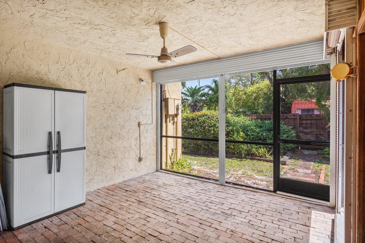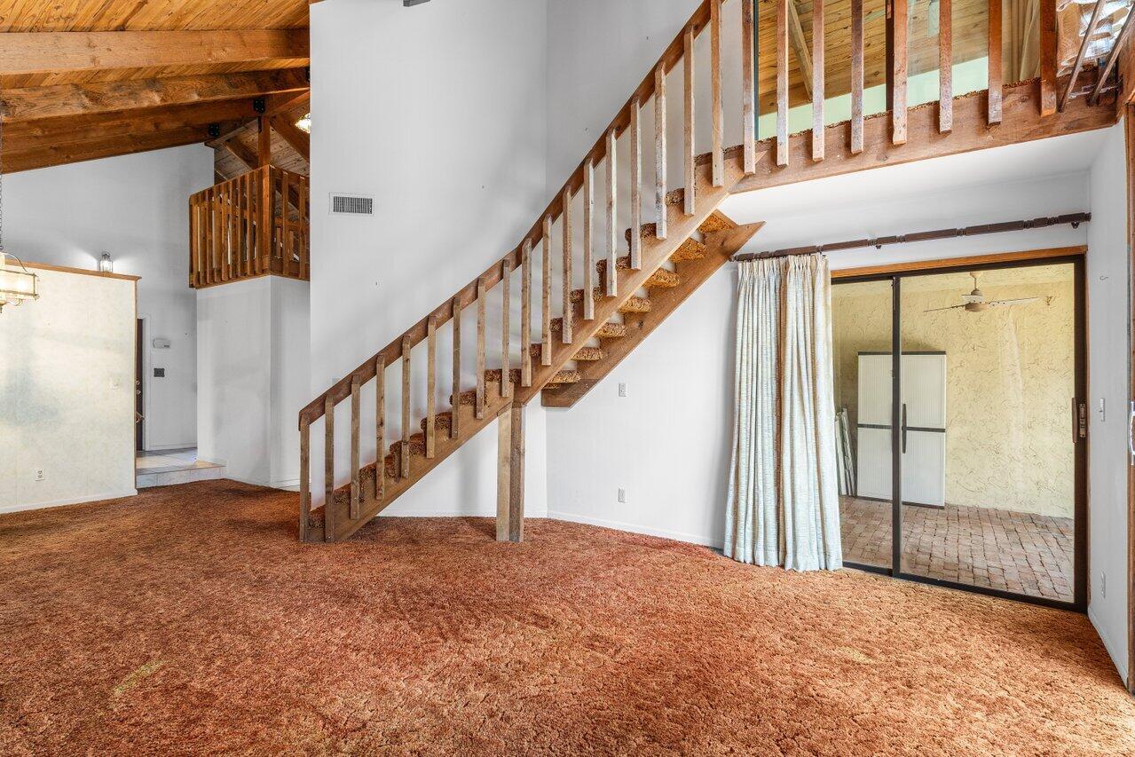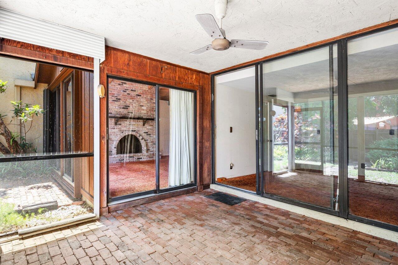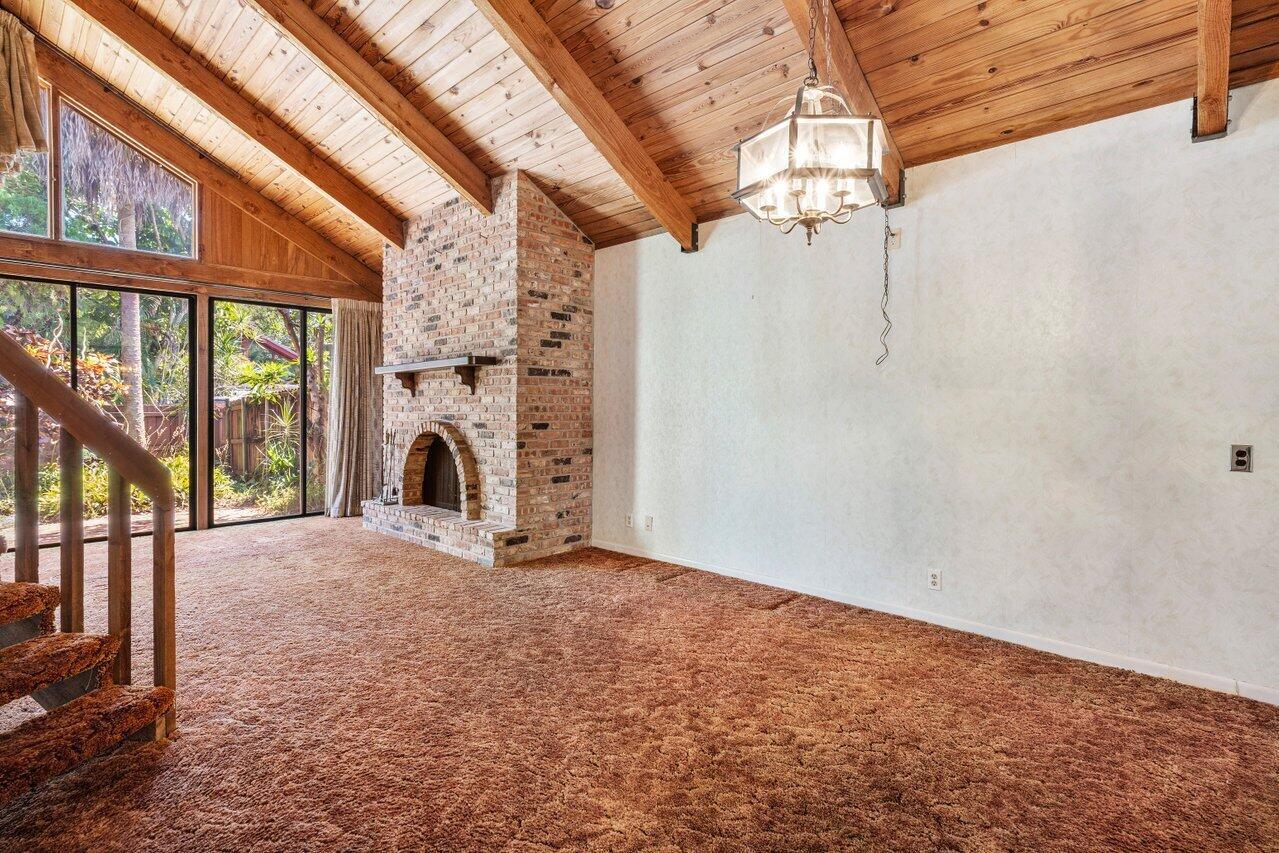 Welcome to your 3-bedroom, 2-bathroom townhome in The Lofts of Palm Aire! This spacious corner unit offers a rare opportunity with its private, fenced backyard and an inviting open floor plan. Floor-to-ceiling sliders fill the space with warm, natural light, while a striking stone fireplace serves as the perfect centerpiece. Stunning wood aligned vaulted ceilings and beams. The primary suite and loft are located upstairs, featuring a massive walkthrough closet leading to your own private sitting area. Enjoy the convenience of an in-unit laundry room with a full-sized washer and dryer. Step outside to a large screened-in patio overlooking a beautifully landscaped Florida-style backyard. Additional features include newer Front door, AC 2021, ample closets and accordion shutters.