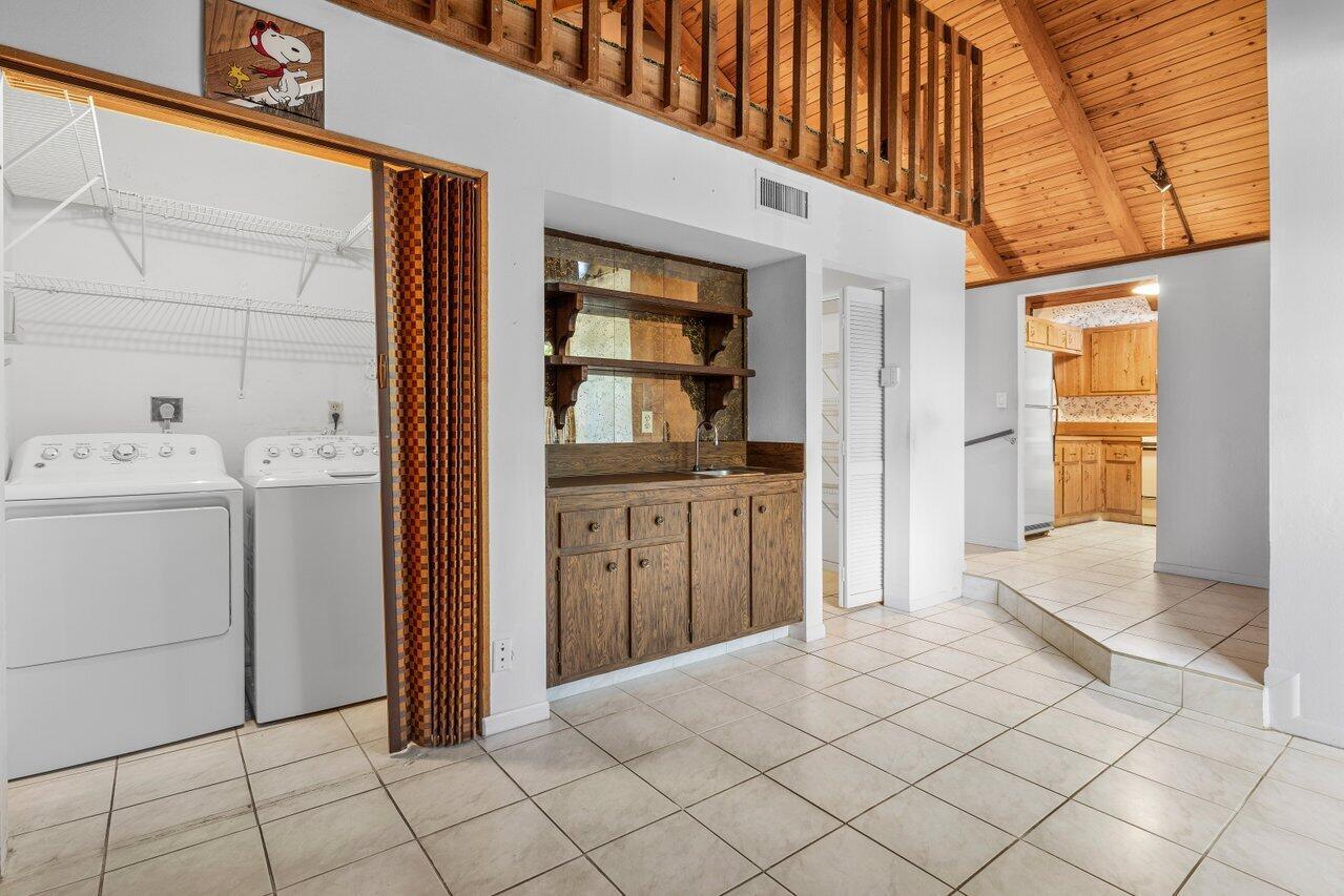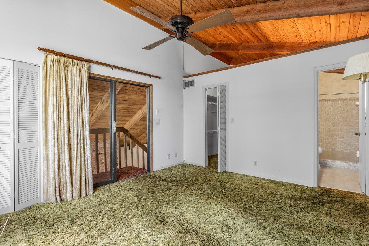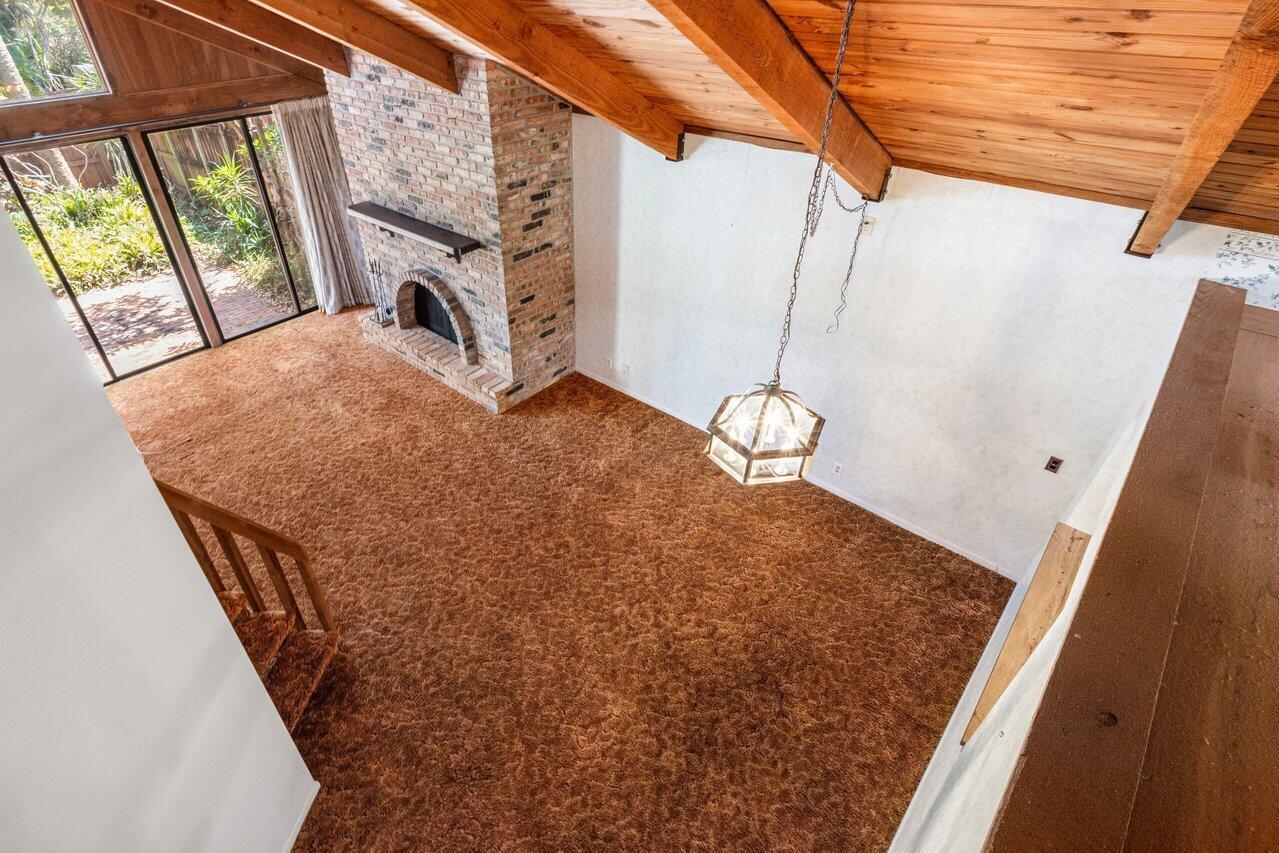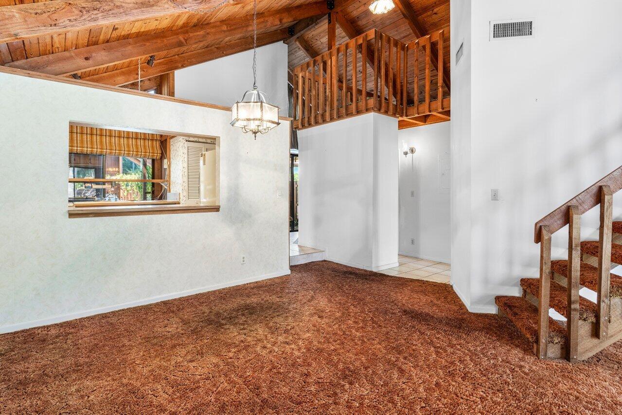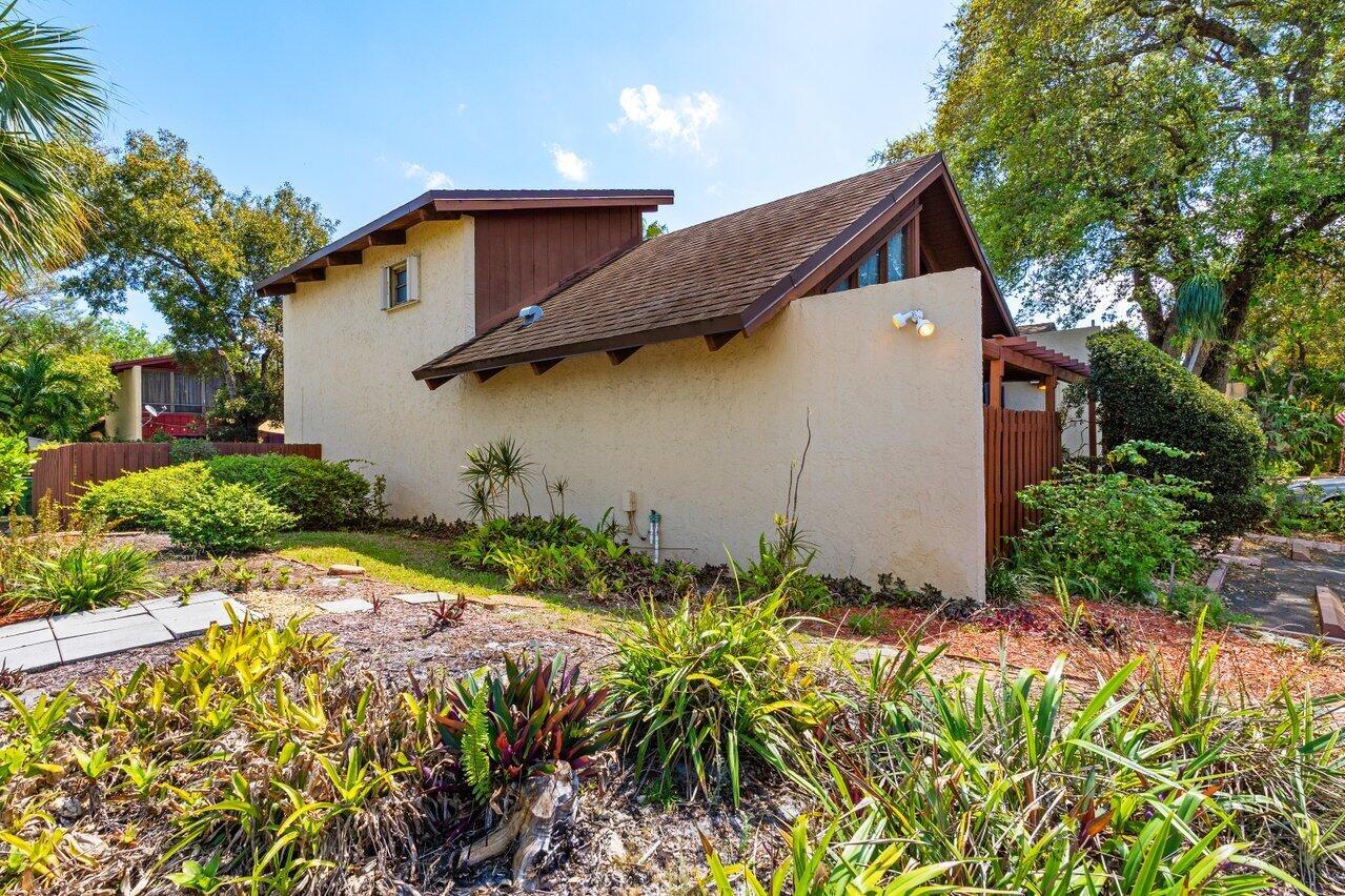Welcome to your 3-bedroom, 2-bathroom townhome in The Lofts of Palm Aire! This spacious corner unit offers a rare opportunity with its private, fenced backyard and an inviting open floor plan. Floor-to-ceiling sliders fill the space with warm, natural light, while a striking stone fireplace serves as the perfect centerpiece. Stunning wood aligned vaulted ceilings and beams. The primary suite and loft are located upstairs, featuring a massive walkthrough closet leading to your own private sitting area. Enjoy the convenience of an in-unit laundry room with a full-sized washer and dryer. Step outside to a large screened-in patio overlooking a beautifully landscaped Florida-style backyard. Additional features include newer Front door, AC 2021, ample closets and accordion shutters.
