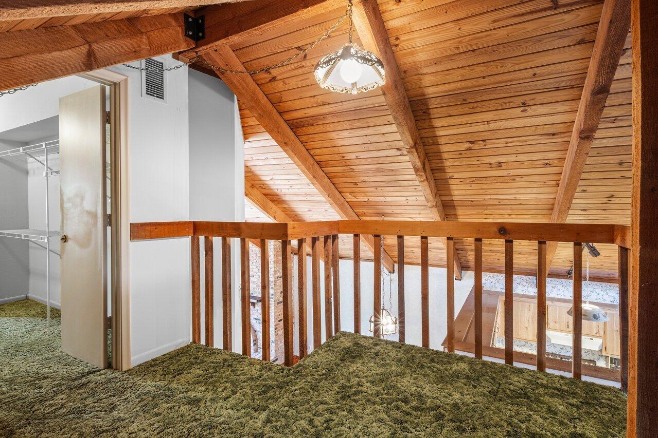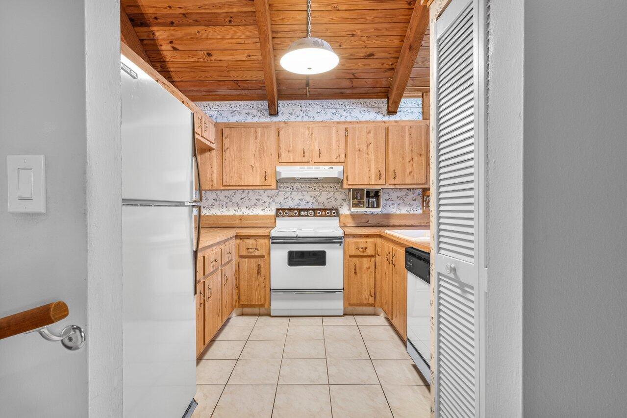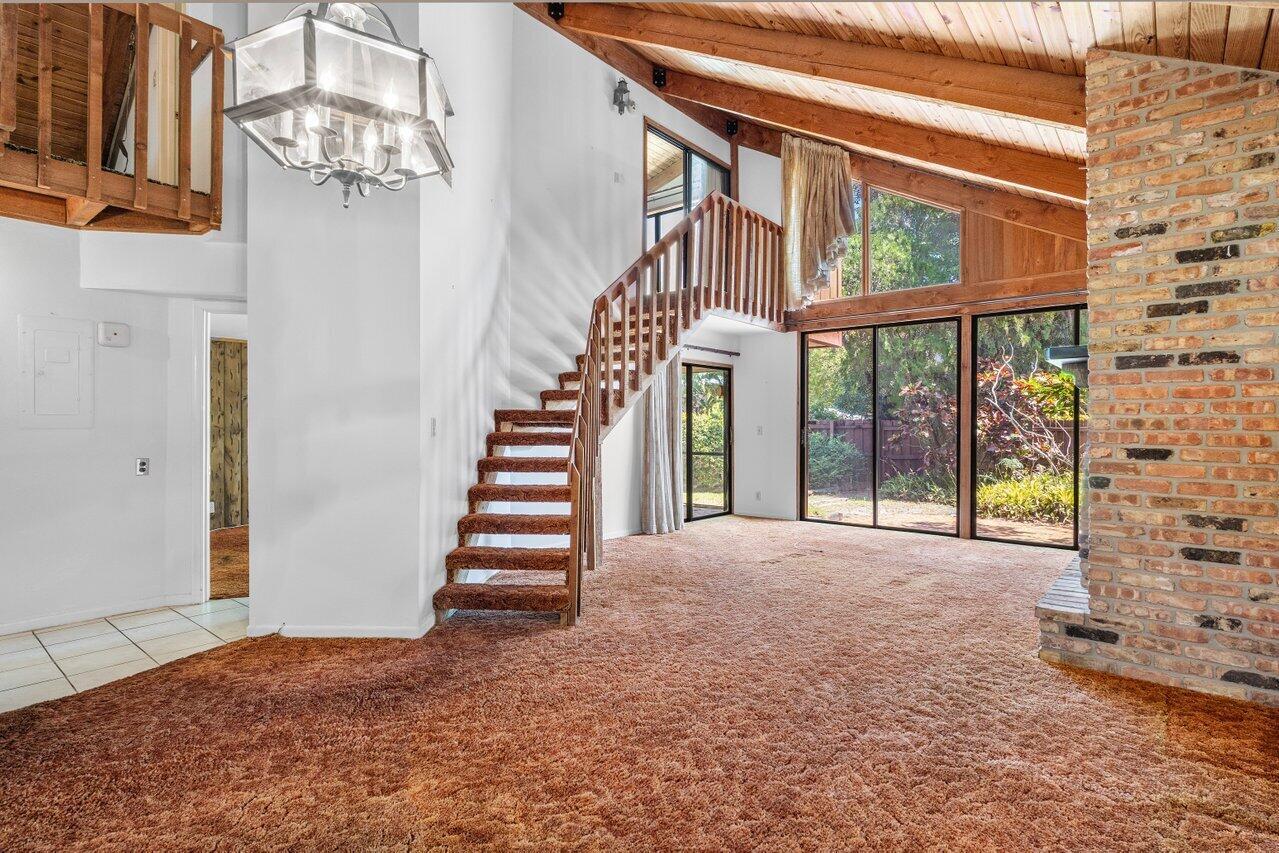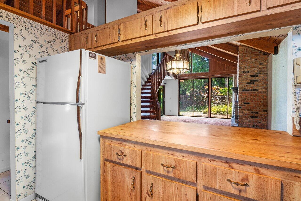 Welcome to your 3-bedroom, 2-bathroom townhome in The Lofts of Palm Aire! This spacious corner unit offers a rare opportunity with its private, fenced backyard and an inviting open floor plan. Floor-to-ceiling sliders fill the space with warm, natural light, while a striking stone fireplace serves as the perfect centerpiece. Stunning wood aligned vaulted ceilings and beams. The primary suite and loft are located upstairs, featuring a massive walkthrough closet leading to your own private sitting area. Enjoy the convenience of an in-unit laundry room with a full-sized washer and dryer. Step outside to a large screened-in patio overlooking a beautifully landscaped Florida-style backyard. Additional features include newer Front door, AC 2021, ample closets and accordion shutters.