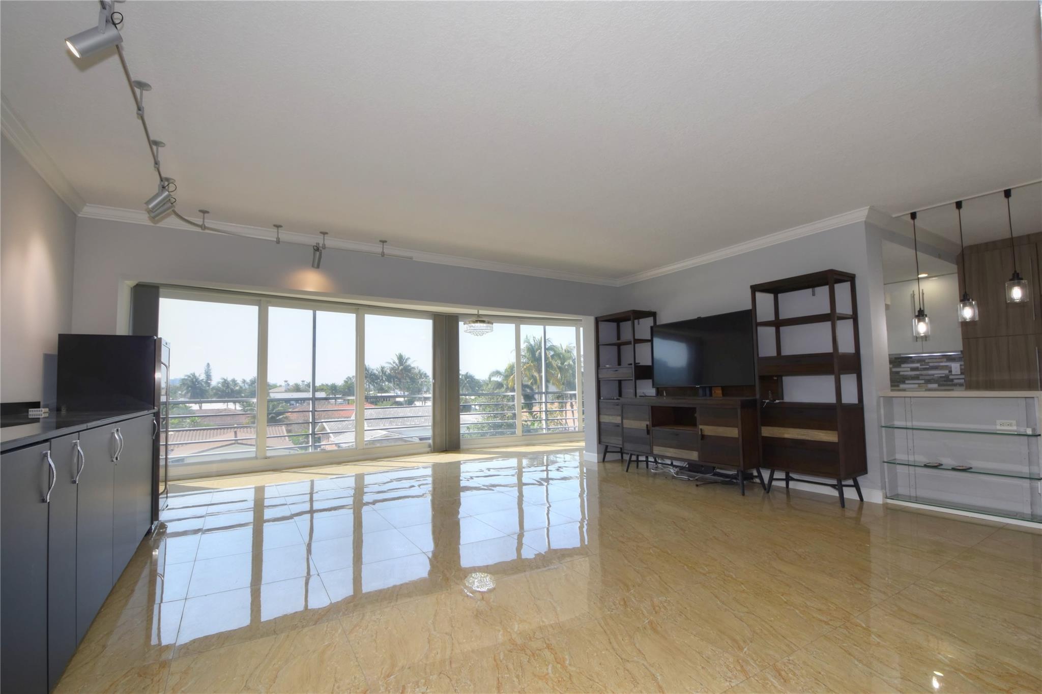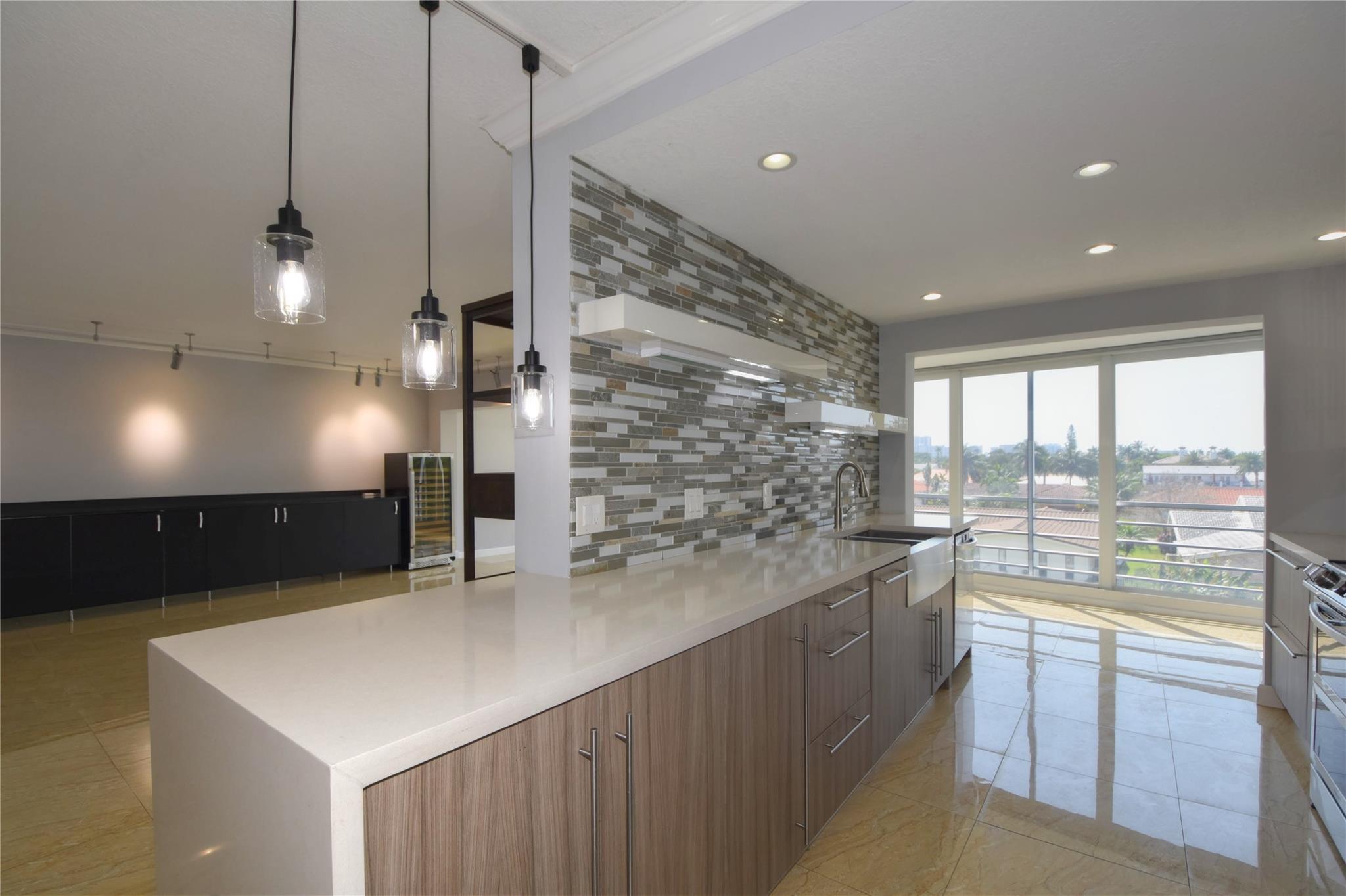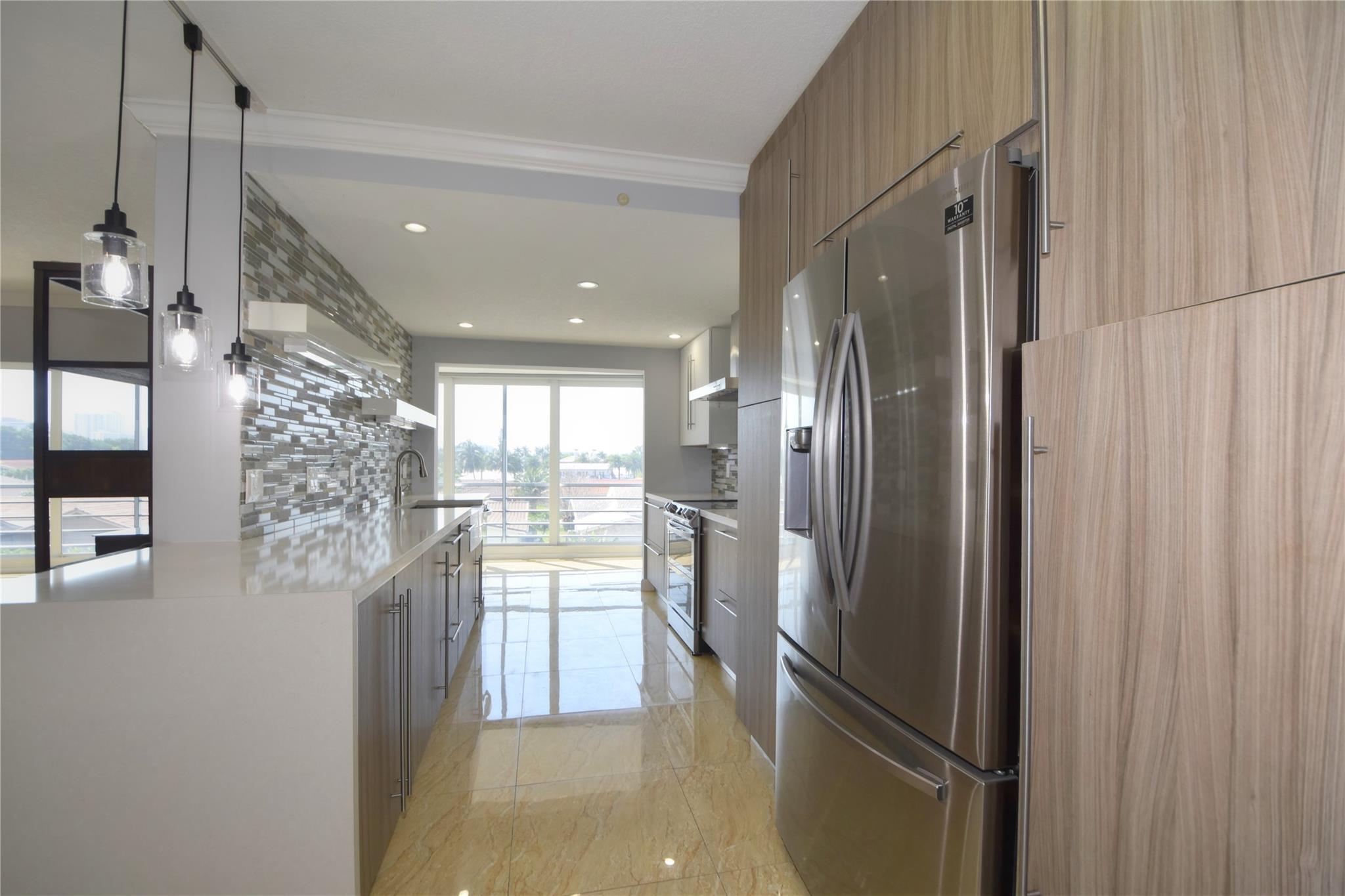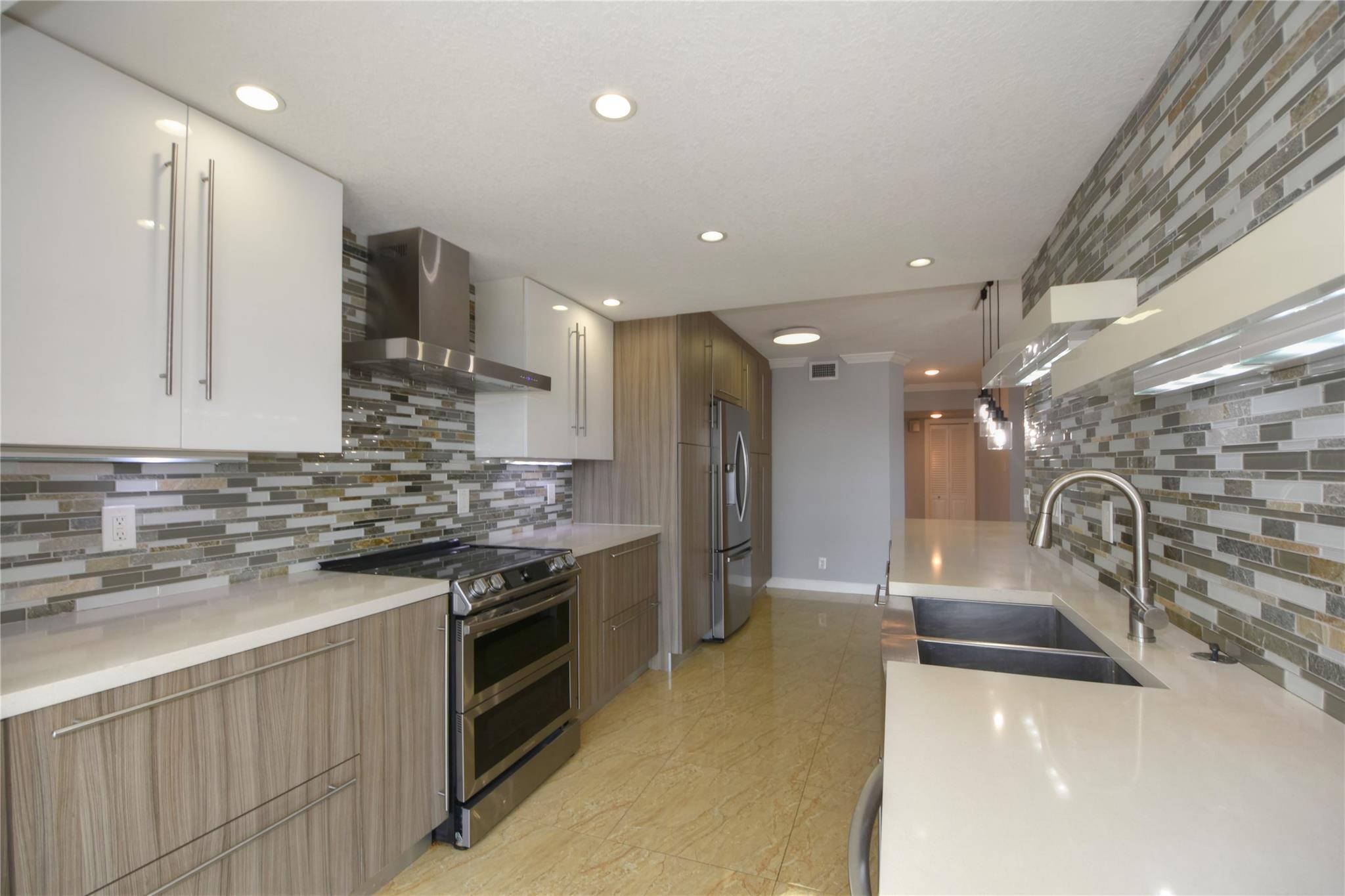 This waterfront beauty has it all with the perfect central location - walk to the beach, lots of restaurants, medical facilities nearby, easy access to all major highways, 1/2 hour to the airport and cruise port. Not only that, it is HUGE with 1,481 sf PLUS a 319 sf Florida room, under building deeded parking, full size w/d in unit, hurricane windows, storage locker, community room, heated pool, and dockage when available. Walk into this freshly painted, fully remodeled contemporary unit with stunning views. With all this you get a chef's kitchen w/ quartz countertops with waterfall edge, double oven, range hood, SS wrap front sink, dishwasher, separate wine fridge. Tile floors in LR/DR. Wood floors in both BRs. Primary suite has walk-in closet and vanity, tub/shower.