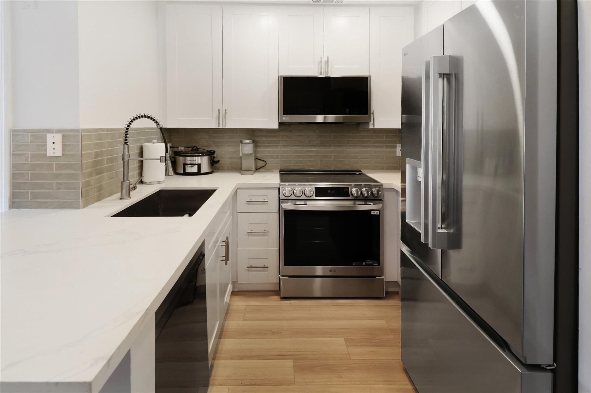 Fully renovated corner unit tri-level townhouse with high end appliances, open main level living room with sleek kitchen, quartz counters, stainless steel sink, and high end faucets. Move in ready. Complete renovation from top to bottom.