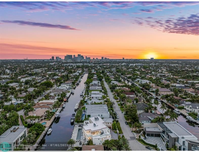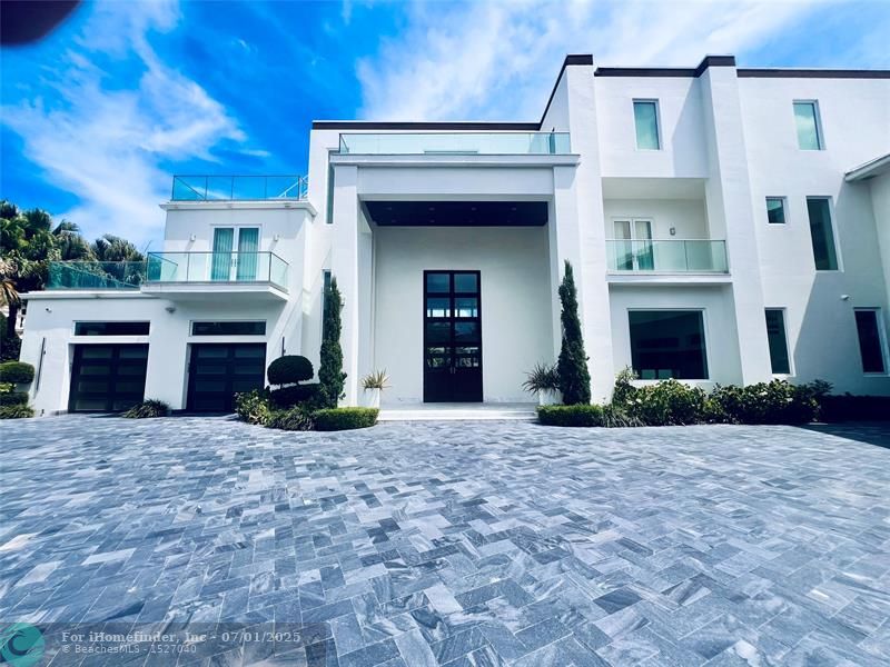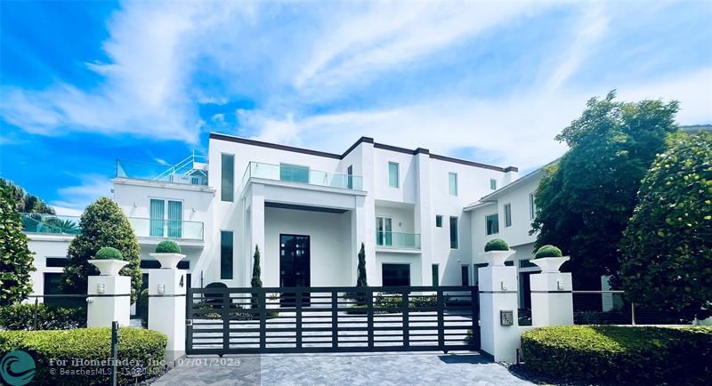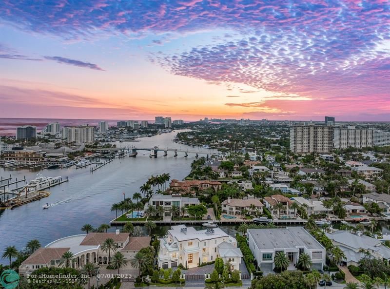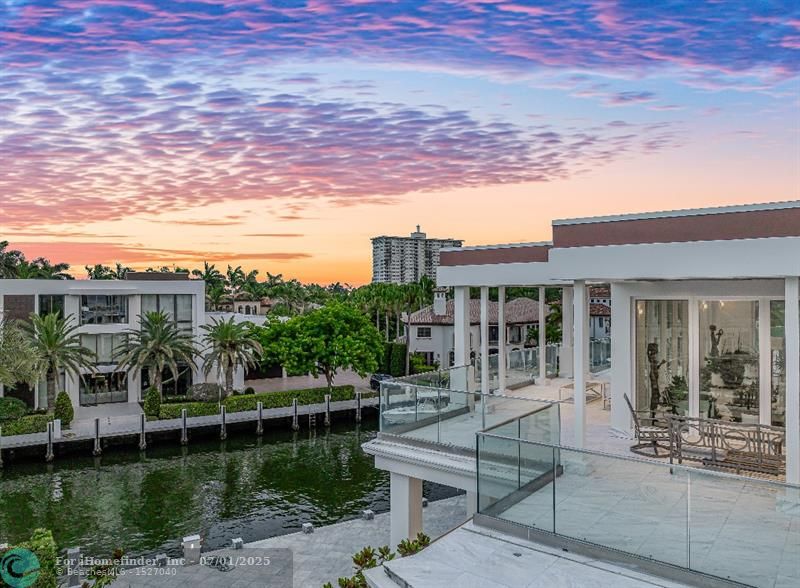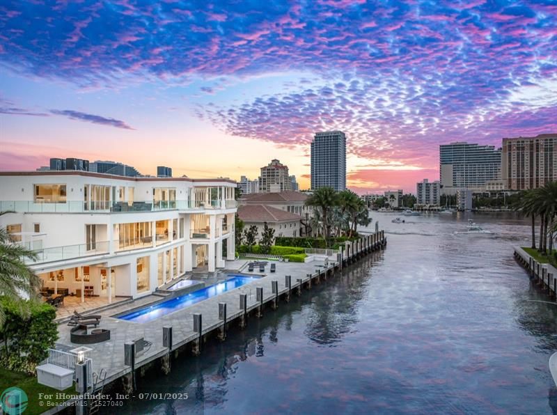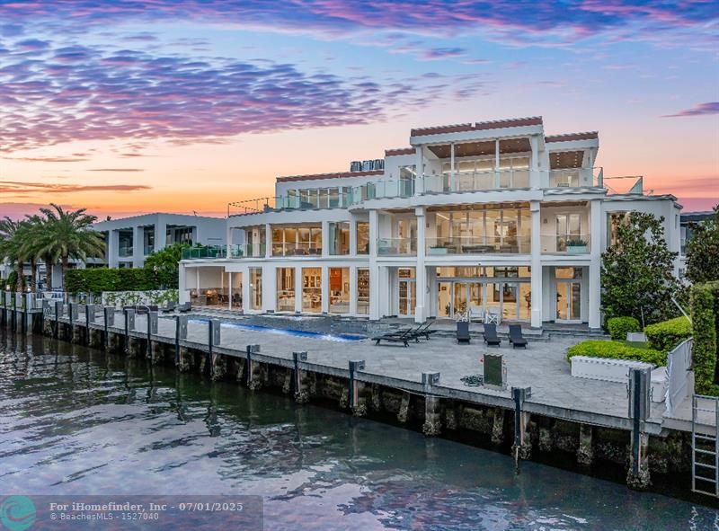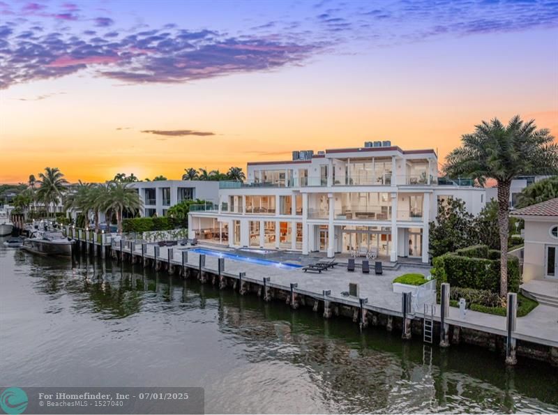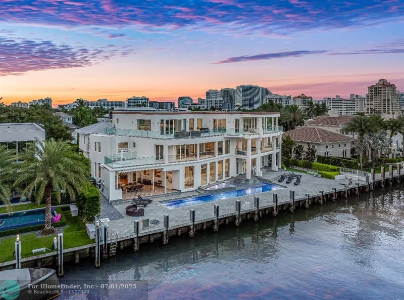 Exquisite LAS OLAS waterfront estate. Blends 3-story modern design, quality materials & craftsmanship, Intercoastal & skyline vistas, 140' deep water dockage & every luxury amenity: Chef's gas kitchen, top-of-the line appliances; bar, wine storage & tasting area; large formal dining, spacious family & living rooms perfect for displaying art & elegant yet casual living. 6-7 bedrooms; 2 master suites; spacious walk-in closets; home theater; game room & bar; large gym; 60' pool; office; 2000+ sq ft of outdoor decks with dramatic water & skyline views perfect for entertaining; outdoor kitchen; garage for 8 cars; gas generator; commercial glass elevator; walled & gated; security cameras, commercial storm water drainage system, quick ocean access, walk to beach. 7-Isles 24/7 guarded & patrolled.