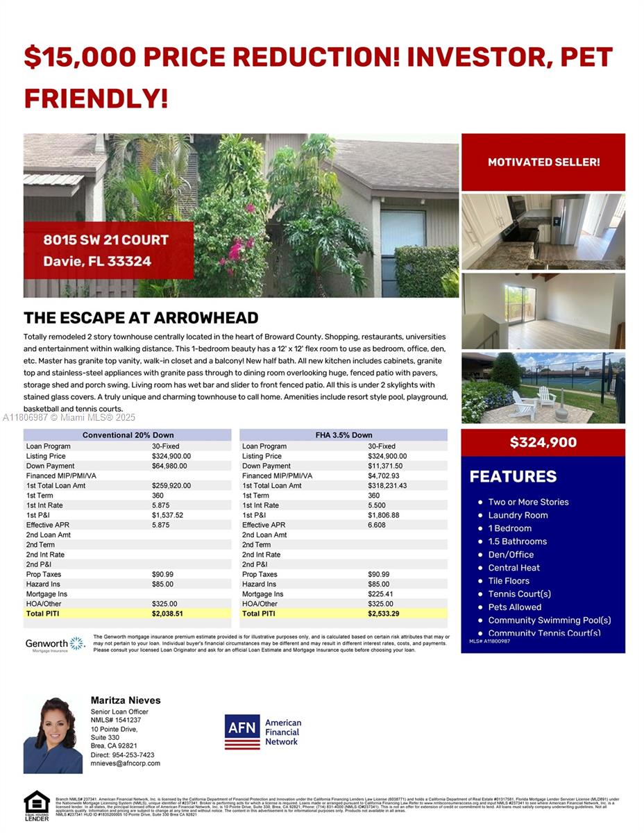 Remodeled 2-Story unique Townhouse located in the heart of Davie minutes from shopping, dining, universities & entertainment. Features 1 bedroom & 1.5 baths, plus a versatile 12'x12' flex room. Grea for a 2nd bedroom, office, den, etc. Master bedroom includes a walk-in closet, private balcony & granite-top vanity. Updated kitchen cabinets, granite countertops, stainless steel appliances & granite pass-thru to the dining area, which overlooks a large fenced paver patio with storage shed & porch swing. The living room has wet bar & sliding that lead to a front fenced patio. Natural light floods the home thru 2 beautiful skylights. Community amenities include resort-style heated & kiddie pool, playground, basketball, tennis courts, barbecue grills & on-site maint. Pet & investor-friendly!