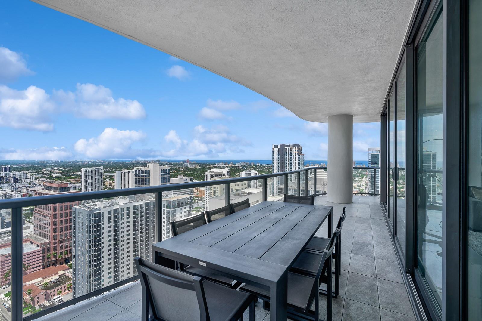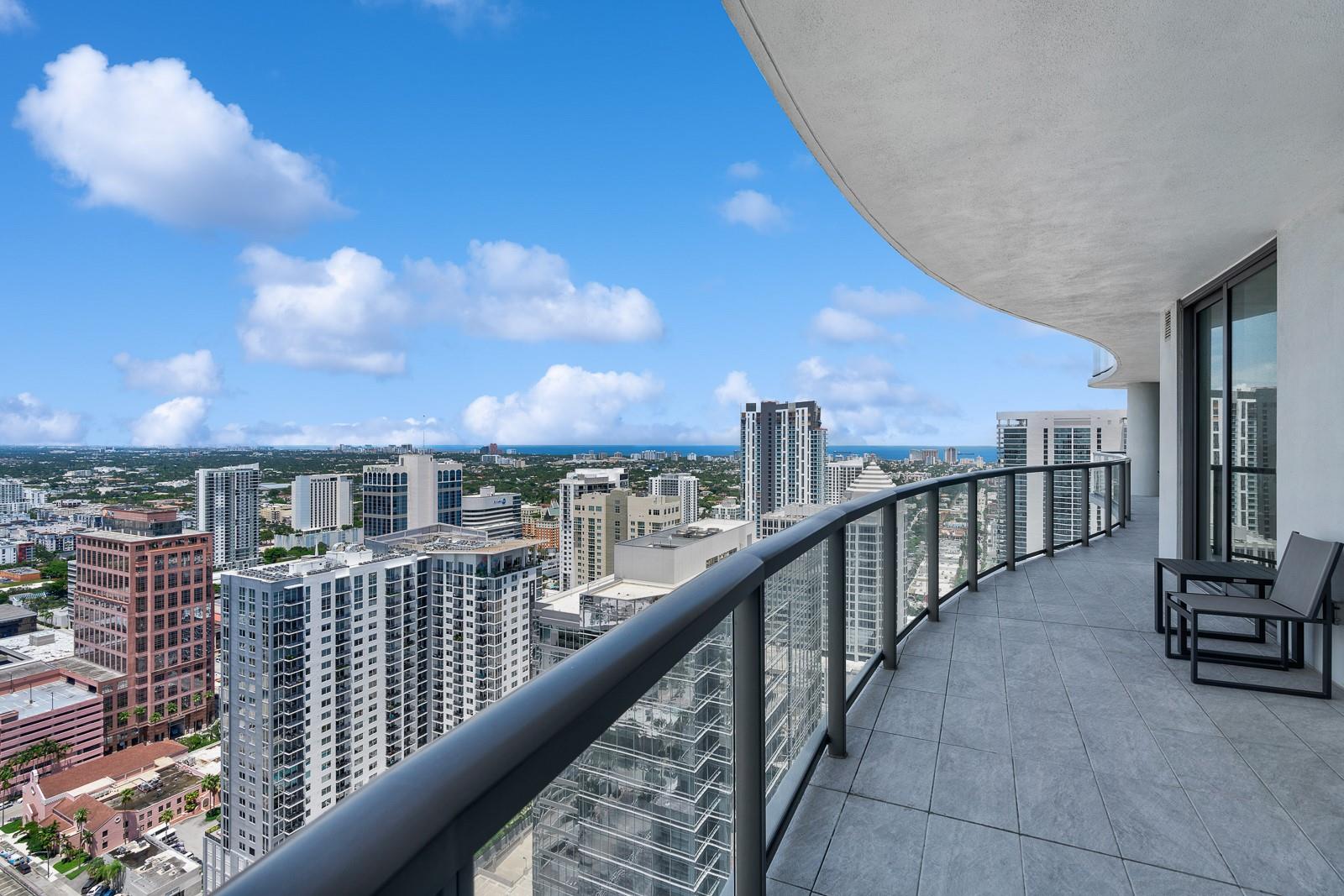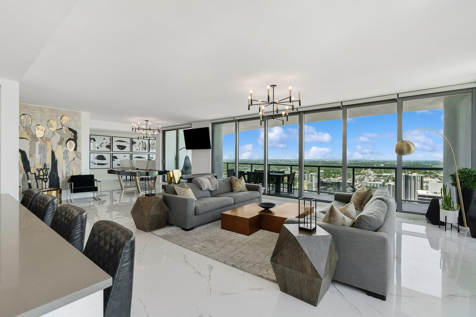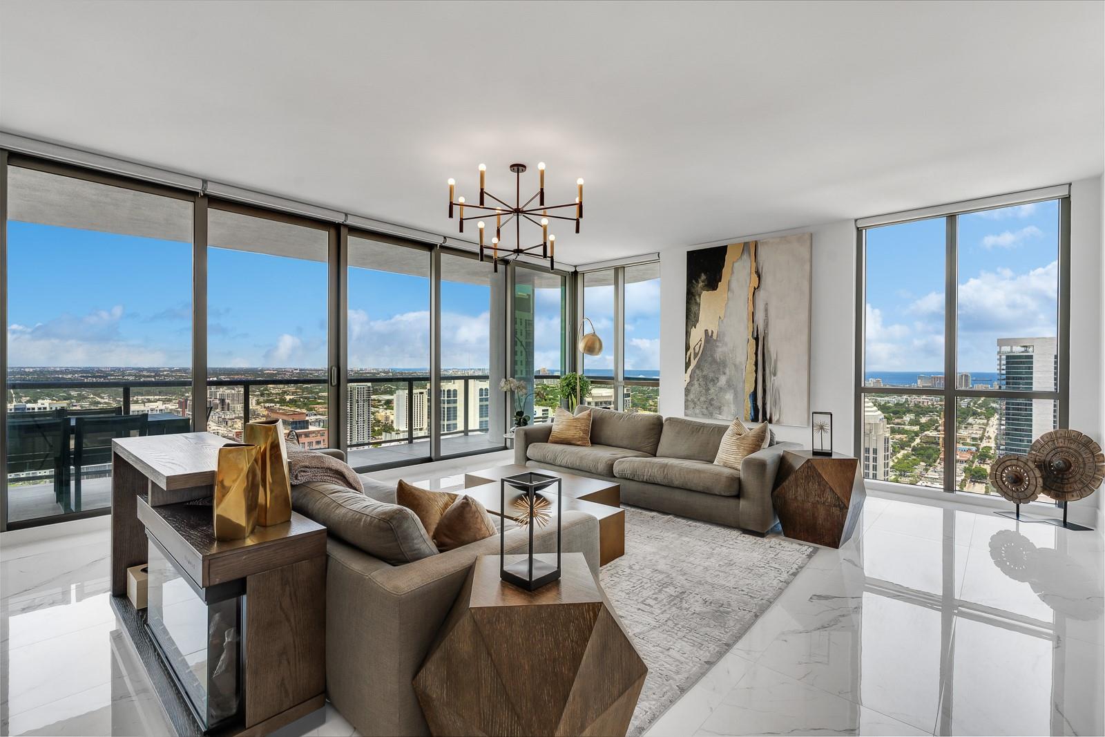 Soaring 40 stories above the city center, this exclusive residence is one of only six in the estate collection—offering unmatched privacy, sophistication, and breathtaking views of Fort Lauderdale's skyline. Floor-to-ceiling windows frame the cityscape, while a private elevator entrance and access-controlled entry points provide discreet, secure access. This expansive 4-bedroom, 4.5-bath layout includes a formal dining room, family room, and a theatre room. Designed for both comfort and elegance, the home features premium flooring, European kitchen cabinetry, quartz countertops, high-end fixtures, and private terraces with glass railings—perfectly positioned for uninterrupted views and seamless indoor-outdoor living and entertainment.