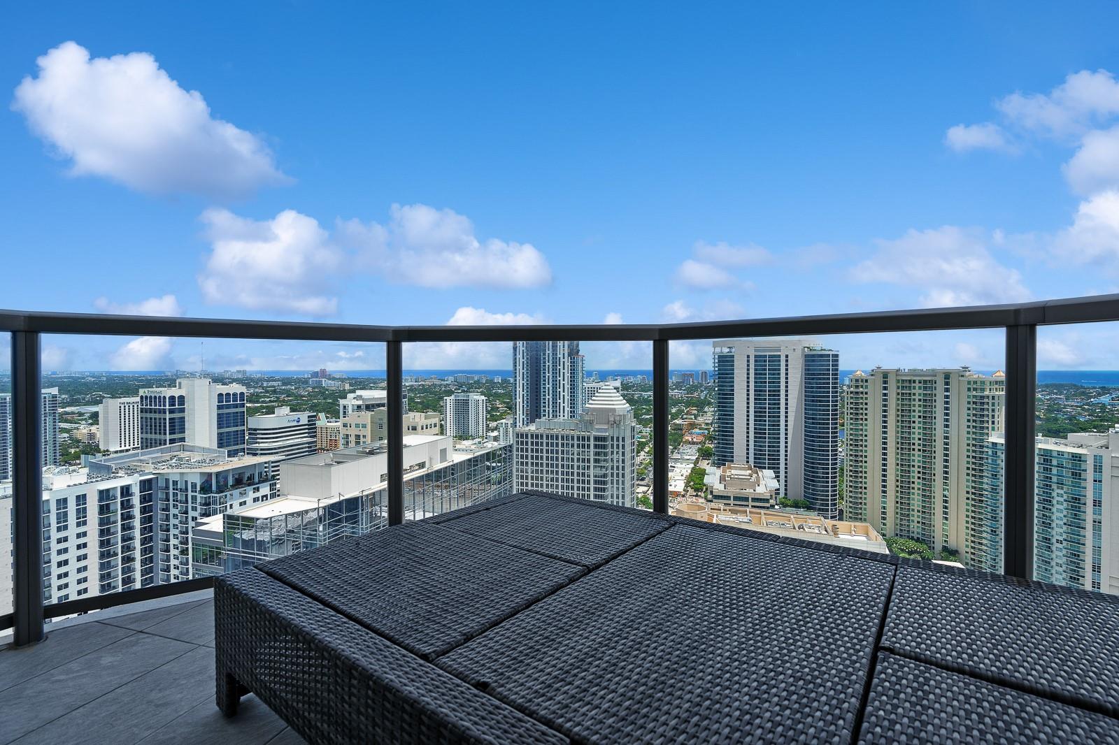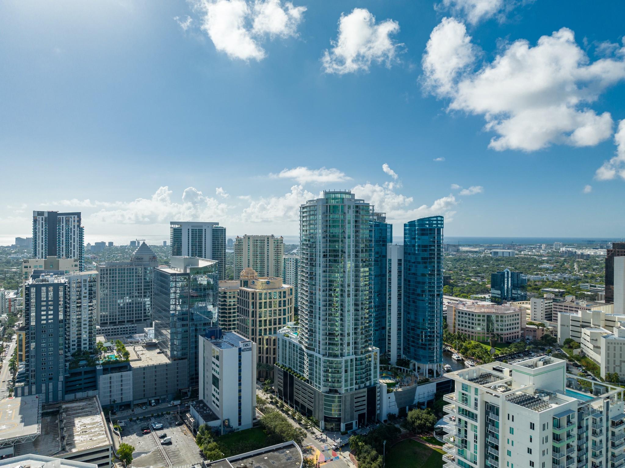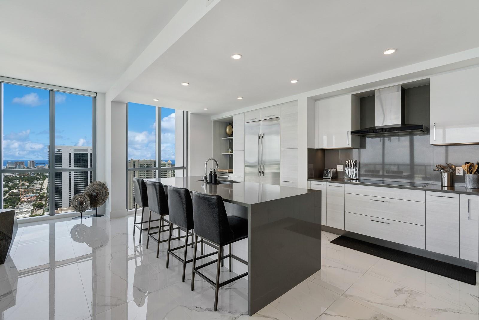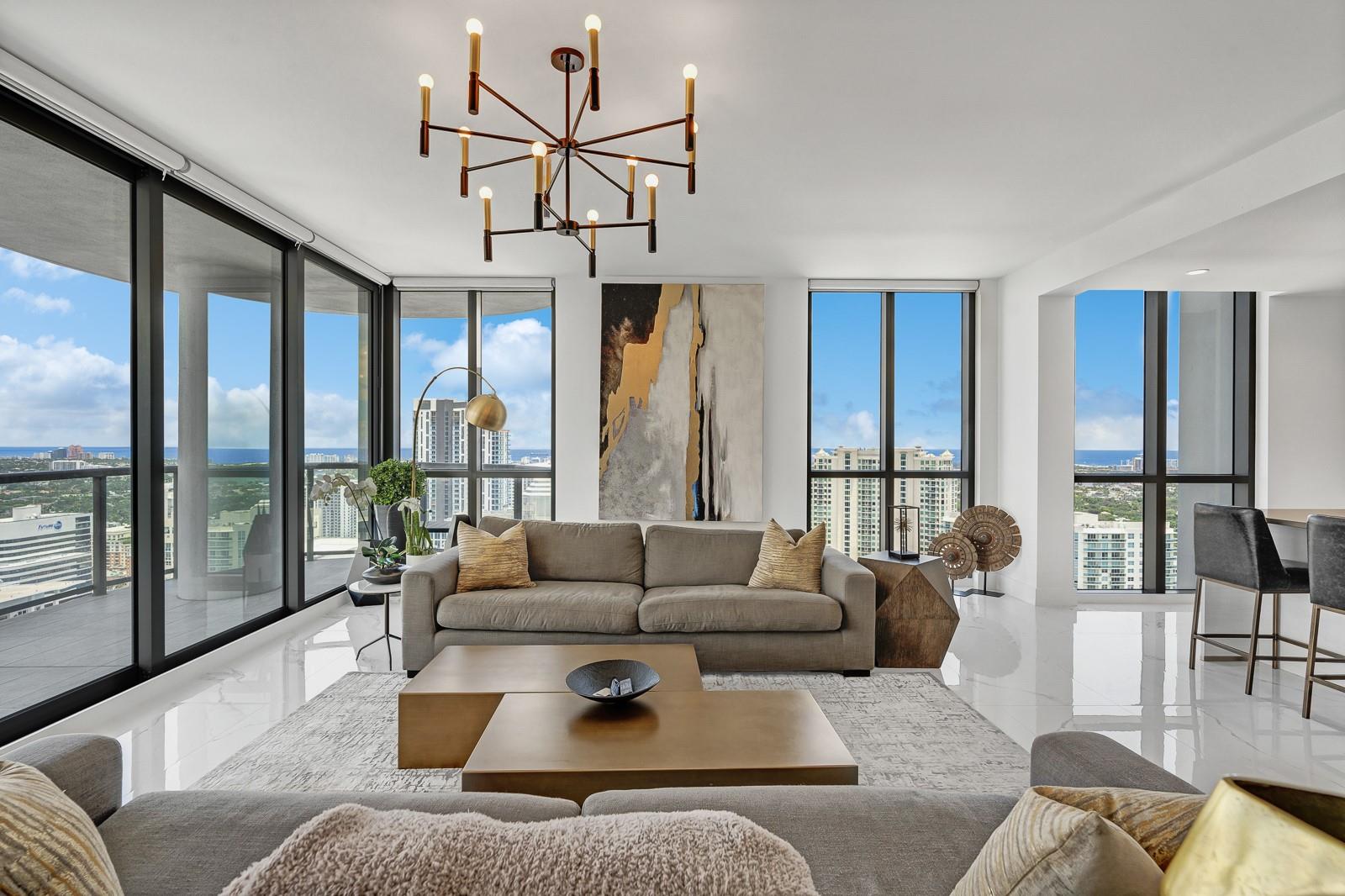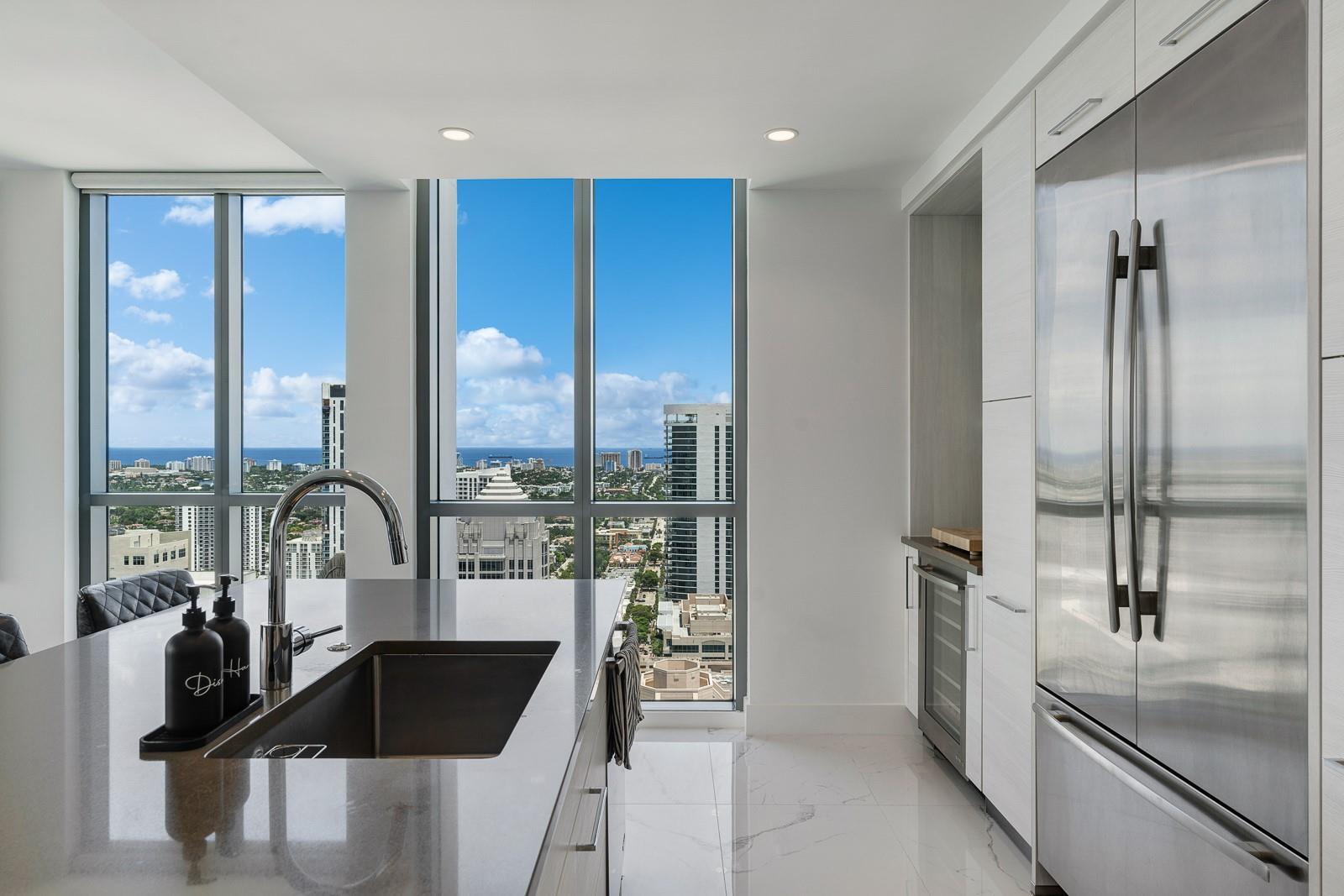 Soaring 40 stories above the city center, this exclusive residence is one of only six in the estate collection—offering unmatched privacy, sophistication, and breathtaking views of Fort Lauderdale's skyline. Floor-to-ceiling windows frame the cityscape, while a private elevator entrance and access-controlled entry points provide discreet, secure access. This expansive 4-bedroom, 4.5-bath layout includes a formal dining room, family room, and a theatre room. Designed for both comfort and elegance, the home features premium flooring, European kitchen cabinetry, quartz countertops, high-end fixtures, and private terraces with glass railings—perfectly positioned for uninterrupted views and seamless indoor-outdoor living and entertainment.