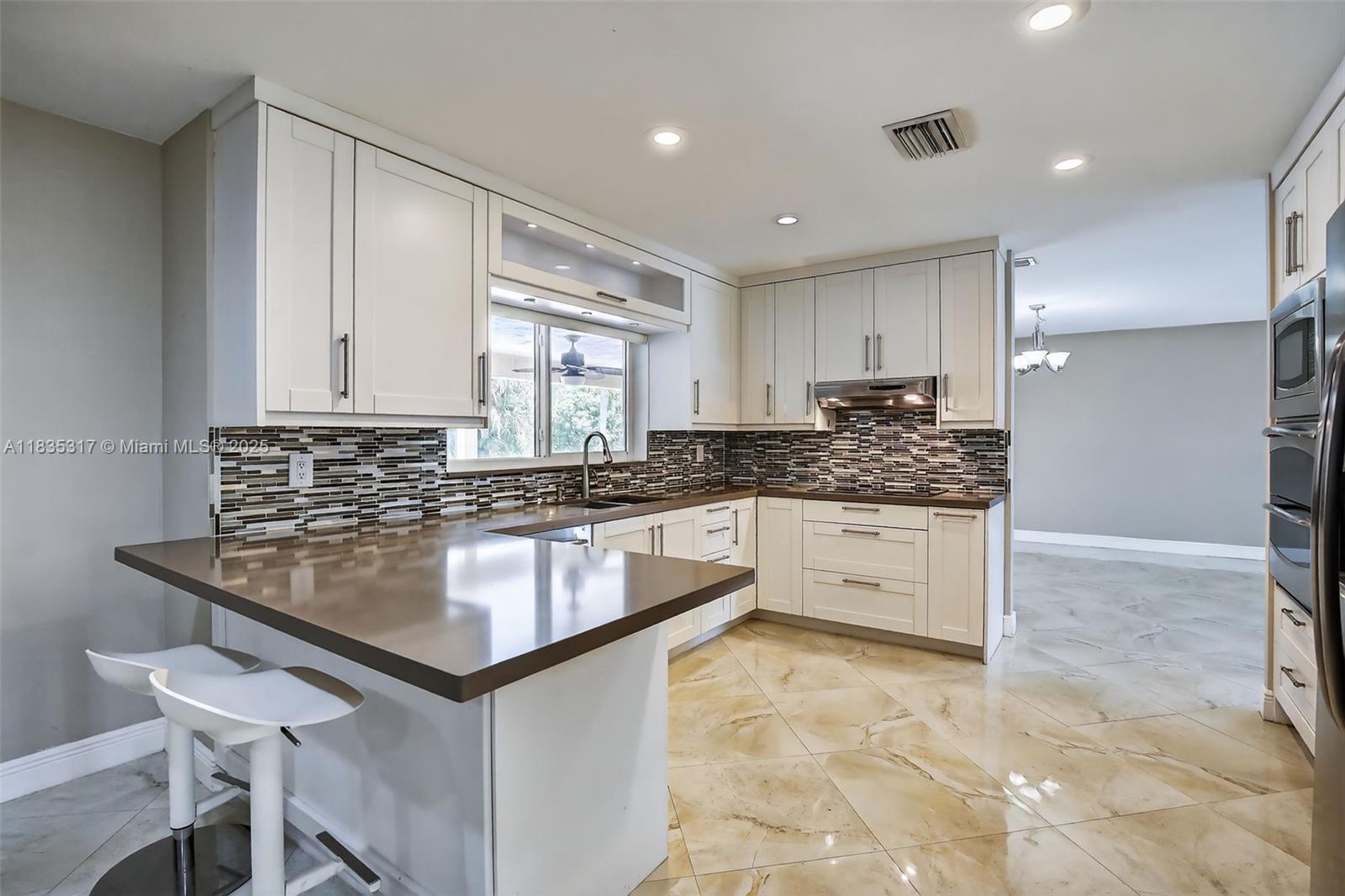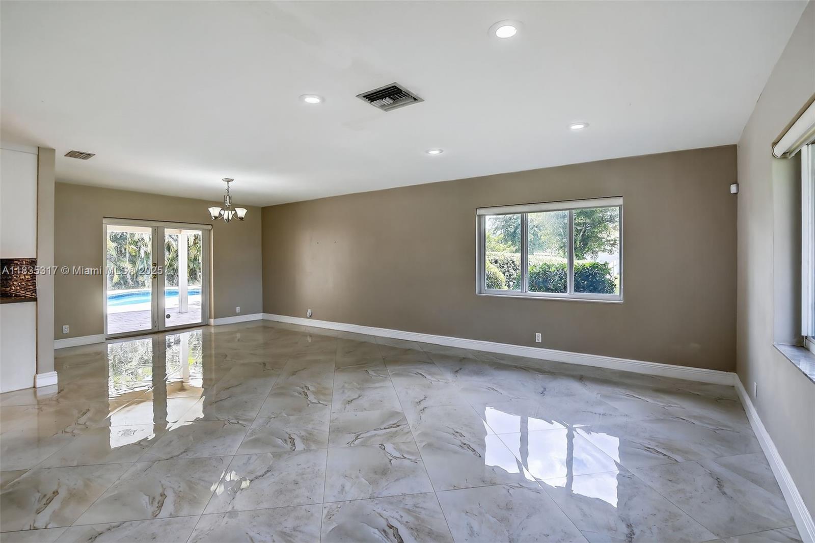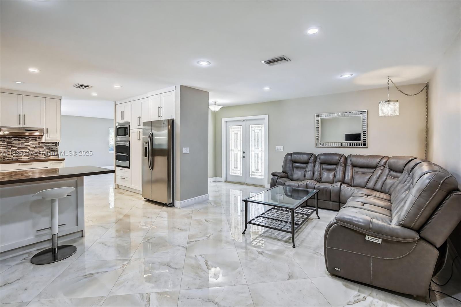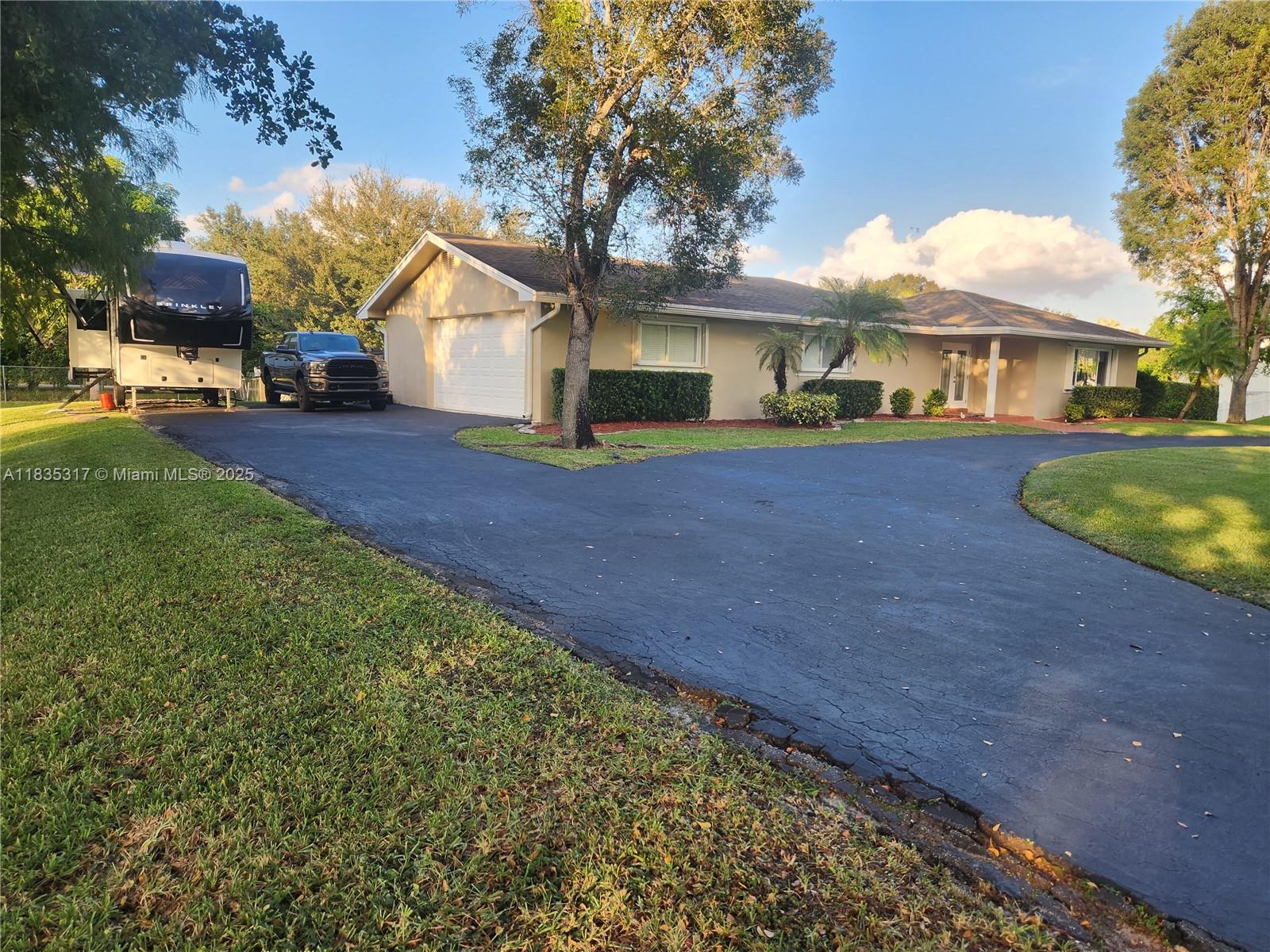 This great pool home in Davie is situated on a builder's acre in a private cul-de-sac. It features 3 bedrooms and 2 full bathrooms, a master bath with a frameless shower and a walk-in closet. This home offers porcelain tile flooring throughout. The updated kitchen boasts quartz countertops, a breakfast bar, and stainless steel appliances, and it seamlessly opens to both the living room and the family room. The spacious backyard includes a large stone paver deck and a covered patio surrounding a newly refinished free-form pool, all within a fully fenced yard. For added safety, the home is equipped with hurricane protection for all windows and doors. Conveniently located, this property is close to a variety of parks, dining, and entertainment options, and it lies within an A+ school district