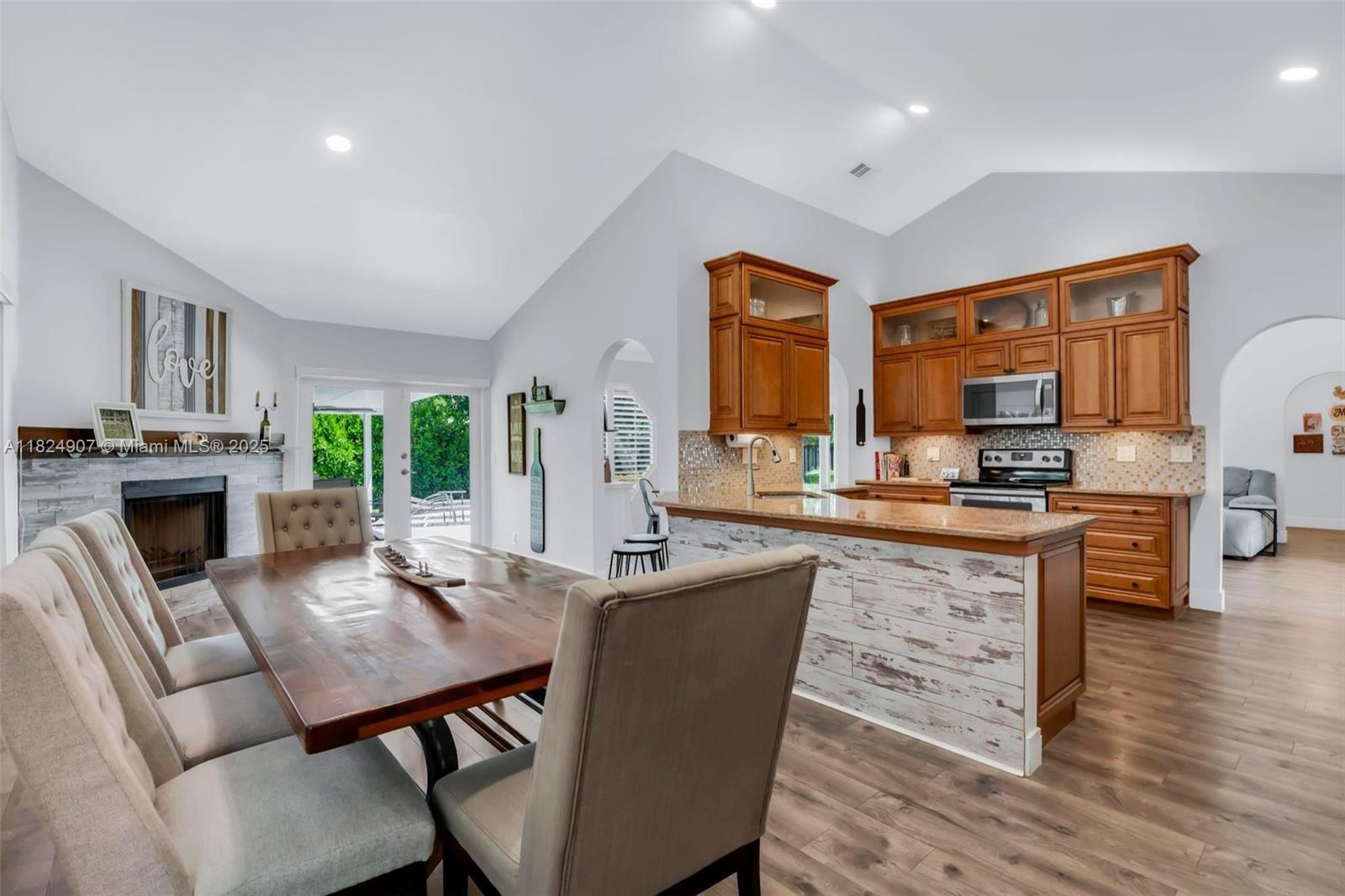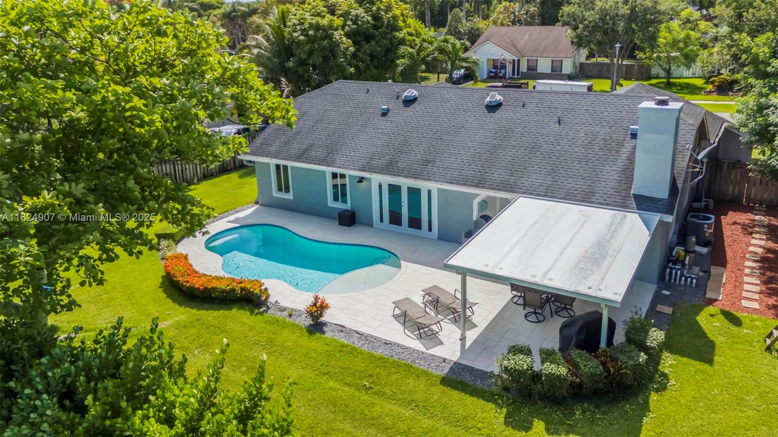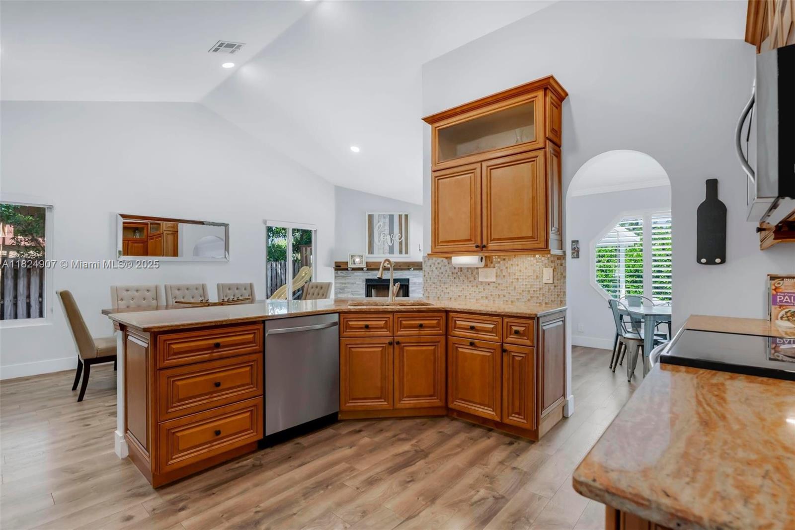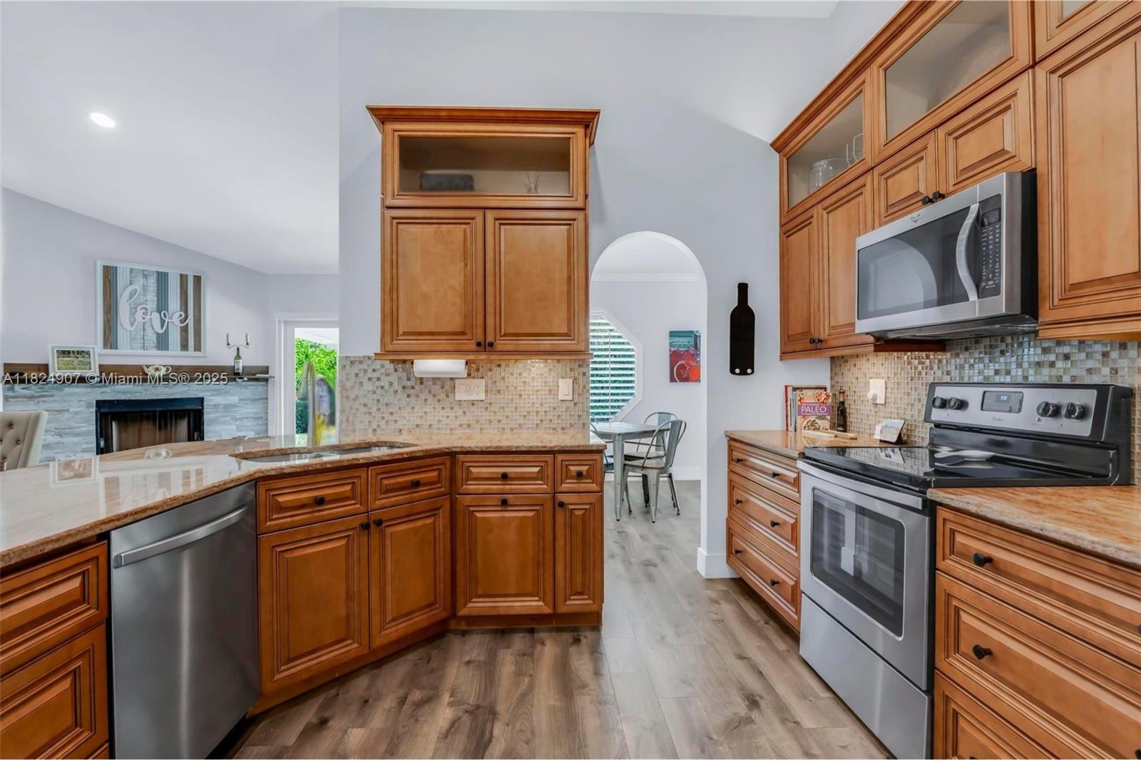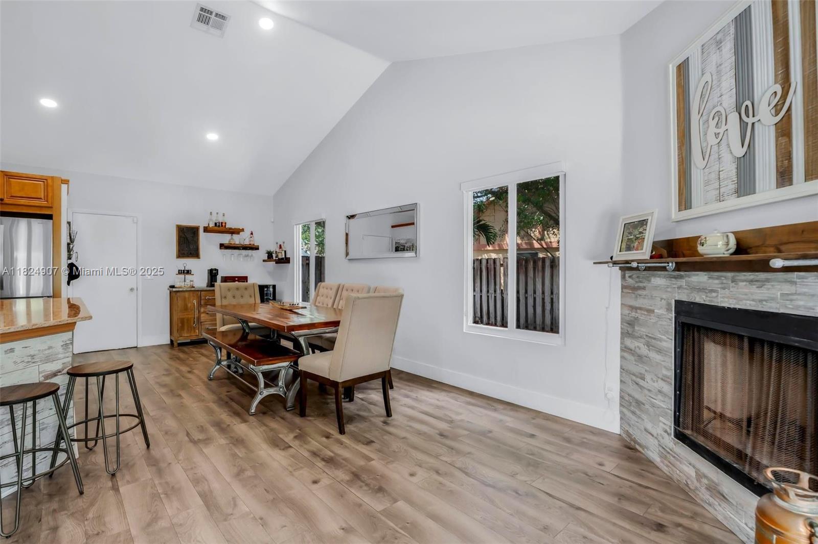 Tucked in the beautiful community of New River, this 3-bedroom, 2-bath stunner blends comfort with style. Soaring ceilings and large windows fill the home with lots of natural light. Warm laminate wood floors, a cozy fireplace, and an open layout make it perfect for everyday living and entertaining. The kitchen features granite counters, stainless steel appliances, and custom cabinets. The bathrooms have a clean, modern look, and each bedroom includes walk-in closets for plenty of storage. This waterfront home is a true retreat with lush landscaping creating a private & spacious oasis, a covered patio, and a sparkling pool(2020). Close to parks, shopping, dining, and top schools. With impact windows & AC 2024, this home checks all the boxes for comfort, convenience, & charm with a low HOA.