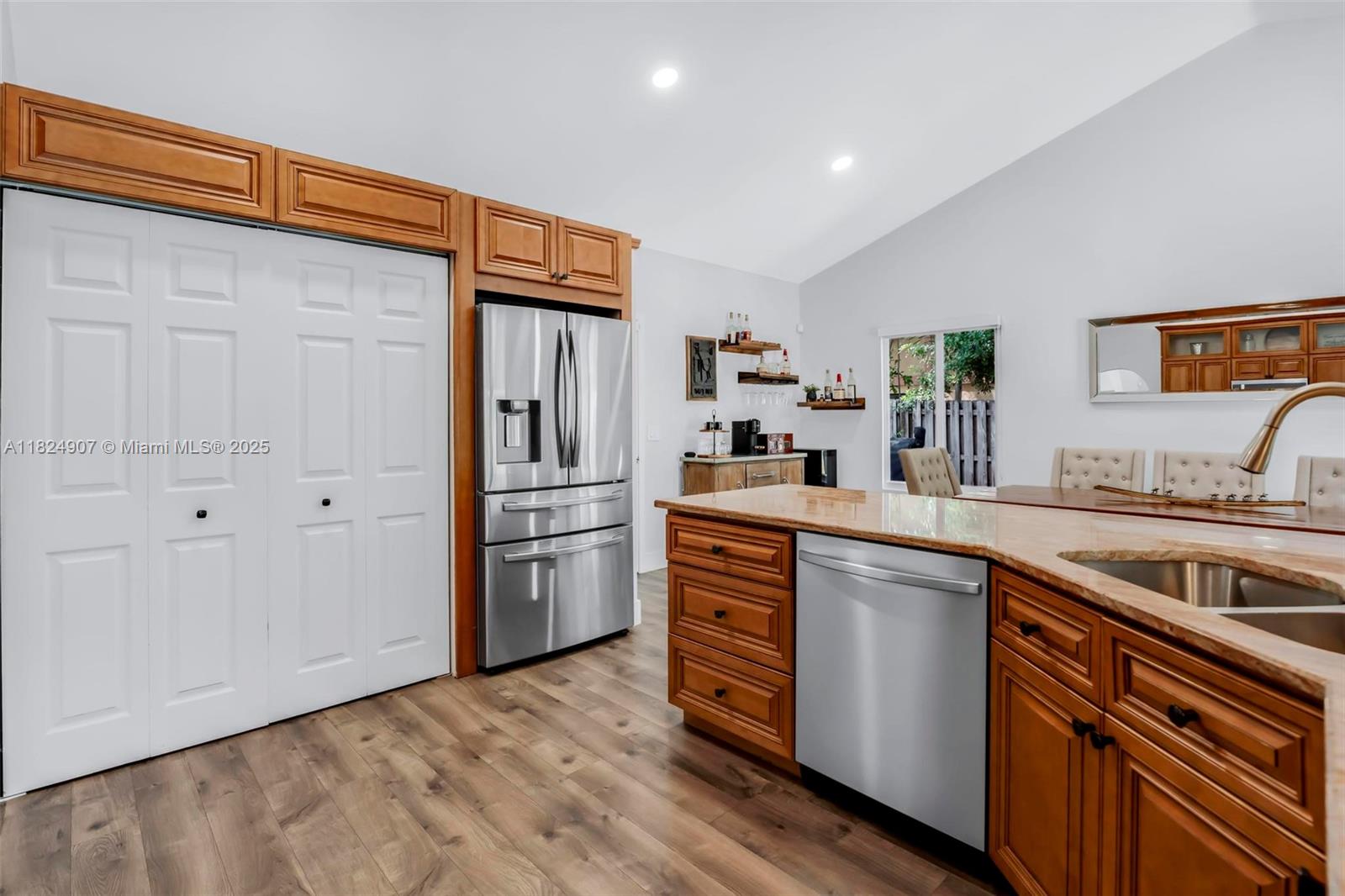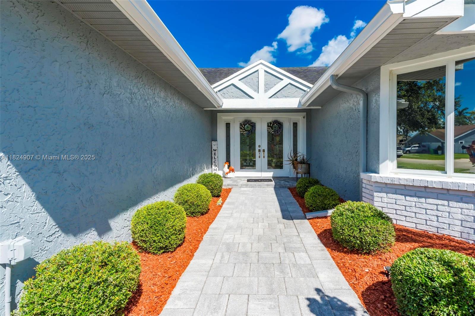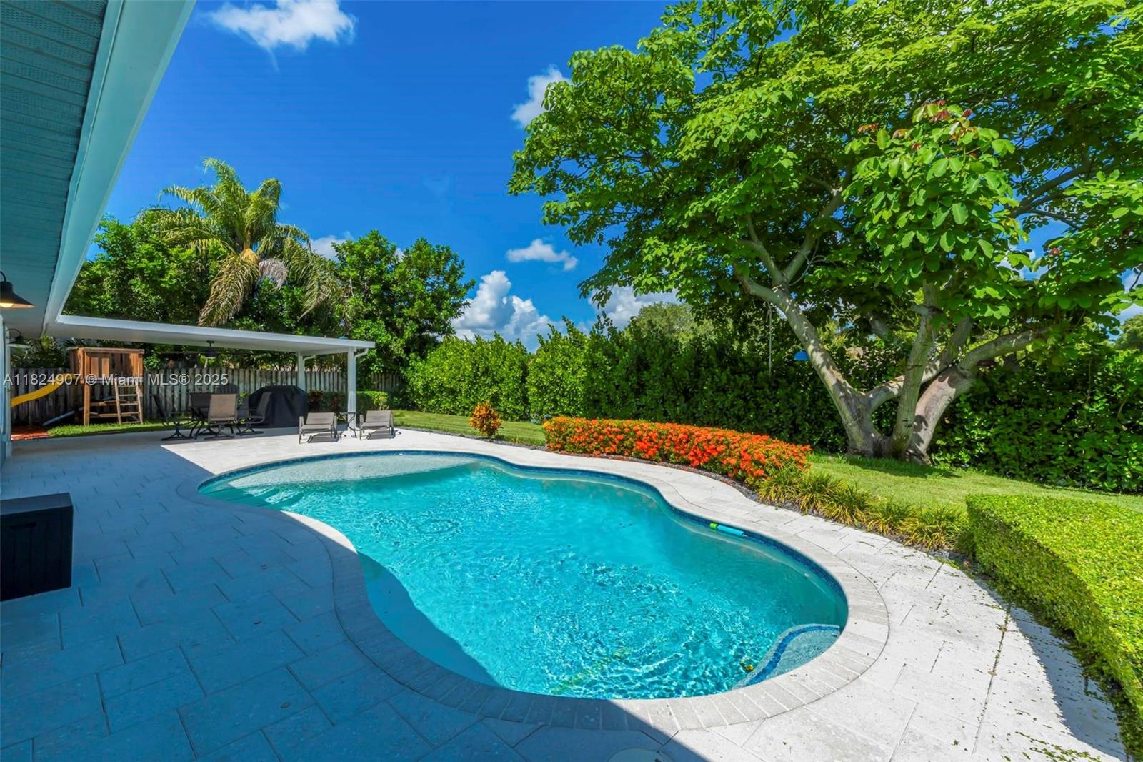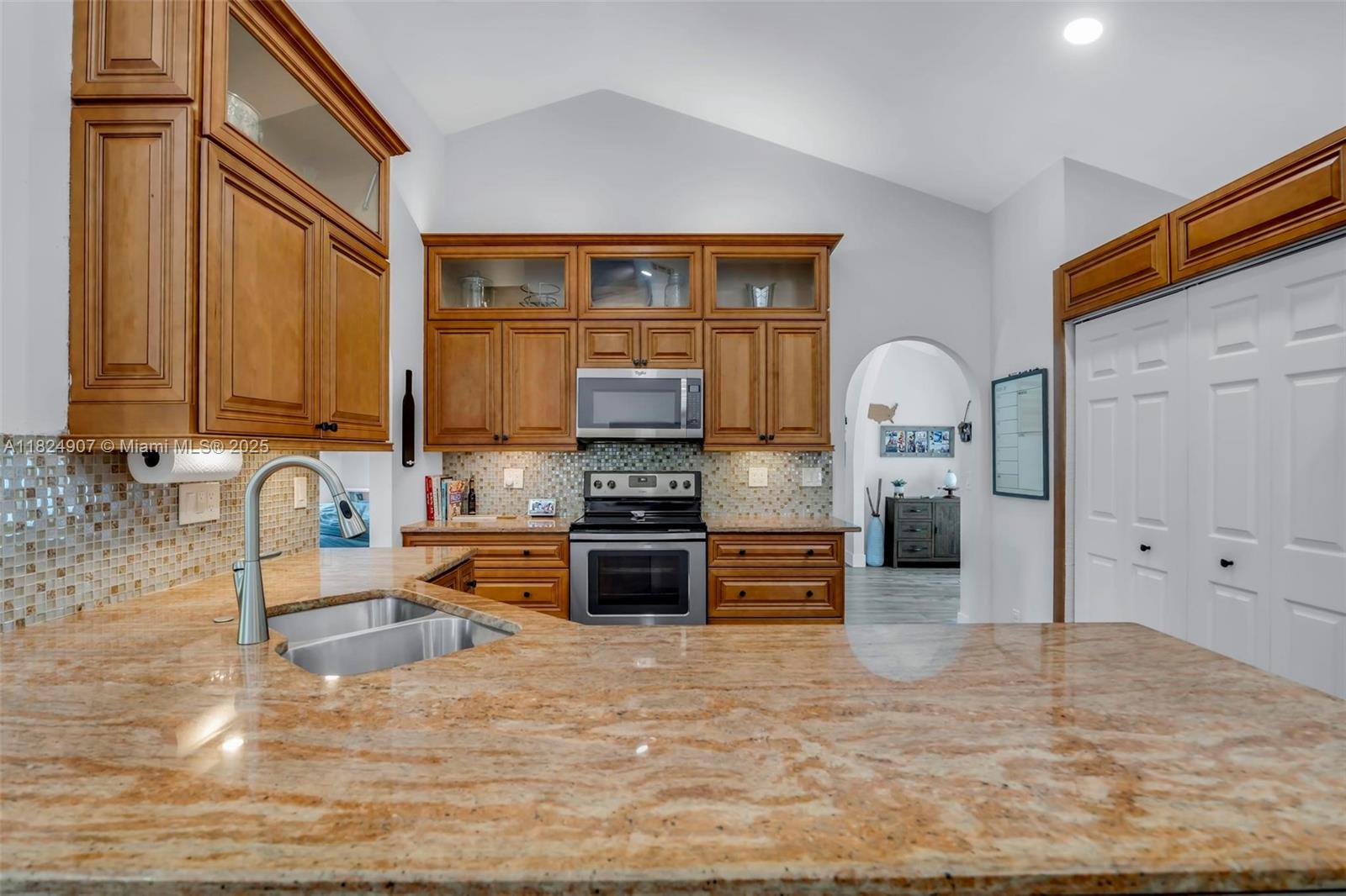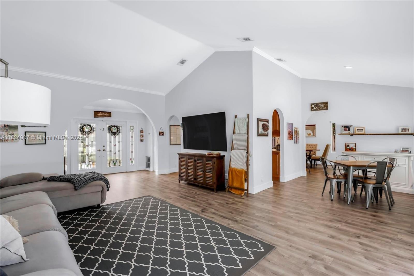 Tucked in the beautiful community of New River, this 3-bedroom, 2-bath stunner blends comfort with style. Soaring ceilings and large windows fill the home with lots of natural light. Warm laminate wood floors, a cozy fireplace, and an open layout make it perfect for everyday living and entertaining. The kitchen features granite counters, stainless steel appliances, and custom cabinets. The bathrooms have a clean, modern look, and each bedroom includes walk-in closets for plenty of storage. This waterfront home is a true retreat with lush landscaping creating a private & spacious oasis, a covered patio, and a sparkling pool(2020). Close to parks, shopping, dining, and top schools. With impact windows & AC 2024, this home checks all the boxes for comfort, convenience, & charm with a low HOA.