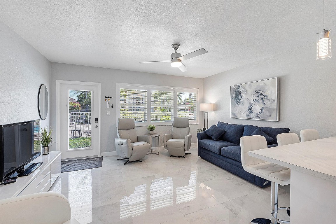 This stunning, fully furnished unit has been tastefully updated with impact windows and doors, exquisite tile flooring, and an open kitchen featuring stainless steel appliances and modern bathroom. The property includes convenient features such as a central vacuum, portable washer, and gorgeous furniture. Access to the complex is through the gated community of Golden Isles, which is surrounded by magnificent waterfront homes worth millions. Enjoy the convenience of walking distance to the beach, restaurants, and entertainment options.