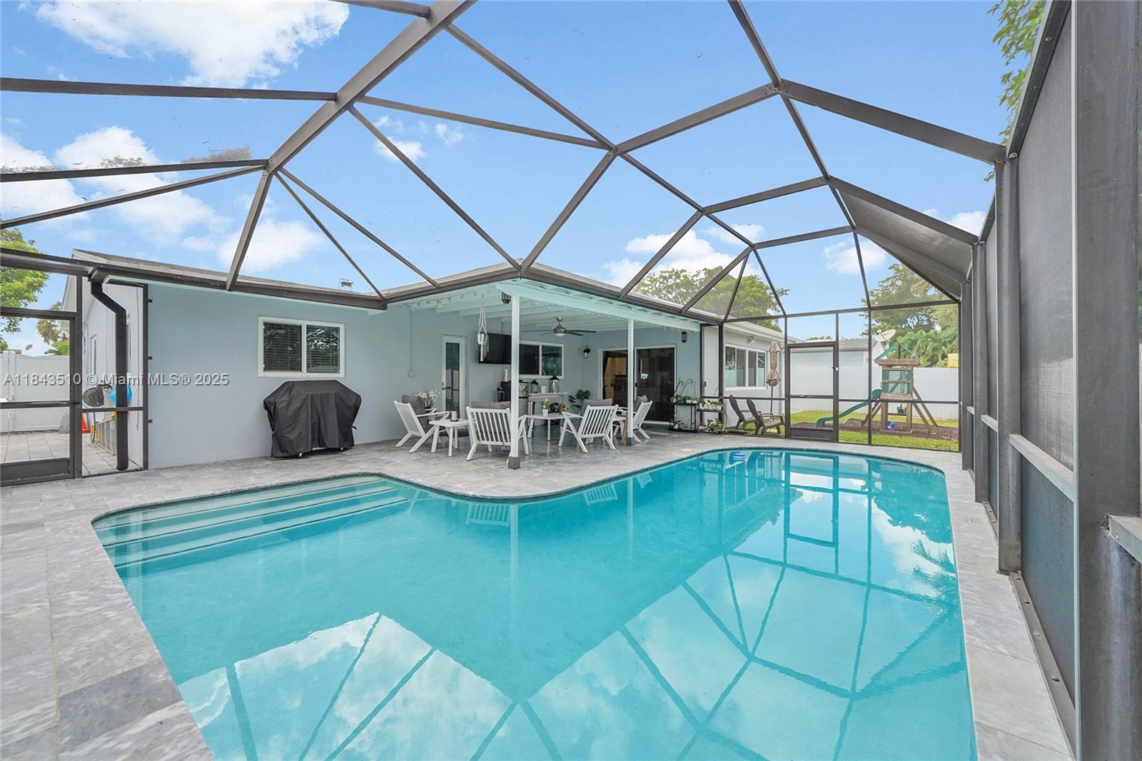 Absolutely stunning, fully remodeled 3/2 single-family home in sought-after Pembroke Pines--with NO HOA! Just minutes from Pembroke Lakes Mall and CB Smith Park, this nearly brand-new home offers a new shingle roof (2020), screened-in pool with gas heater, travertine patio, and modern curb appeal. Upgrades include impact windows, new flooring, fully renovated kitchen with granite counters, backsplash, three refrigerators, and all TVs included! New garage door, opener, security cameras, dura fence, oversized paver driveway, impact front door, new A/C, and washer/dryer. Pavers wrap around the home, and both bathrooms feature new vanities. Move-in ready!