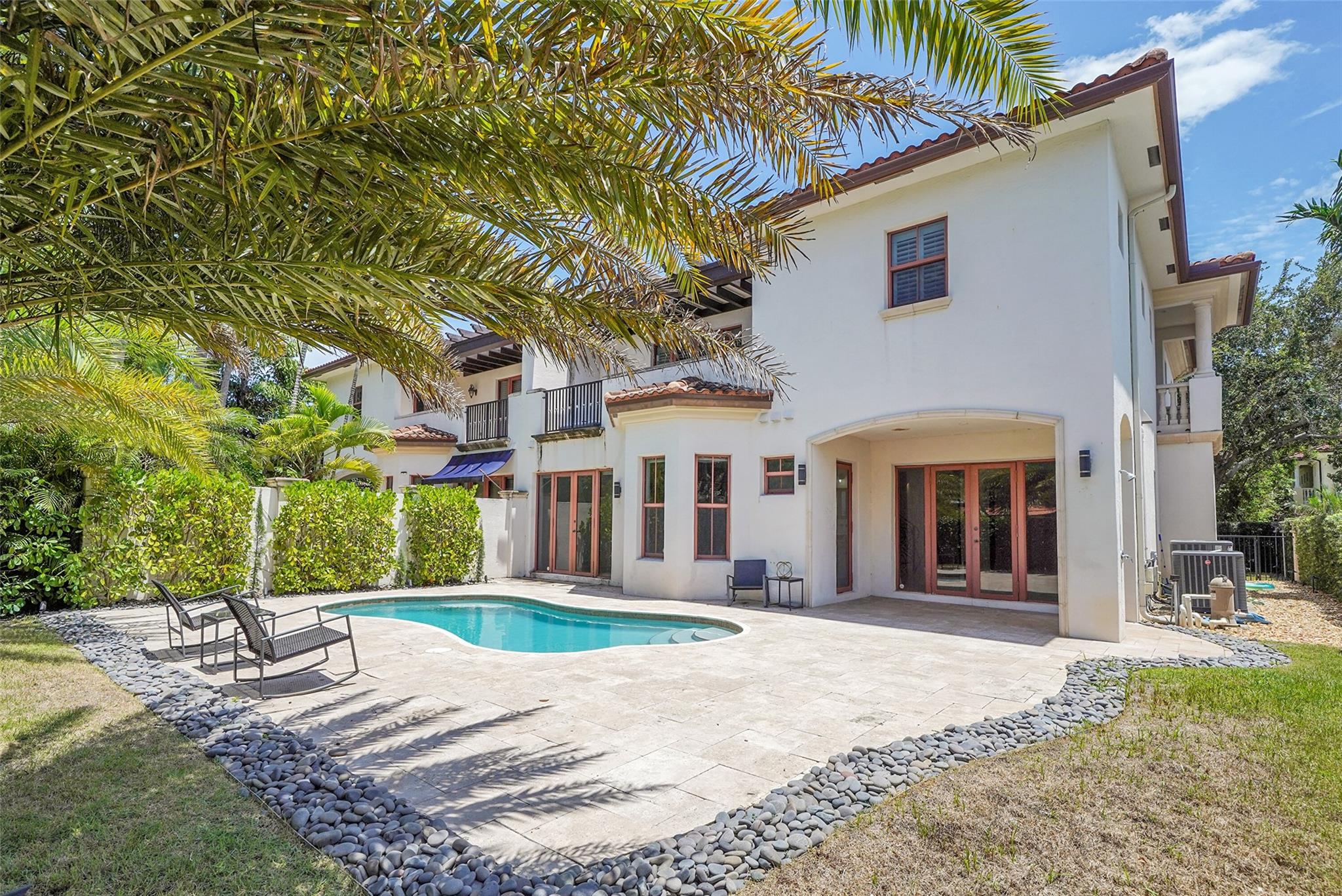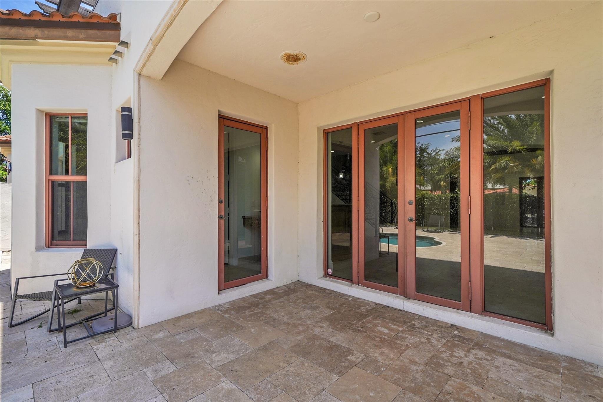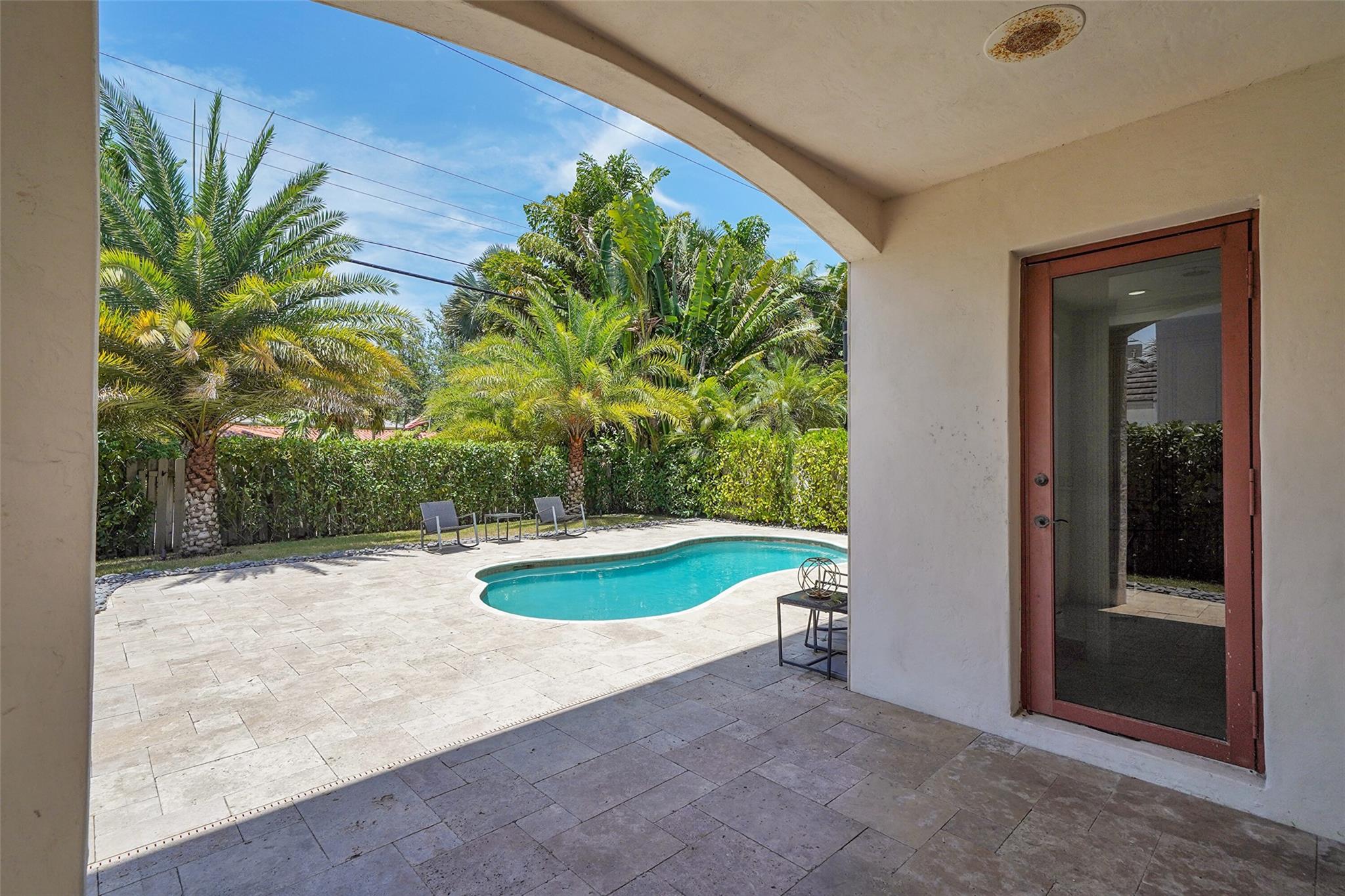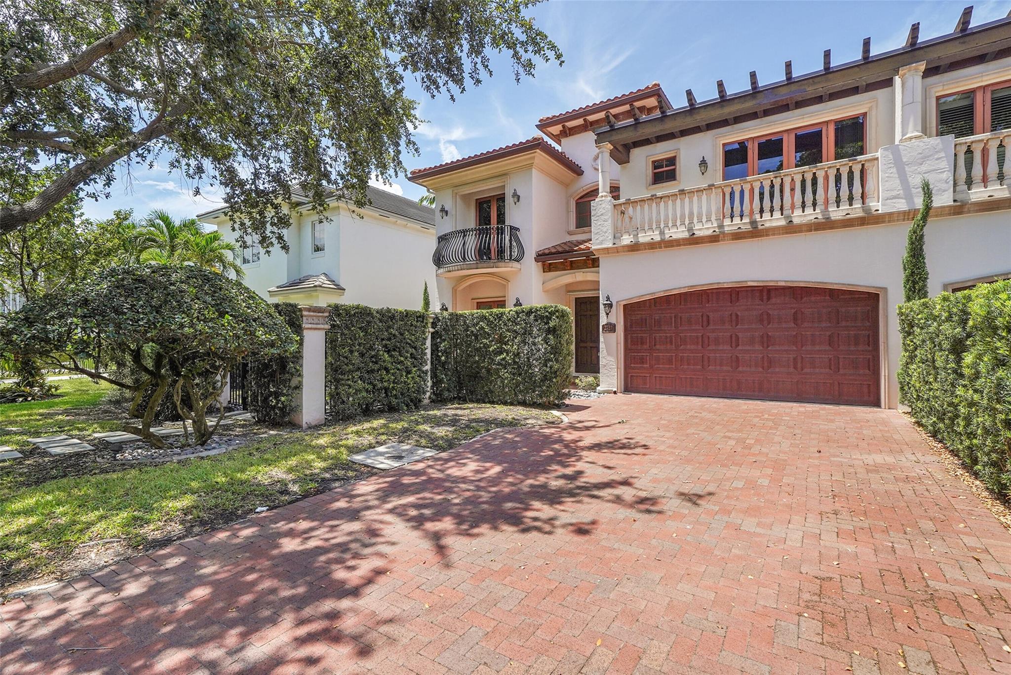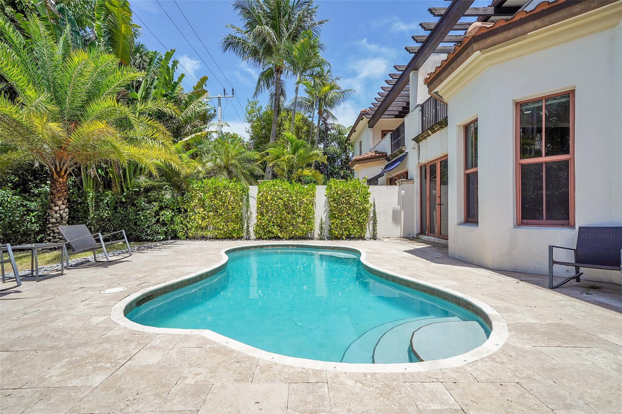 Elegant Mediterranean townhome in Coral Ridge. This 4BR/4.2BA home features a private pool, elevator, 2-car garage, and impact windows/doors. The gourmet kitchen has granite counters, Sub-Zero fridge, Thermador gas range, Bosch appliances, and breakfast area overlooking the fenced yard. Enjoy open yet formal living spaces, Saturnia marble and Brazilian cherry wood floors, custom iron staircase, and 3 balconies. The primary suite offers dual closets, spa bath, and sitting area. Great location! Bayview elementary school. Roof 2017