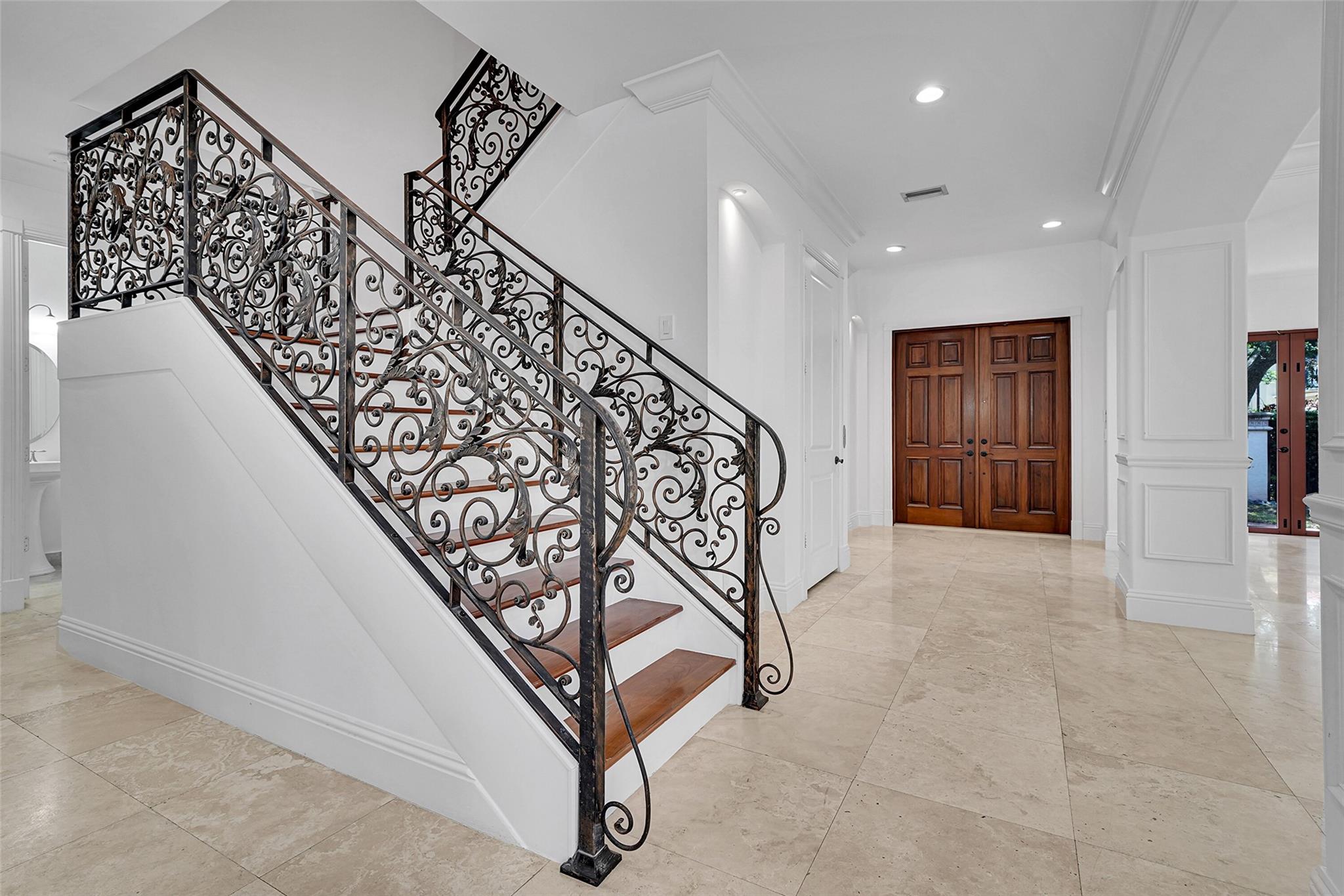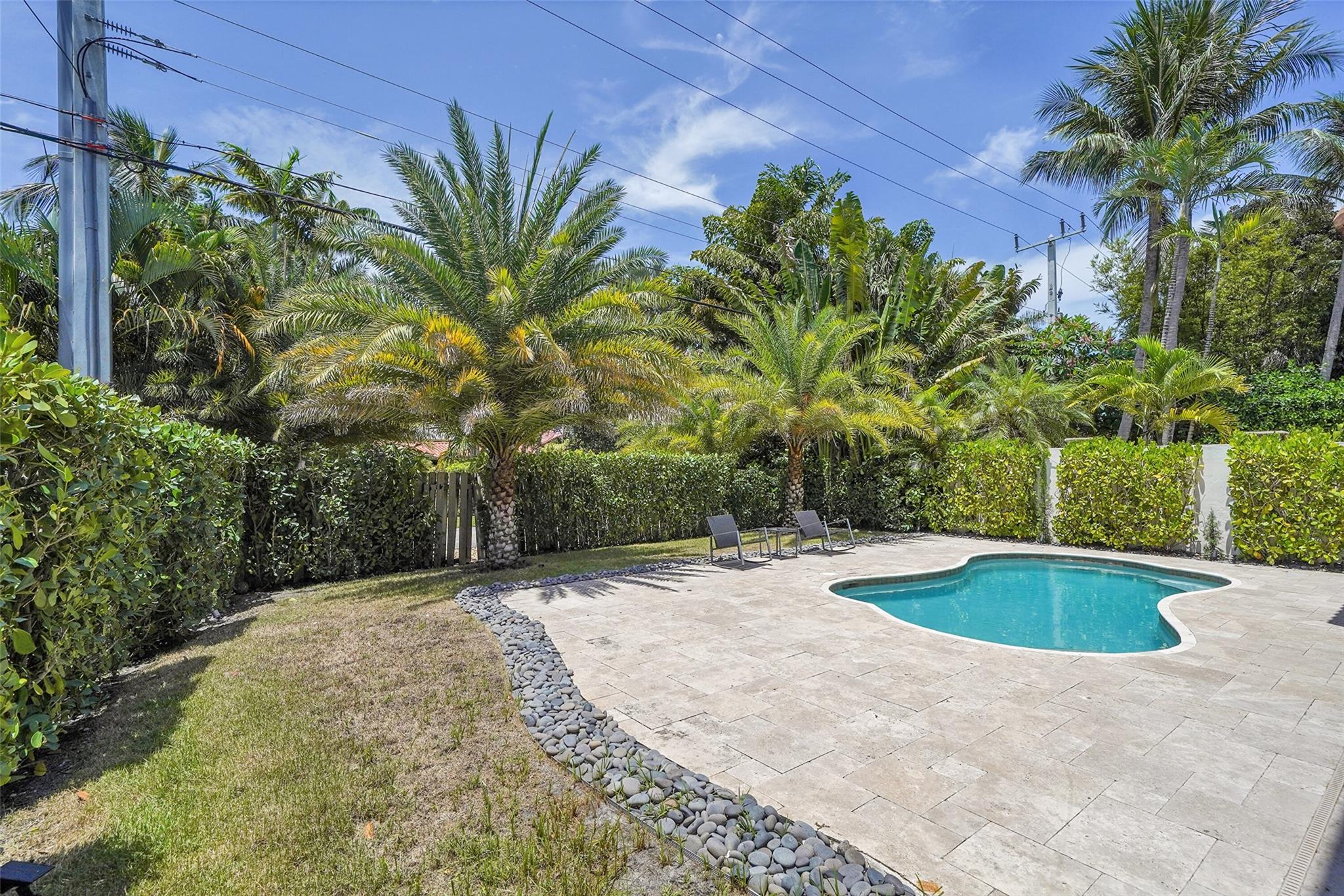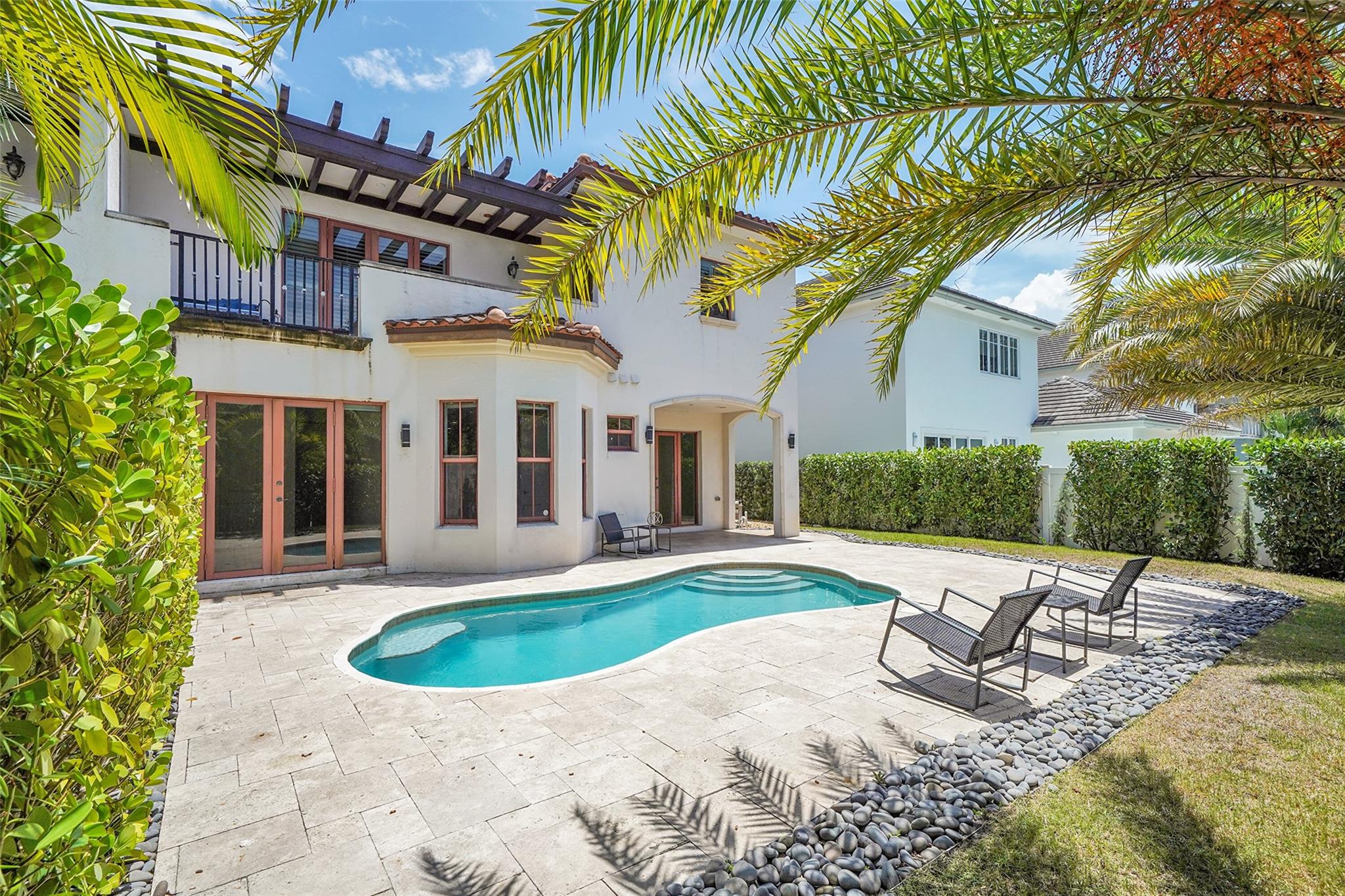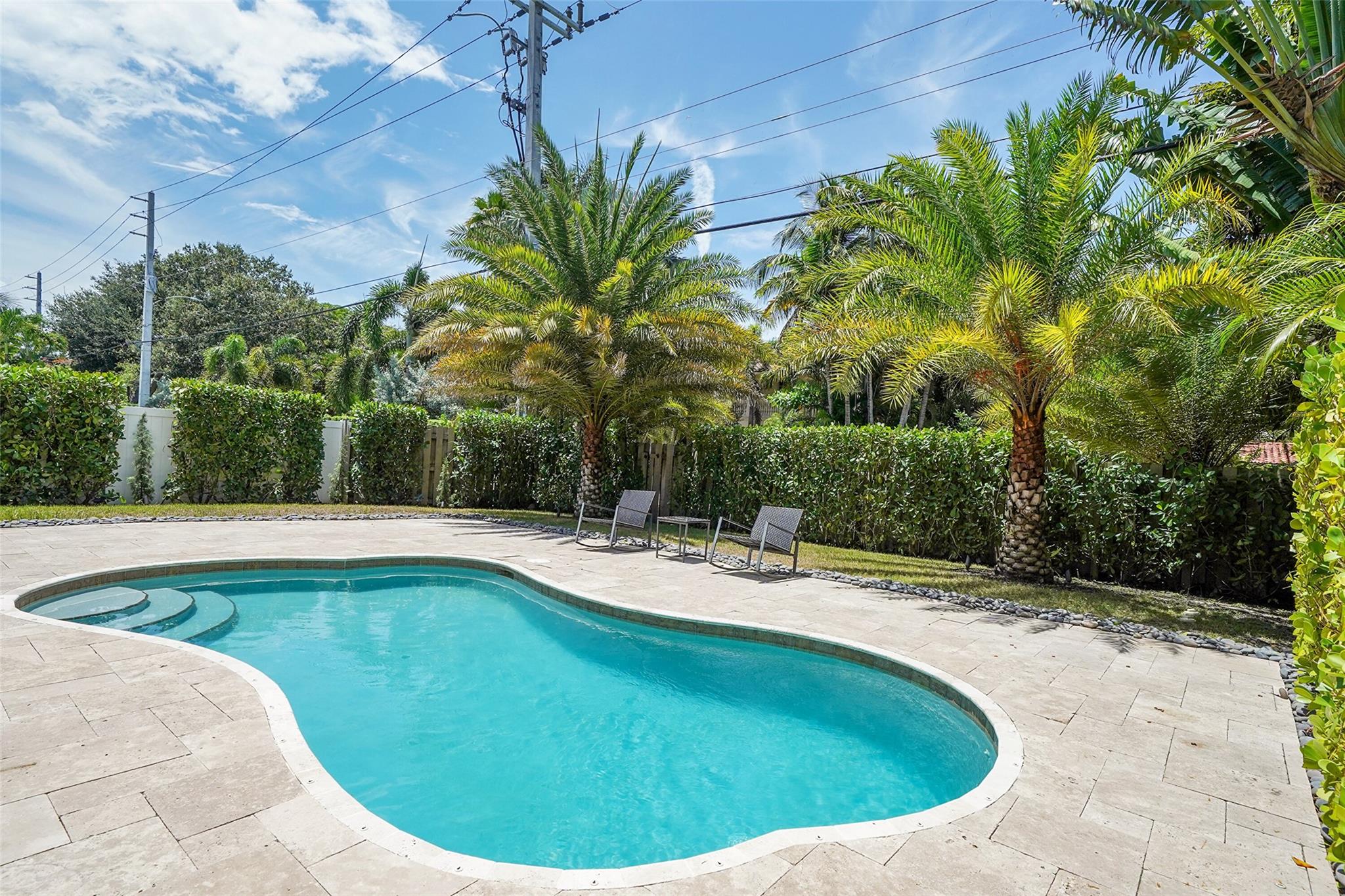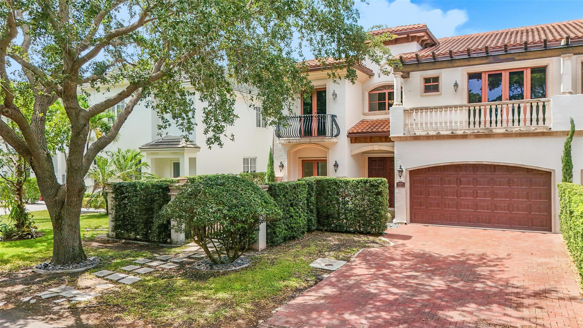 Elegant Mediterranean townhome in Coral Ridge. This 4BR/4.2BA home features a private pool, elevator, 2-car garage, and impact windows/doors. The gourmet kitchen has granite counters, Sub-Zero fridge, Thermador gas range, Bosch appliances, and breakfast area overlooking the fenced yard. Enjoy open yet formal living spaces, Saturnia marble and Brazilian cherry wood floors, custom iron staircase, and 3 balconies. The primary suite offers dual closets, spa bath, and sitting area. Great location! Bayview elementary school. Roof 2017