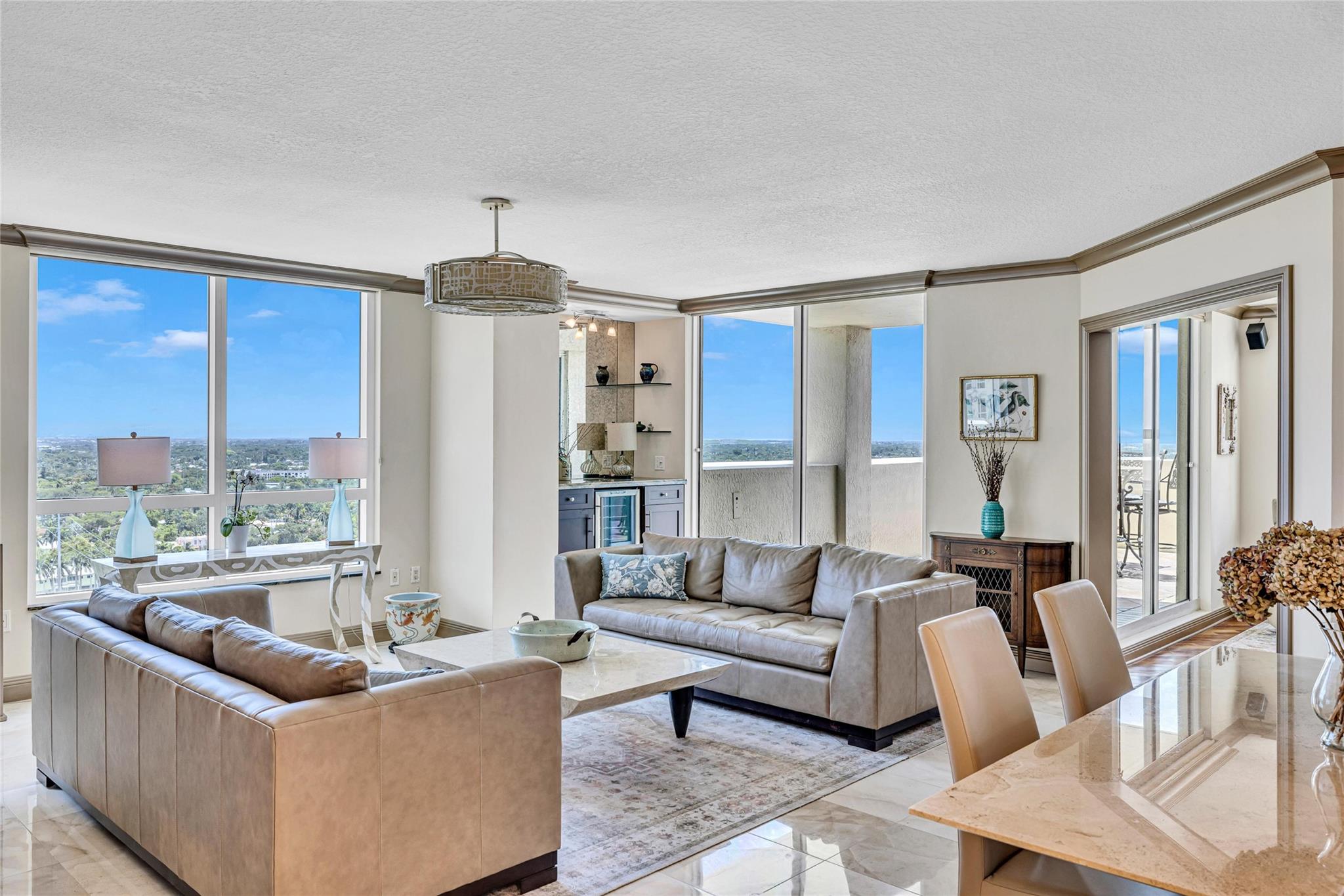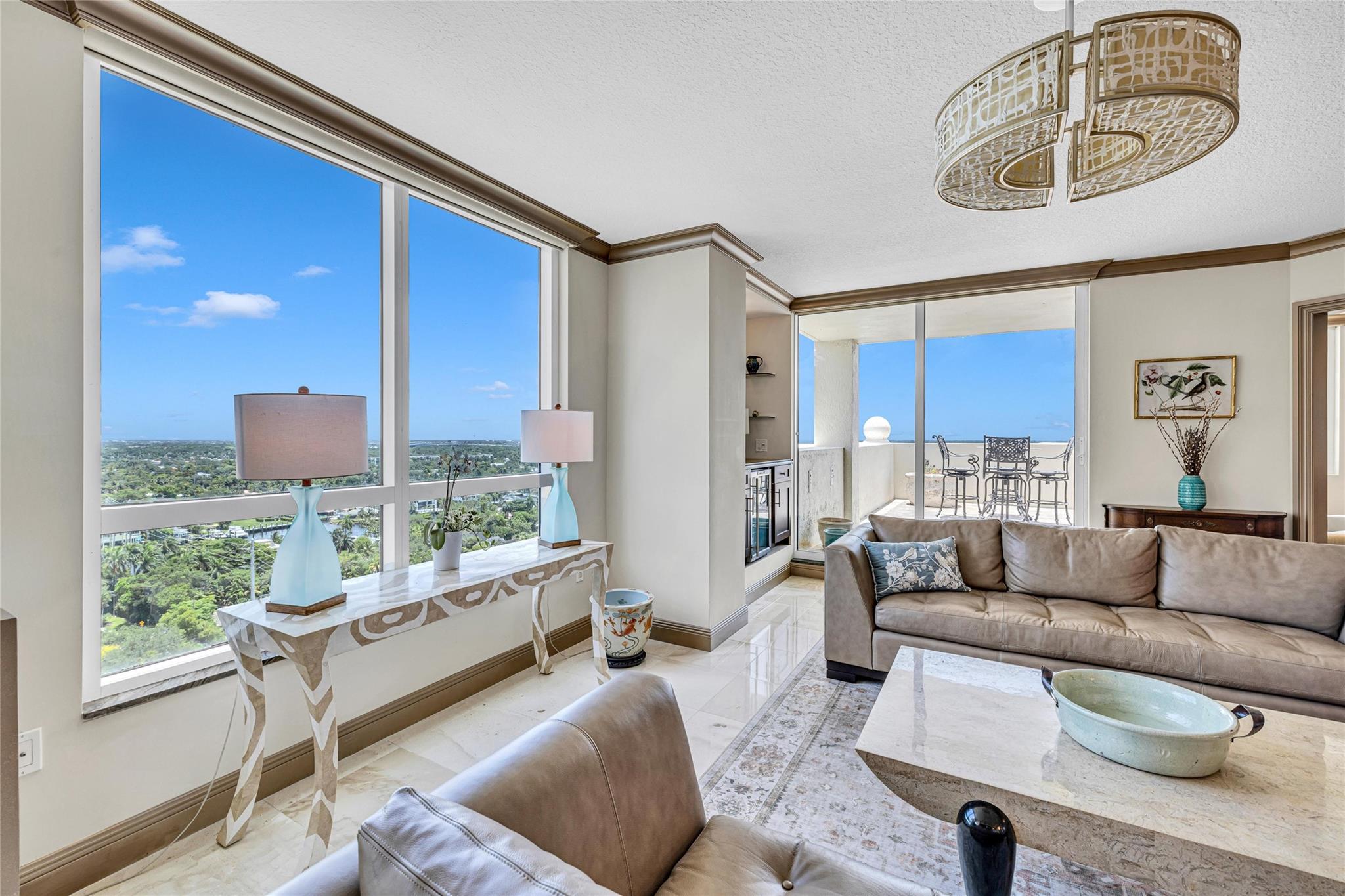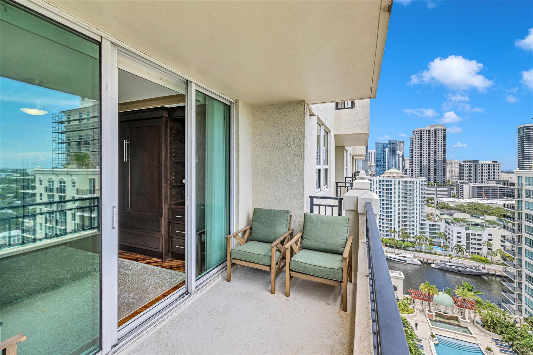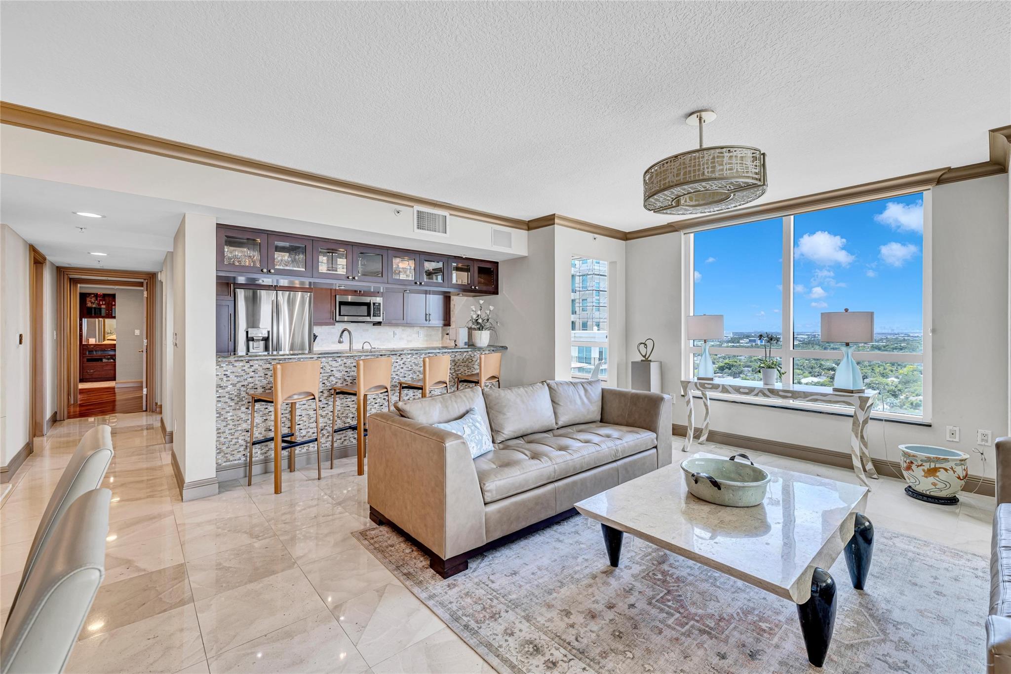 Soaring above the skyline, this customized 3-bed, 3 full-bath Sub-Penthouse offers panoramic views of the Miami and Fort Lauderdale skyline, New River, and Sailboat Bend. A 500 sq ft wraparound terrace plus a second balcony off Bedroom 2 provide exceptional outdoor living. Marble and Brazilian cherry wood floors complement a custom kitchen, bar, and granite-topped workspace in the primary suite. Filled with natural light, the home also features Sonos sound, Ecobee thermostat, Hunter Douglas Roman shades, and V-Kool window film. Includes two 2nd-floor parking spaces. Amenities: dockage to 40’ with no fixed bridges, heated pool, 3 hot tubs, fitness center, salon, wine storage, cigar lounge, valet, and more — all in the heart of Fort Lauderdale. Fully furnished option negotiable.
