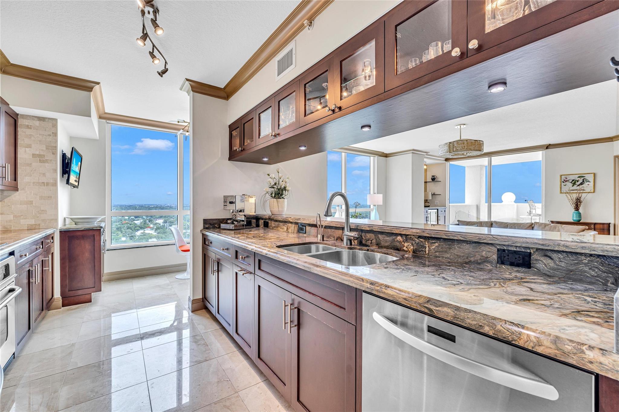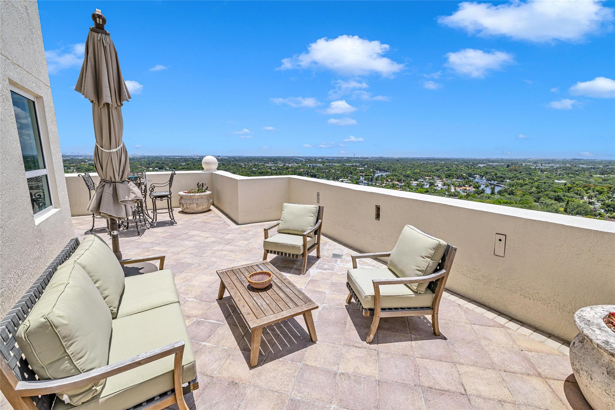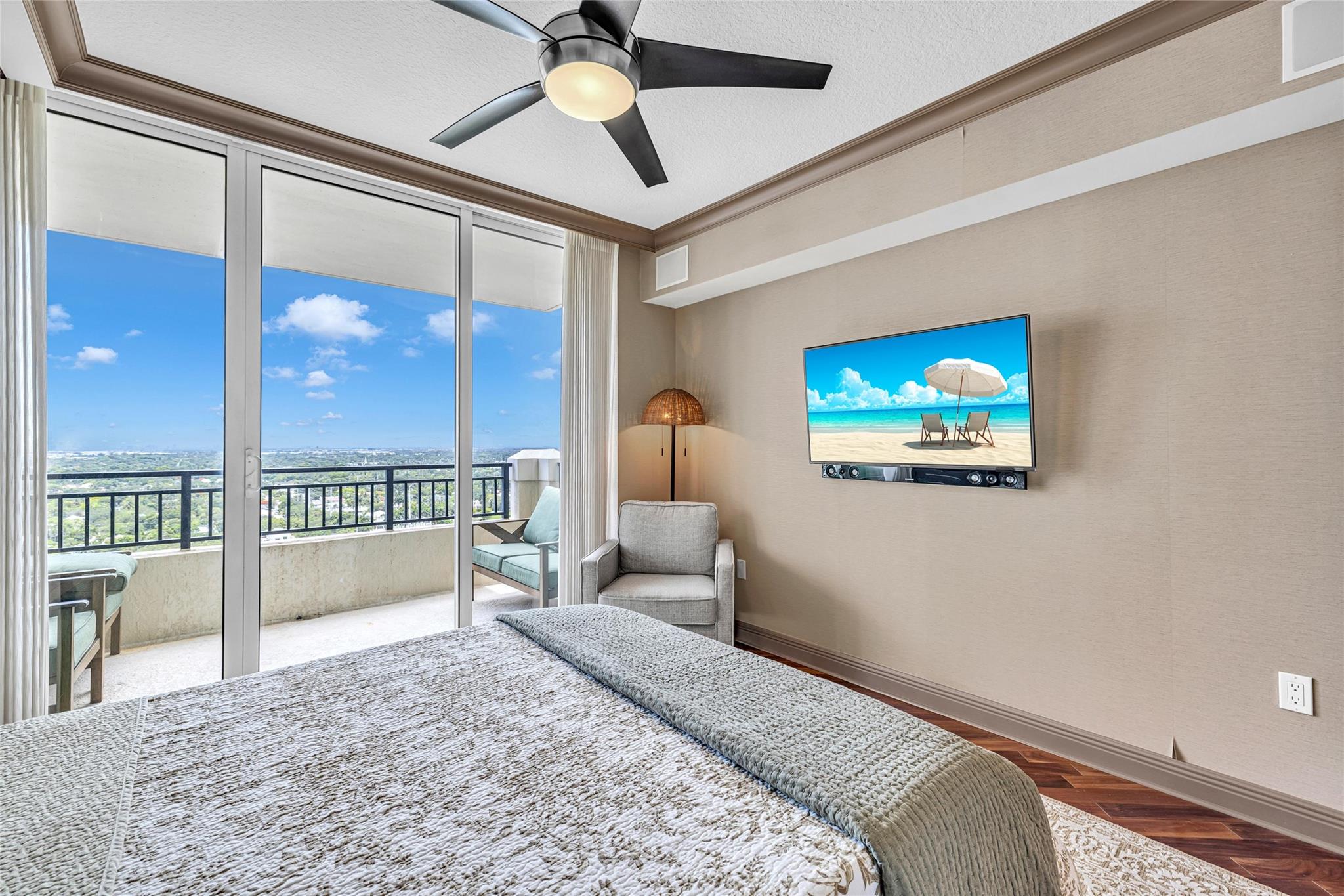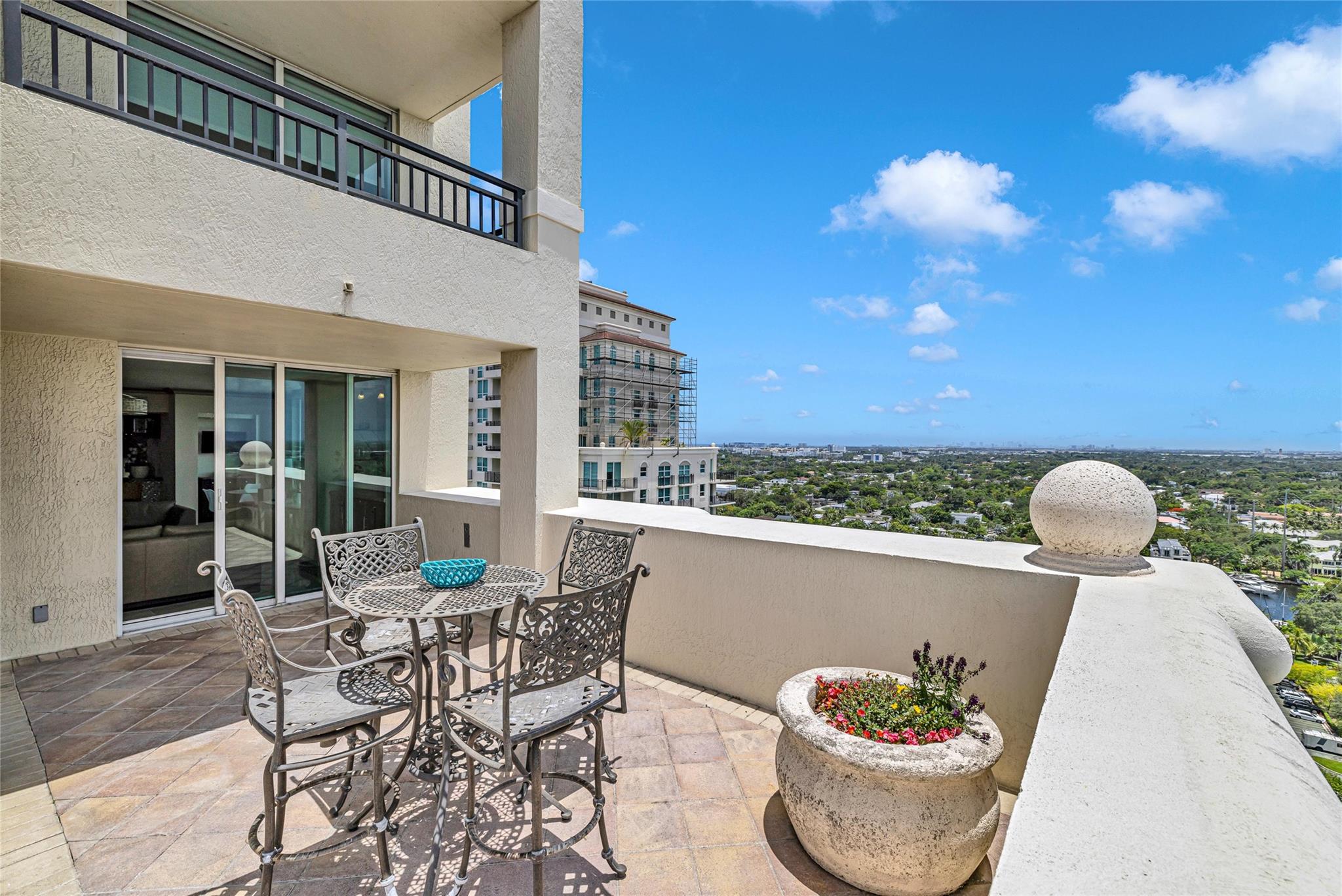 Soaring above the skyline, this customized 3-bed, 3 full-bath Sub-Penthouse offers panoramic views of the Miami and Fort Lauderdale skyline, New River, and Sailboat Bend. A 500 sq ft wraparound terrace plus a second balcony off Bedroom 2 provide exceptional outdoor living. Marble and Brazilian cherry wood floors complement a custom kitchen, bar, and granite-topped workspace in the primary suite. Filled with natural light, the home also features Sonos sound, Ecobee thermostat, Hunter Douglas Roman shades, and V-Kool window film. Includes two 2nd-floor parking spaces. Amenities: dockage to 40’ with no fixed bridges, heated pool, 3 hot tubs, fitness center, salon, wine storage, cigar lounge, valet, and more — all in the heart of Fort Lauderdale. Fully furnished option negotiable.
