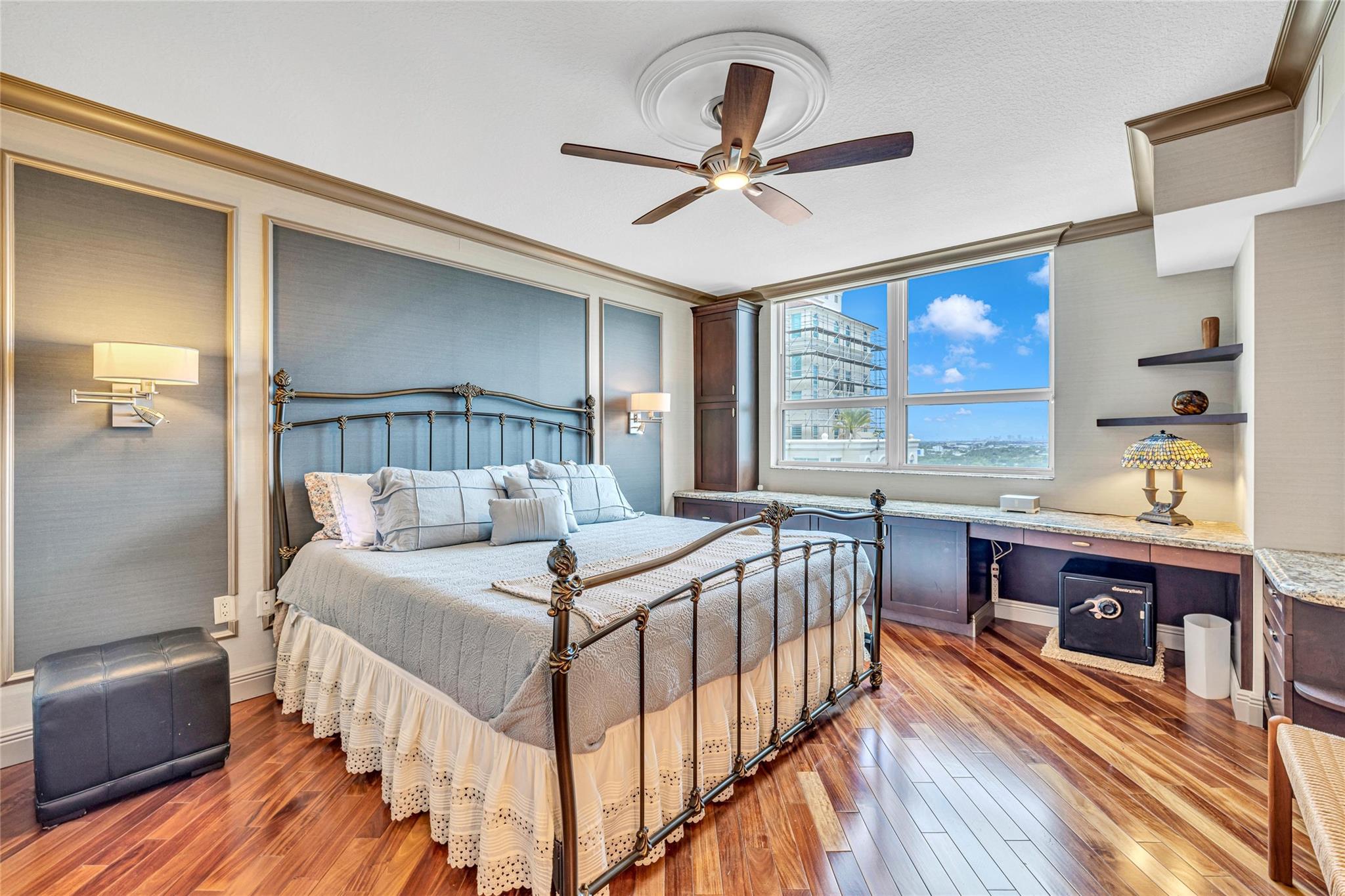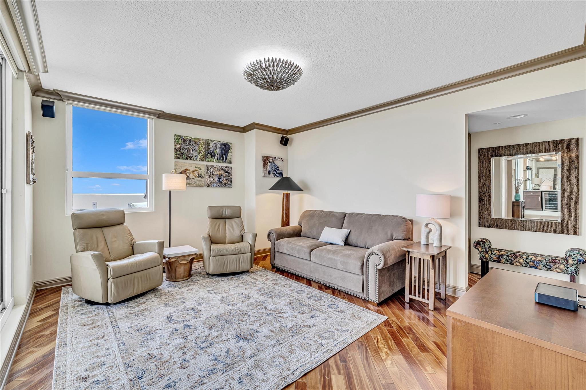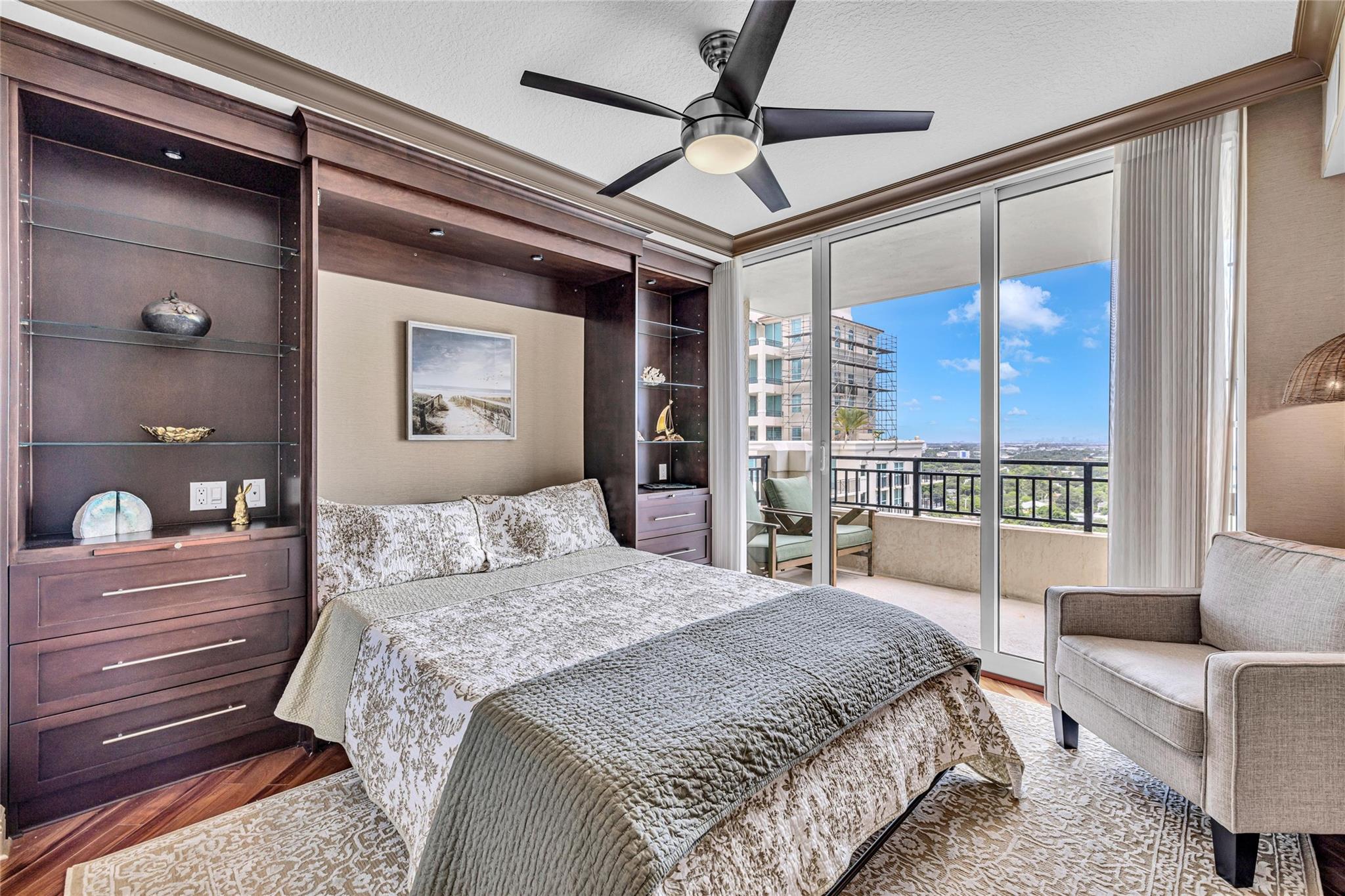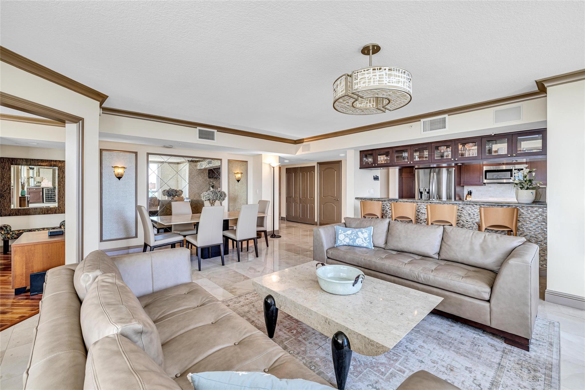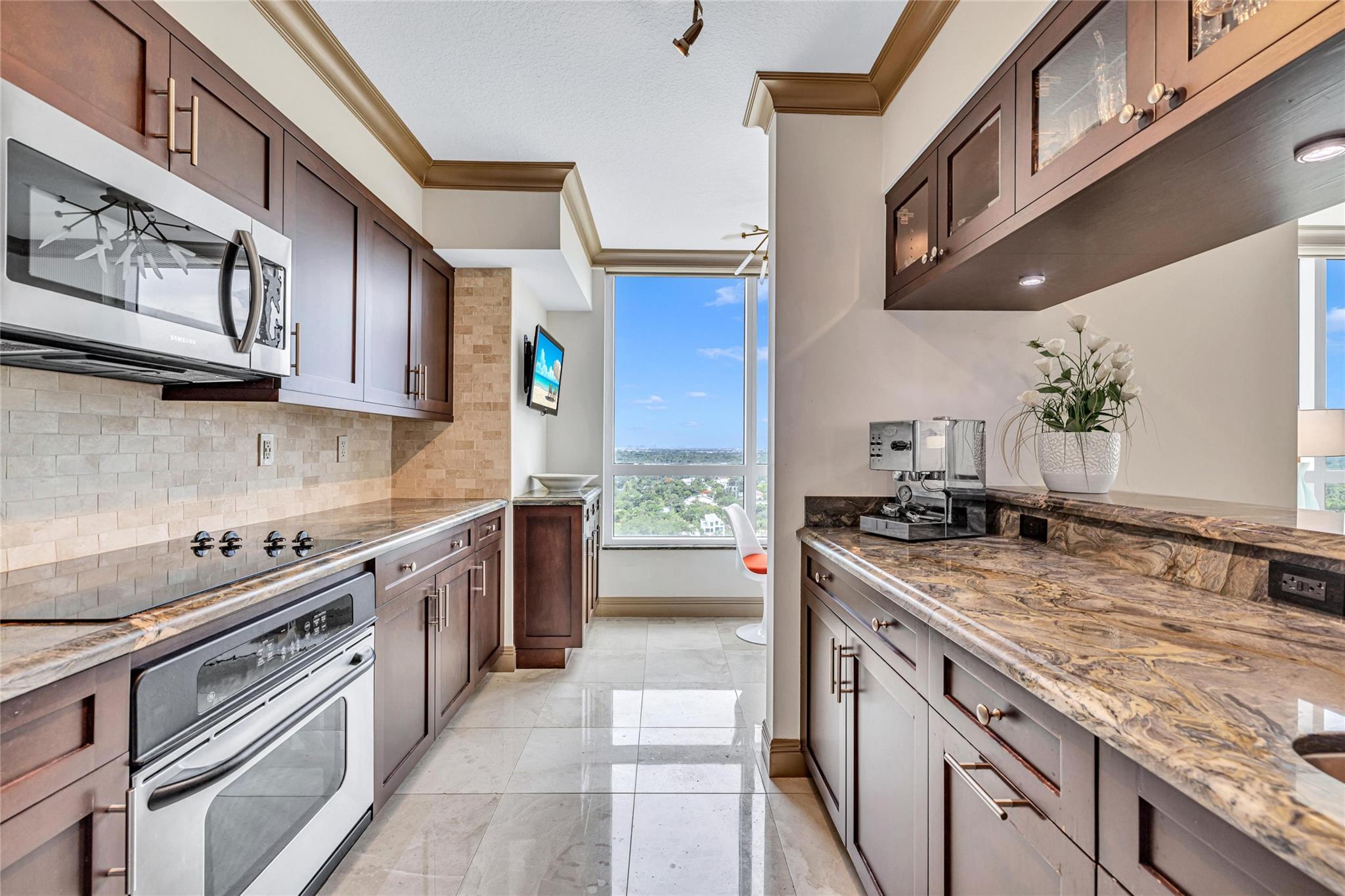 Soaring above the skyline, this customized 3-bed, 3 full-bath Sub-Penthouse offers panoramic views of the Miami and Fort Lauderdale skyline, New River, and Sailboat Bend. A 500 sq ft wraparound terrace plus a second balcony off Bedroom 2 provide exceptional outdoor living. Marble and Brazilian cherry wood floors complement a custom kitchen, bar, and granite-topped workspace in the primary suite. Filled with natural light, the home also features Sonos sound, Ecobee thermostat, Hunter Douglas Roman shades, and V-Kool window film. Includes two 2nd-floor parking spaces. Amenities: dockage to 40’ with no fixed bridges, heated pool, 3 hot tubs, fitness center, salon, wine storage, cigar lounge, valet, and more — all in the heart of Fort Lauderdale. Fully furnished option negotiable.
