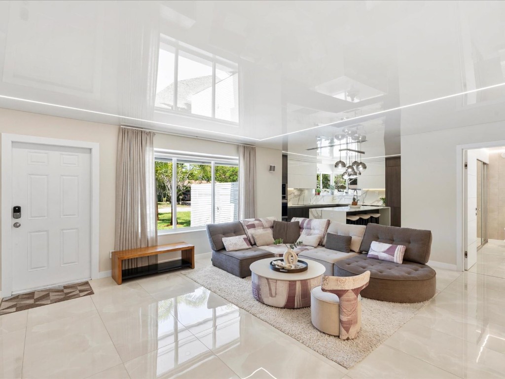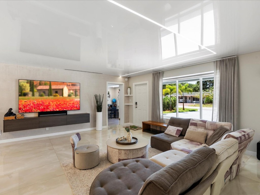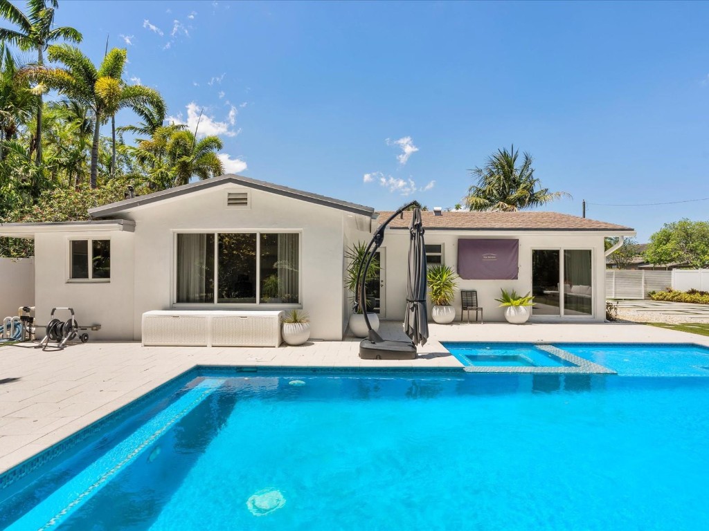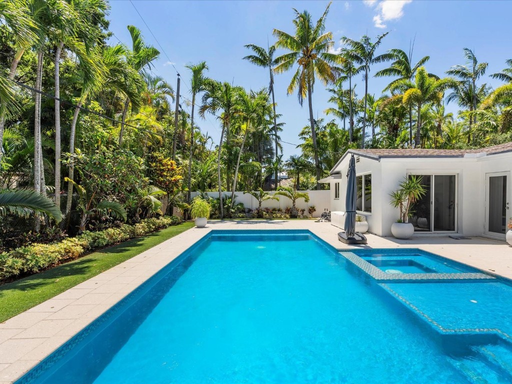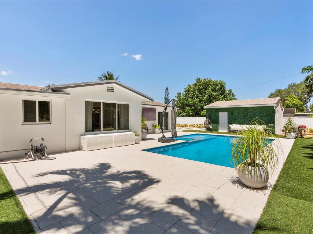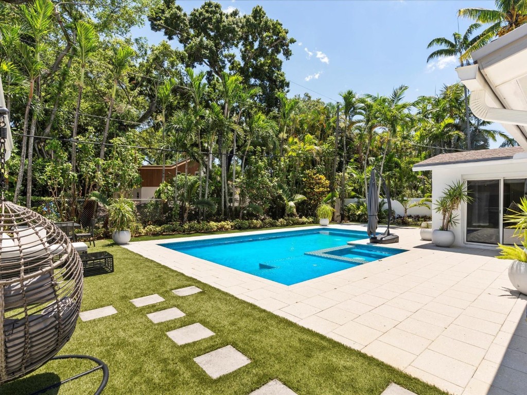 Designer-reimagined and totally renovated in 2022, this stunning 3-bed, 3-bath home offers luxury living inside and out. Features include custom closets, kitchen, built-in furniture, stretch ceilings, dimmable lighting, and new A/C. The modern layout includes a spacious kitchen with large island. All major systems have been updated: new roof, plumbing, electrical, and full hurricane-impact windows and doors. The spa-like master bathroom includes a custom steam room. Outside, enjoy a resort-style saltwater heated pool with hot tub and spa. A new aluminum fence surrounds the property, which also features a new driveway and detached garage with tankless water heater. This turnkey home combines style, comfort, and peace of mind—ideal as a luxury residence or high-end rental.