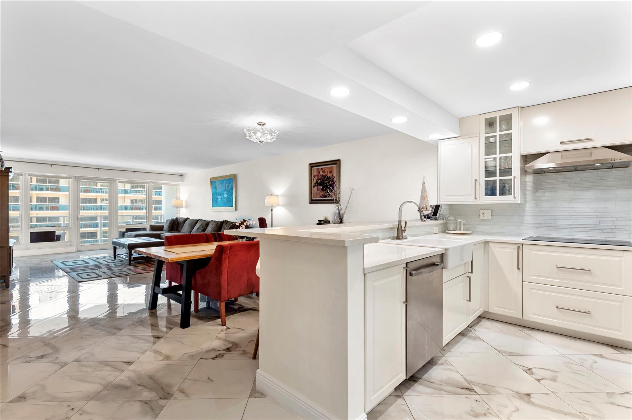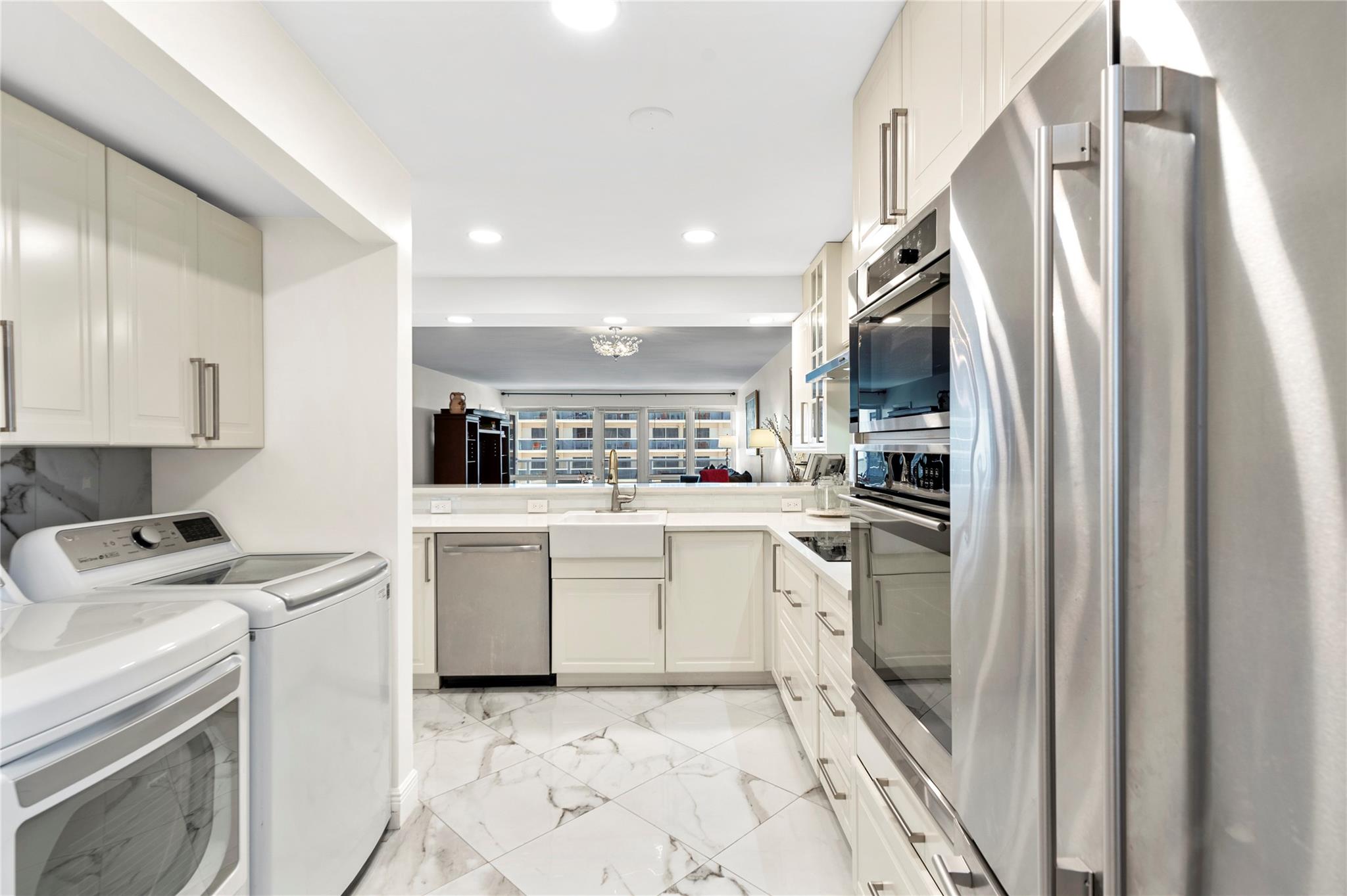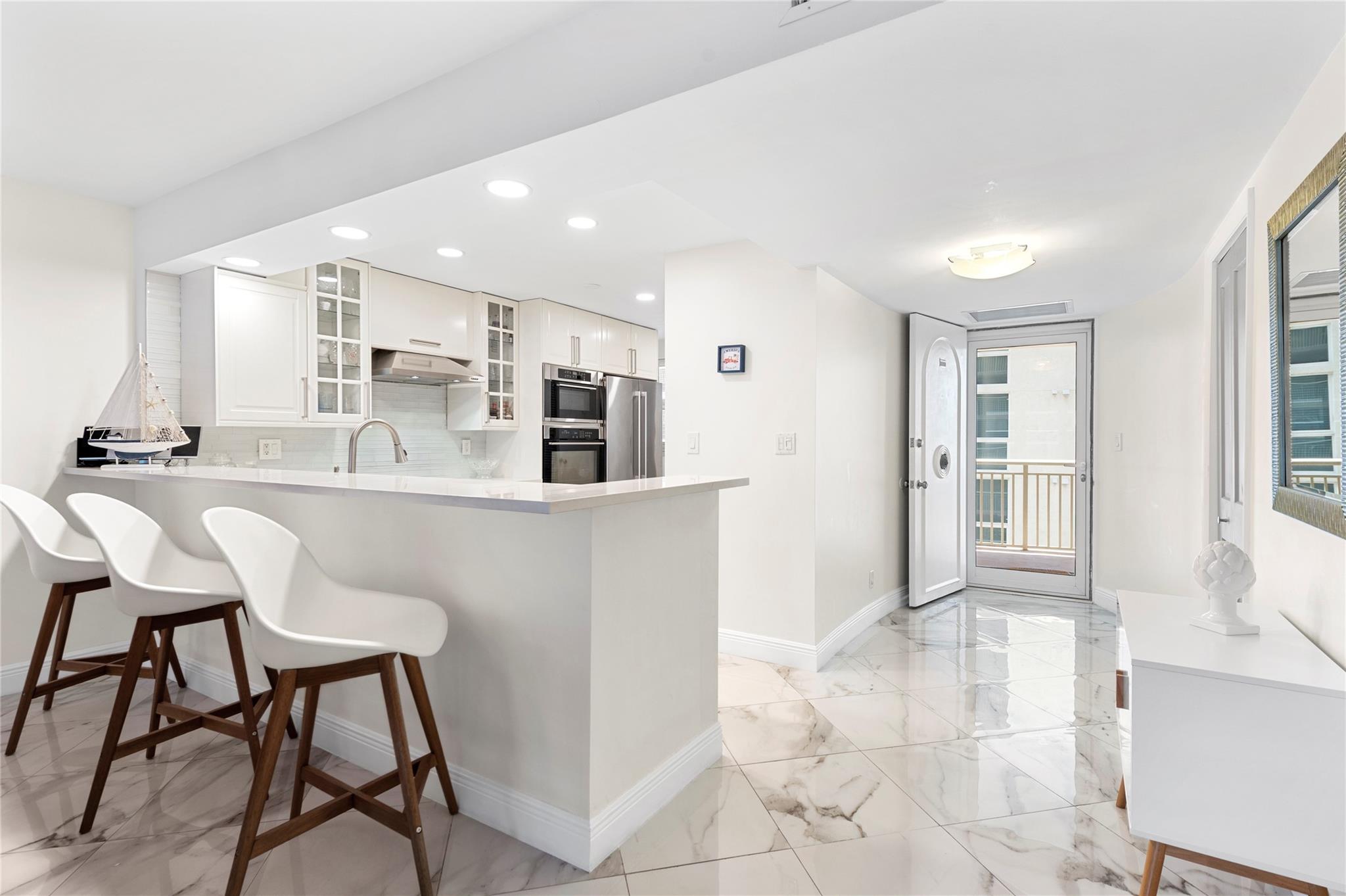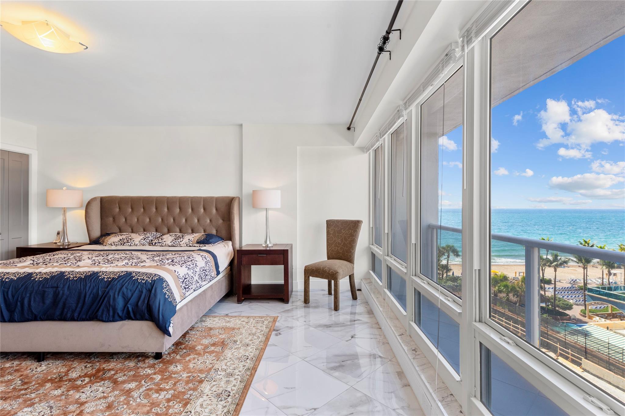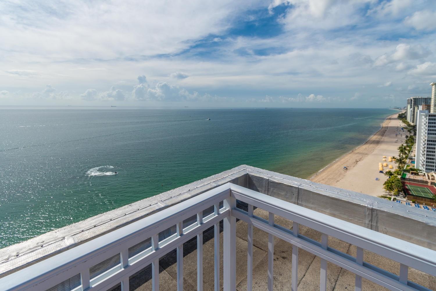 Stunning ocean views from the renovated 2 bedroom, 2 bath + office or guest room...When remodeled, this unit boasts an open concept, Split bedroom plan, larger bathrooms and an added 3rd bedroom, den or office. Beautiful Porcelain Tile Floors throughout...All white kitchen open to living and dining rooms with a large breakfast bar peninsula. Stainless steel appliances, Built-in oven, full sized washer and dryer, topped with quartz countertops. Primary bedroom with floor to ceiling windows and awesome views features an enlarged en-suite with custom tiled shower, frameless glass shower enclosure, double sink vanity, and linen closet. Spacious guest bedroom and modern guest bath. (1) Garage parking space and (1) storage locker. The Galleon is an amenity rich complex, Impressive!
