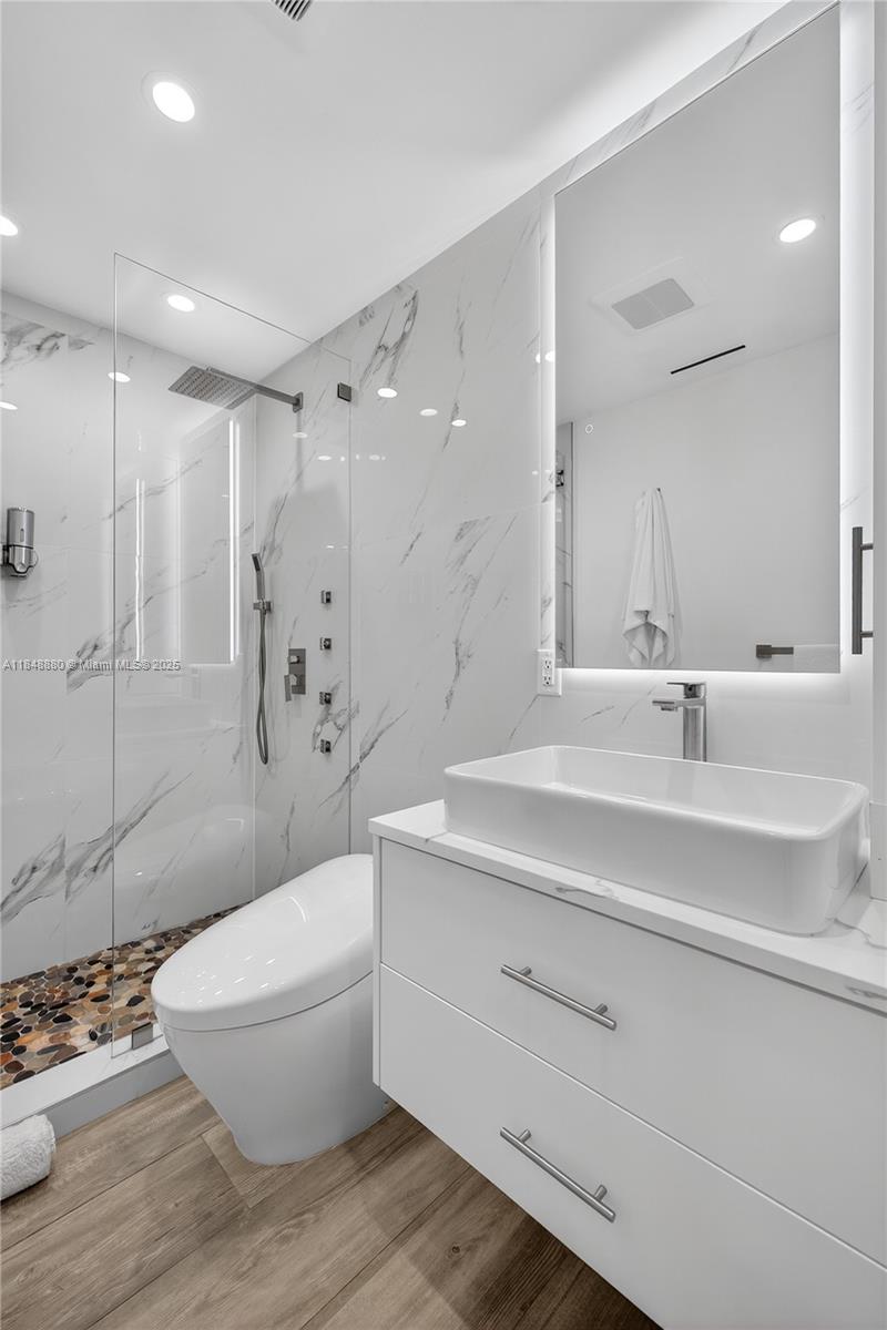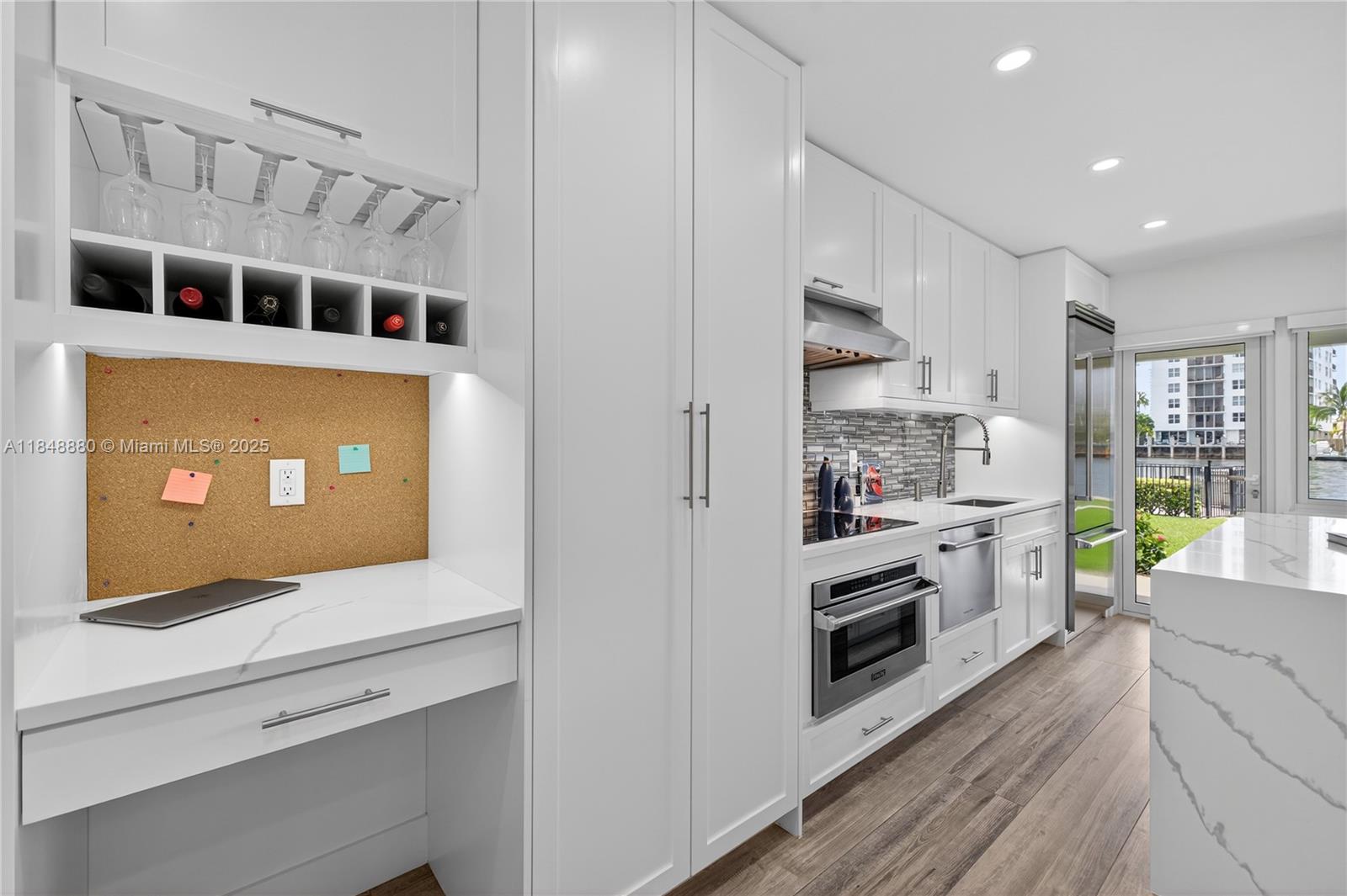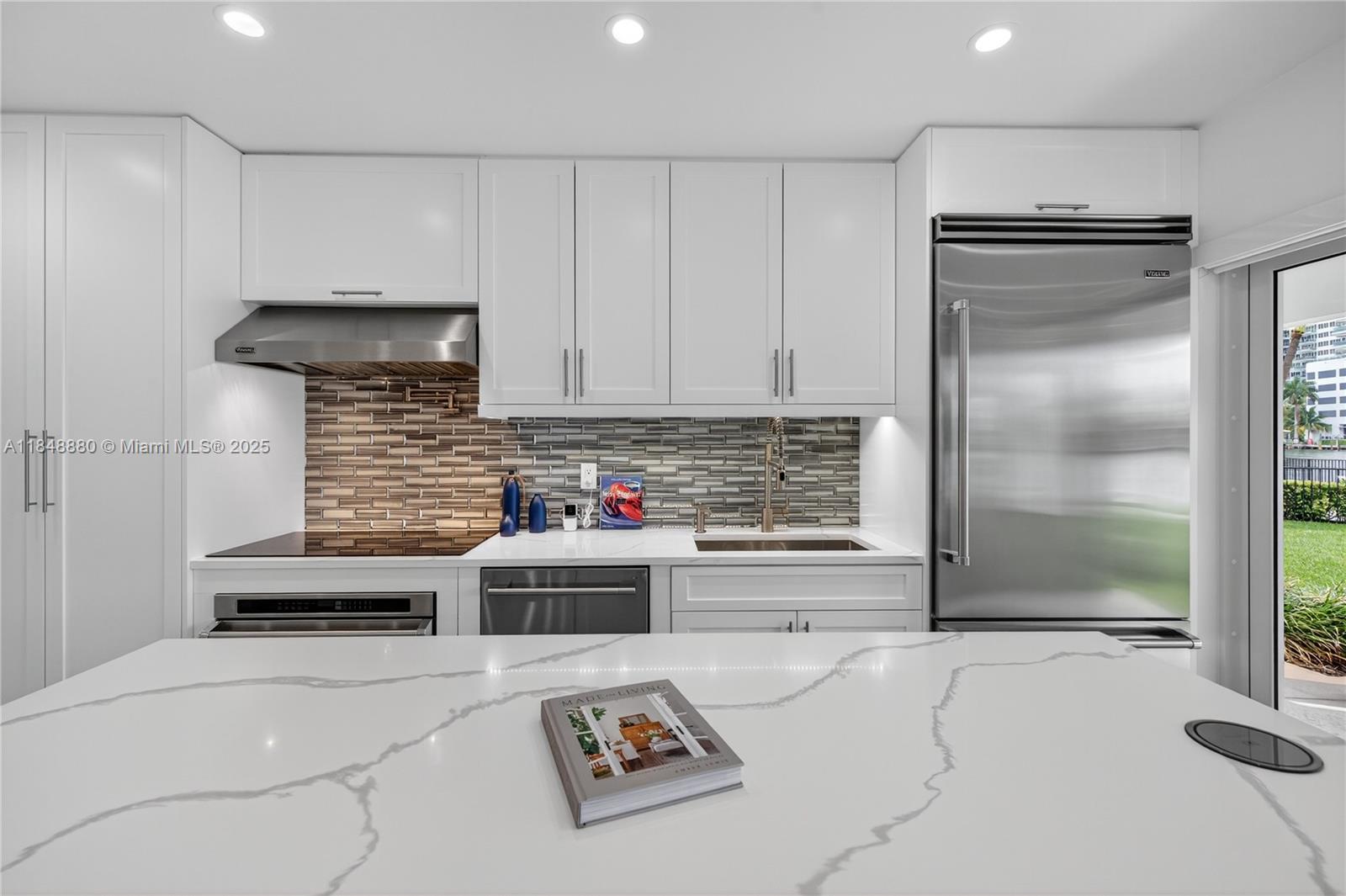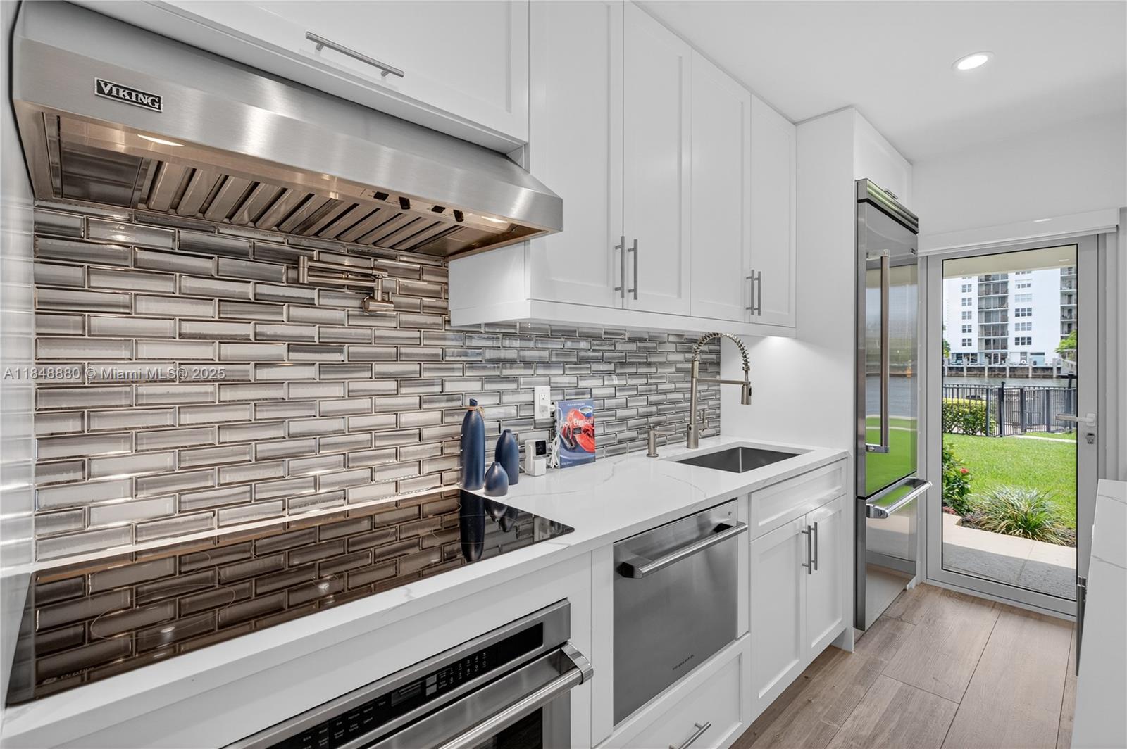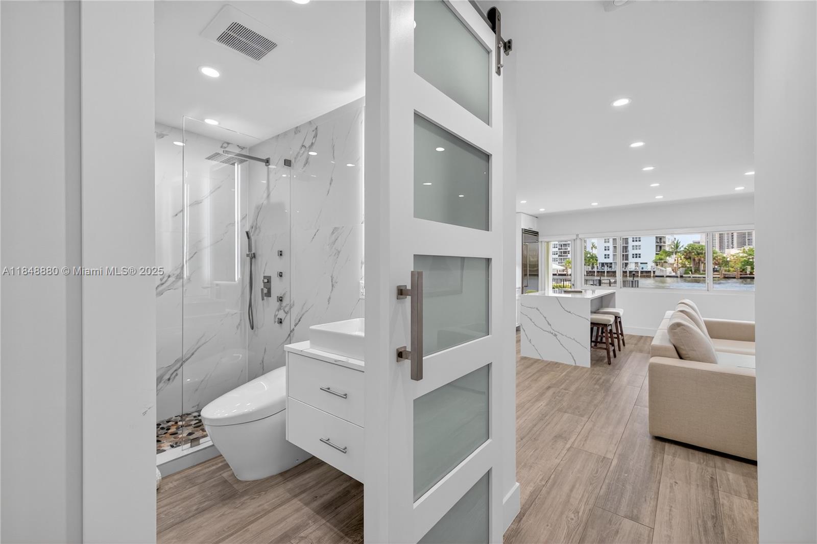 Unparalleled Intracoastal elegance. This fully reimagined 1st-floor residence boasts a rare 49’ deeded dock in a tranquil no-wake zone, complete with power, mooring whips, bumpers, and security. Meticulously curated with top-tier finishes: Viking kitchen with 36” commercial fridge, quartz surfaces, pot filler, drawer dishwasher, and touchless faucet. Spa-level bath with Toto Neorest bidet, jetted shower, and floating vanity. Smart home features include Trane 23 SEER A/C, RGF air purification, custom lighting, USB ports, wall safe, and a hidden bookshelf door. Full-size washer/dryer, tankless water heater, bespoke closets. Deeded parking/storage, heated pool, show-stopping views, pet friendly, and fully funded reserves.