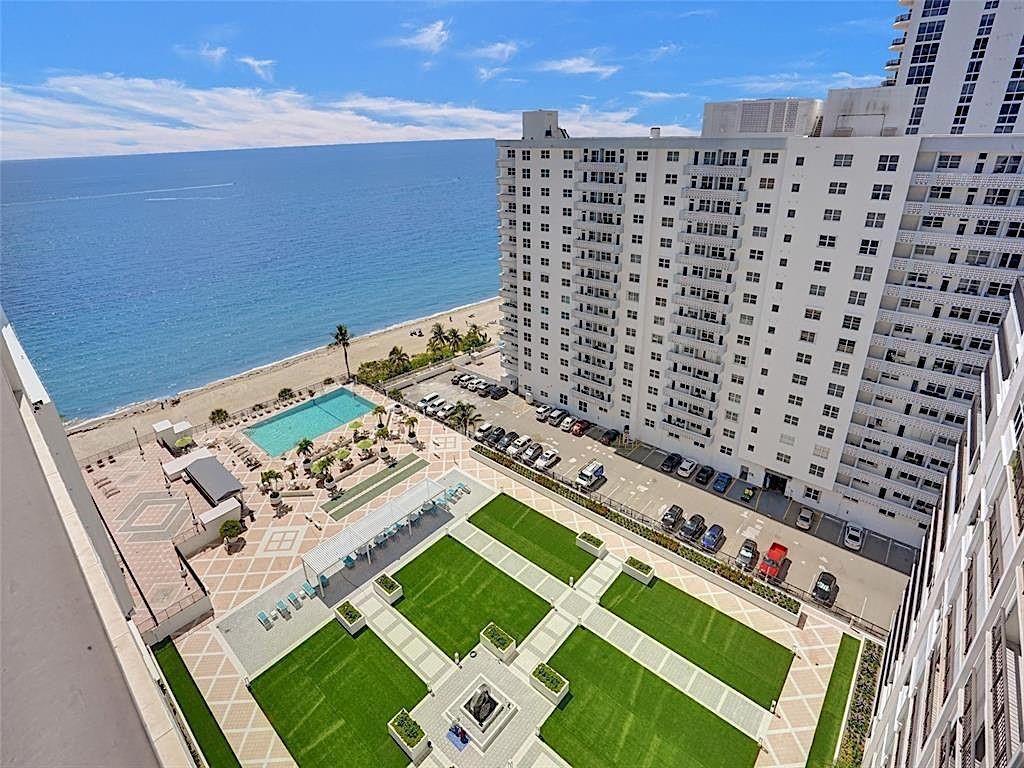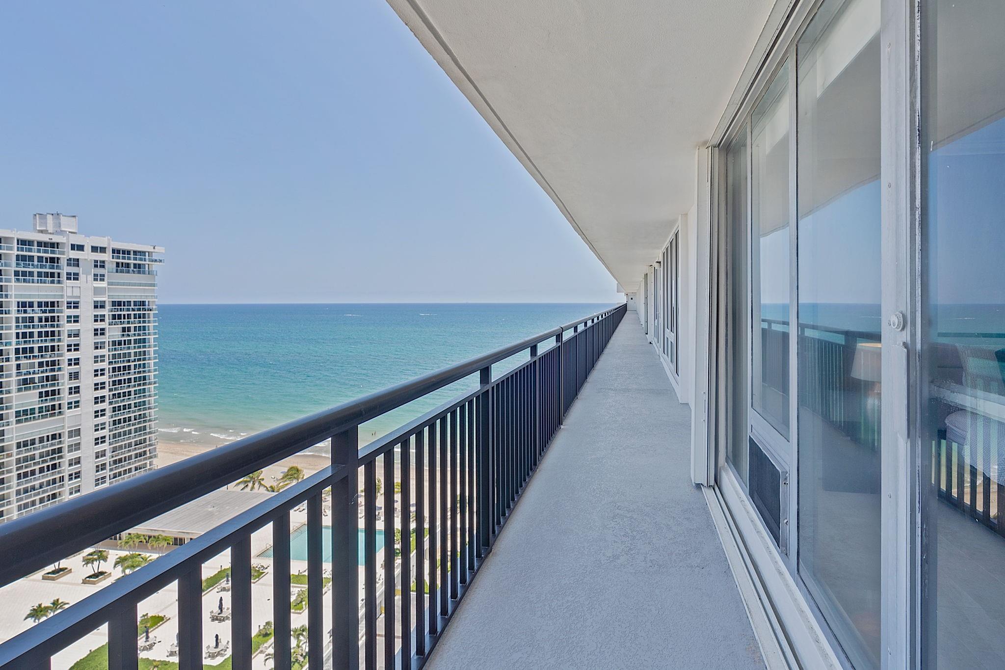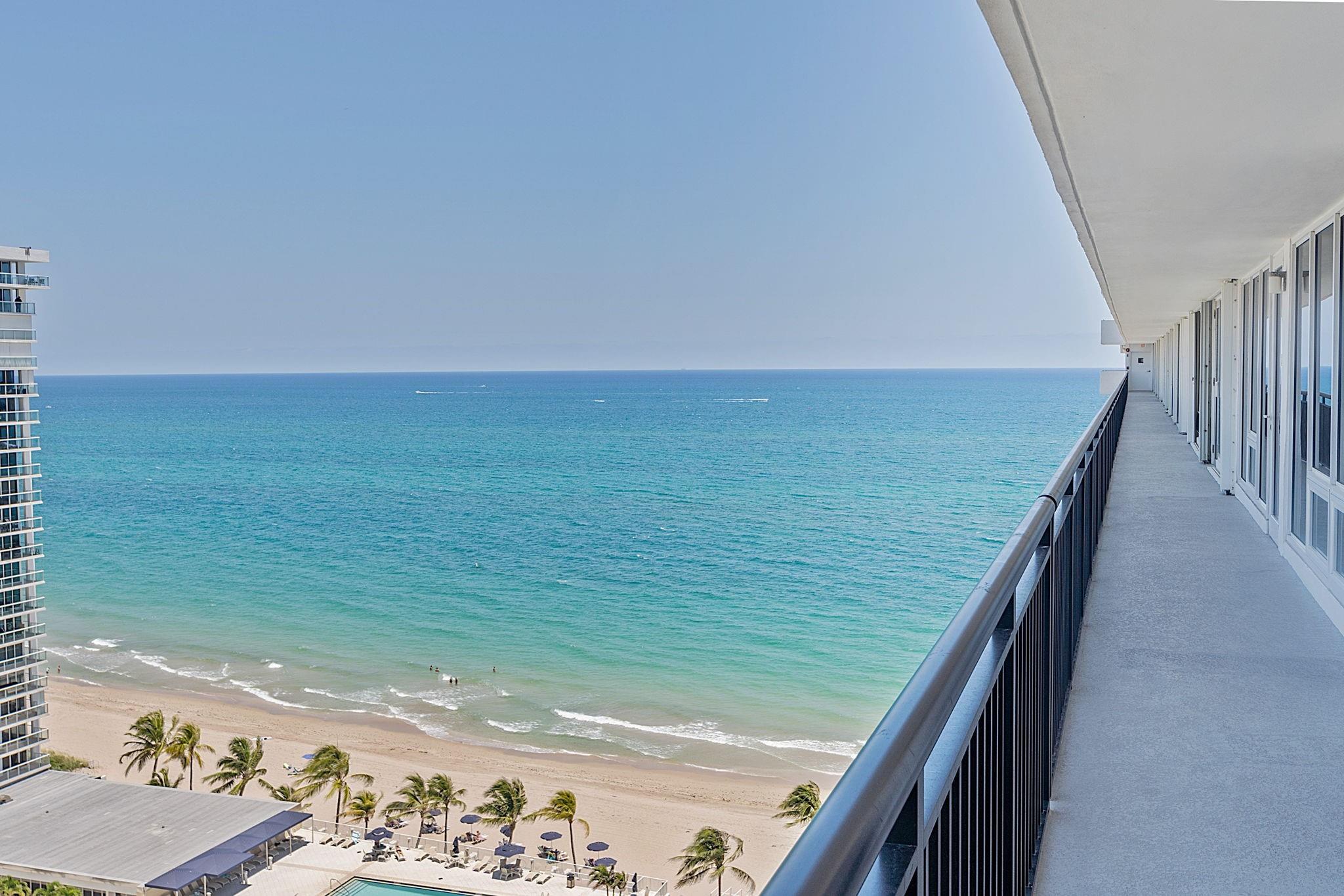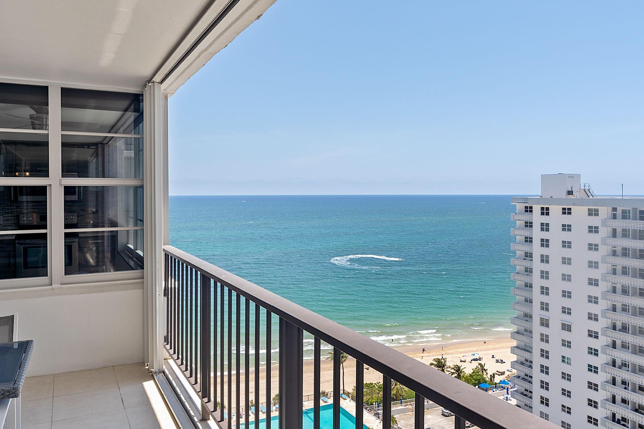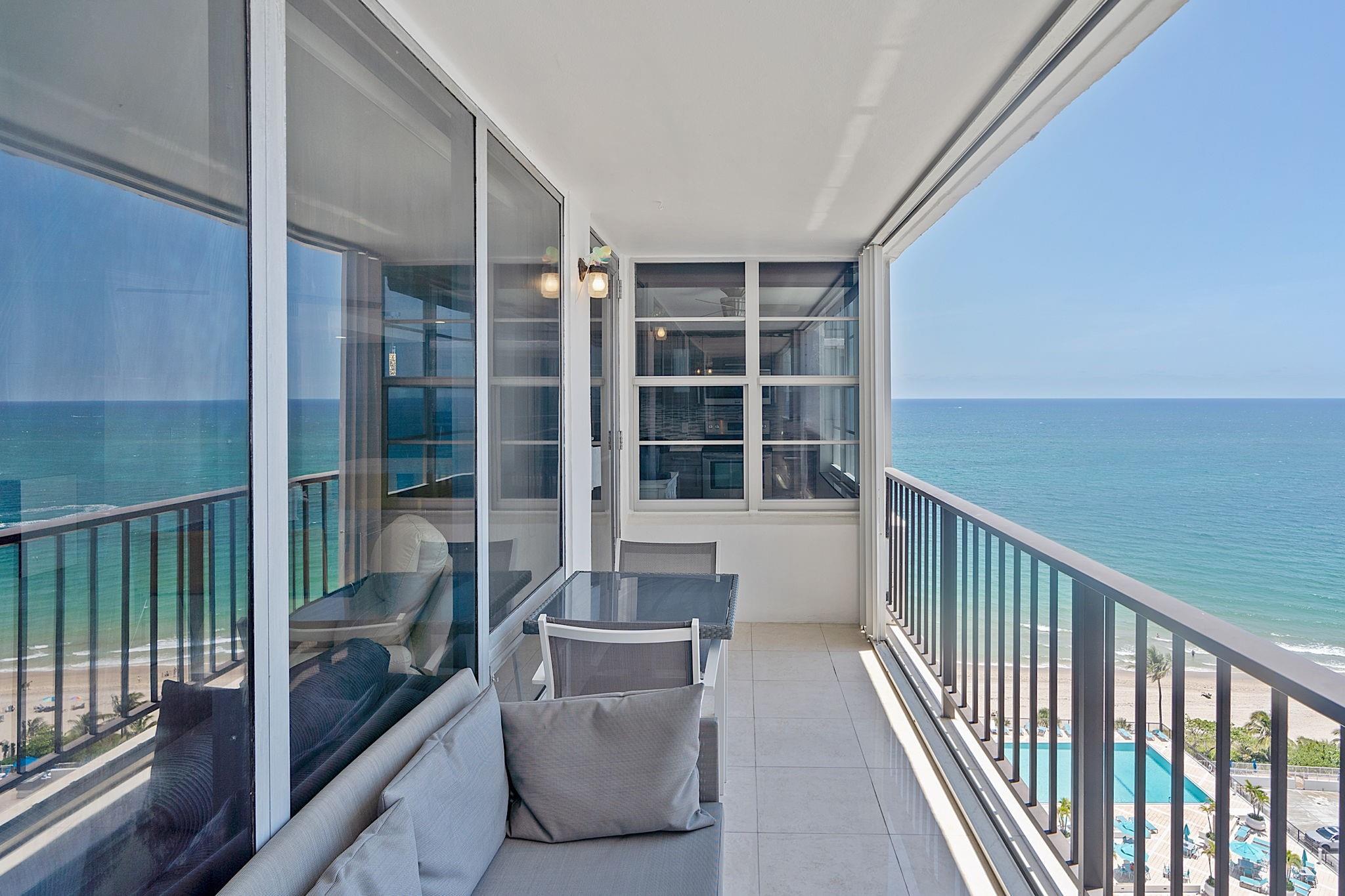 LARGEST 1-Bedroom with den on the Galt Ocean Mile! Turnkey contemporary oceanfront condo with semi-private elevator, open layout, porcelain tile, quartz breakfast bar, custom kitchen with SS appliances & wine cooler, separate laundry room, new Bosch A/C, and walk-in closets. Floor-to-ceiling windows offer stunning SE & NE ocean views from every room, including the large private balcony. Enjoy resort-style amenities featuring an infinity pool overlooking the ocean, beach patio, BBQs, ocean lounge, saunas, fitness center, billiards, library & more. Plaza South is undergoing its 40 plus 50-year certification. Seller has paid the Special Assessment in Full!