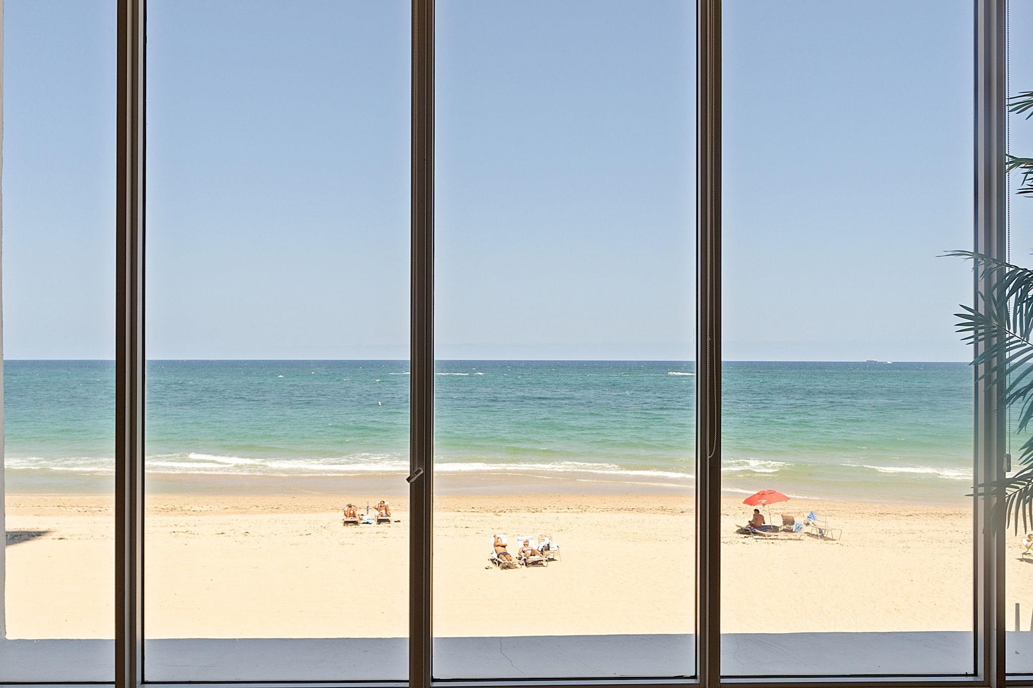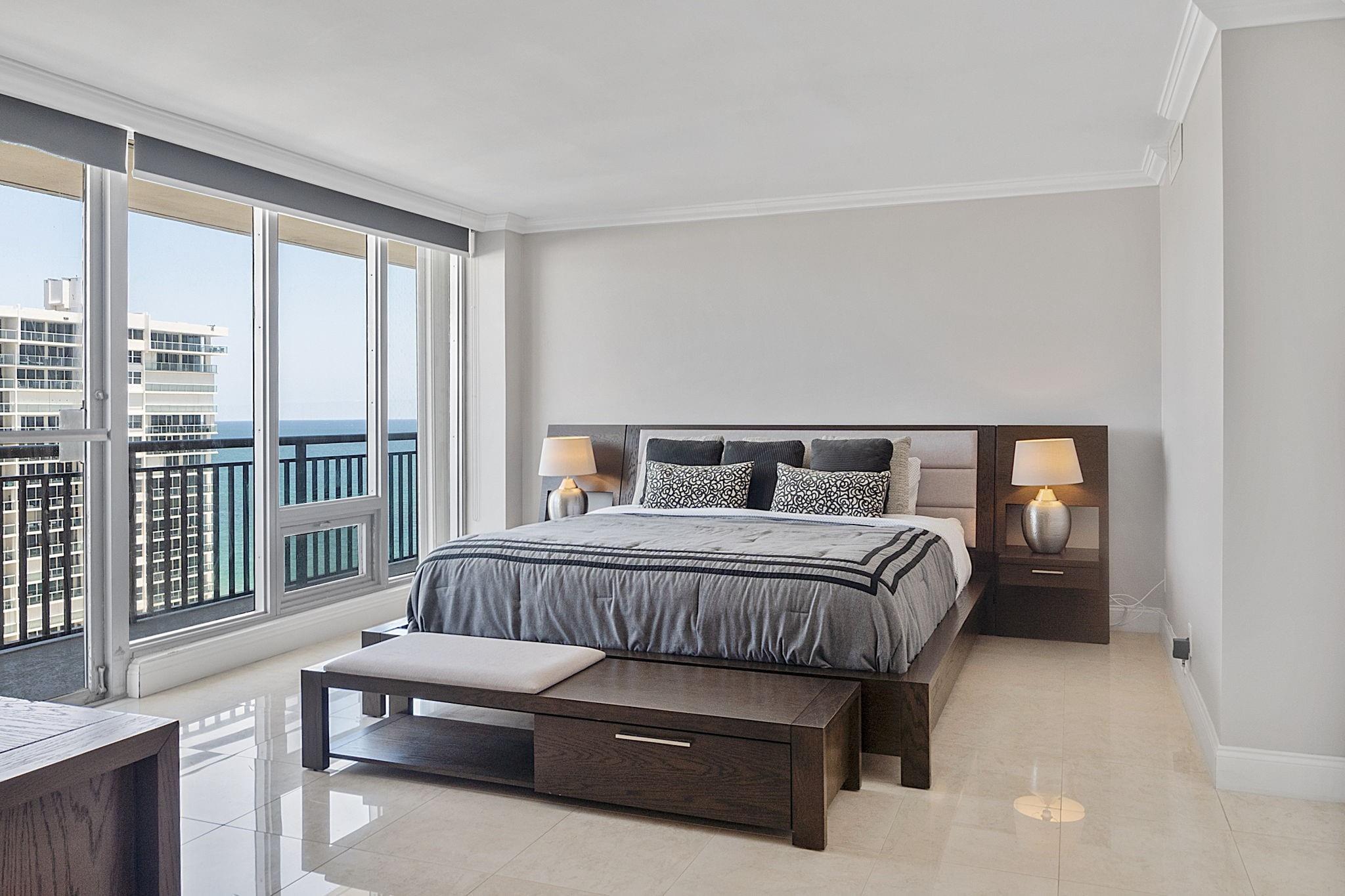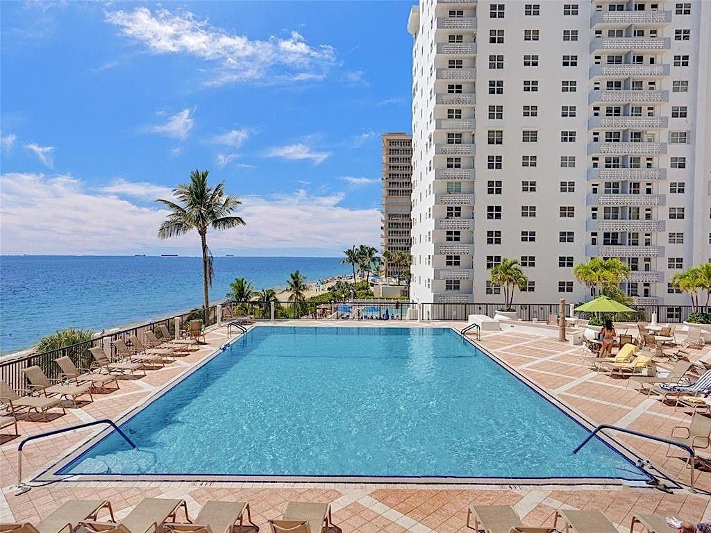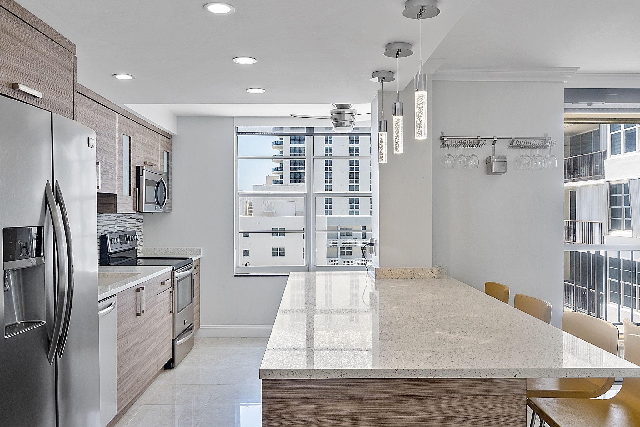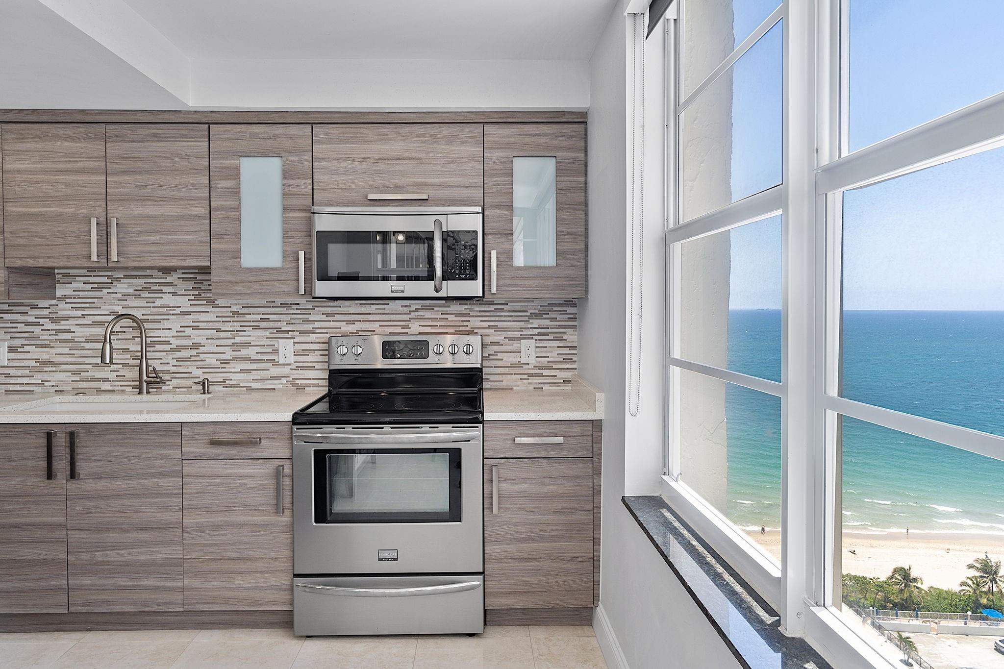 LARGEST 1-Bedroom with den on the Galt Ocean Mile! Turnkey contemporary oceanfront condo with semi-private elevator, open layout, porcelain tile, quartz breakfast bar, custom kitchen with SS appliances & wine cooler, separate laundry room, new Bosch A/C, and walk-in closets. Floor-to-ceiling windows offer stunning SE & NE ocean views from every room, including the large private balcony. Enjoy resort-style amenities featuring an infinity pool overlooking the ocean, beach patio, BBQs, ocean lounge, saunas, fitness center, billiards, library & more. Plaza South is undergoing its 40 plus 50-year certification. Seller has paid the Special Assessment in Full!