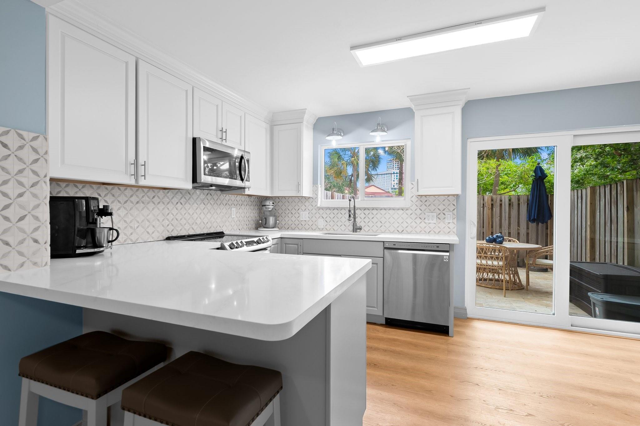 FEE SIMPLE 2-bed/1.5-bath townhouse located in the heart of Downtown Fort Lauderdale! Features include: IMPACT WINDOWS & DOORS, fully open & updated kitchen with quartz countertops & SS appliances, new vinyl flooring upstairs, tile downstairs, laundry room, plantation shutters & private front and back travertine patios. 2018 HVAC. 2013 roof (HOA covered). City View is a gated 18-acre community bordering Flagler Village and the Brightline station, just a short walk to The Riverwalk, Las Olas Blvd & Himmarshee. Enjoy a heated pool, tennis courts, pet-friendly living, and a neighborhood surrounded by exciting new development. HOA has reserves & a low monthly fee covering the roof, exterior insurance, fences & landscaping. FHA, VA, and 3% down conventional loans welcome!